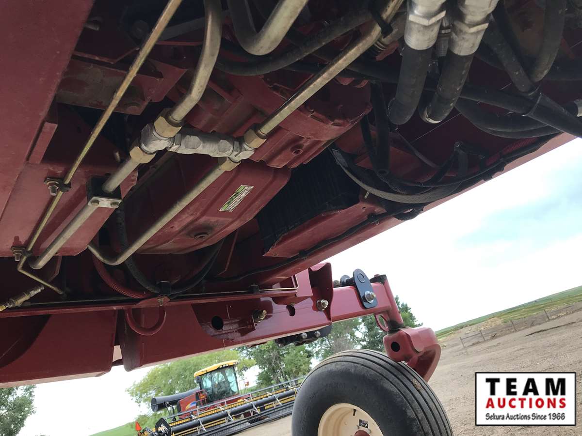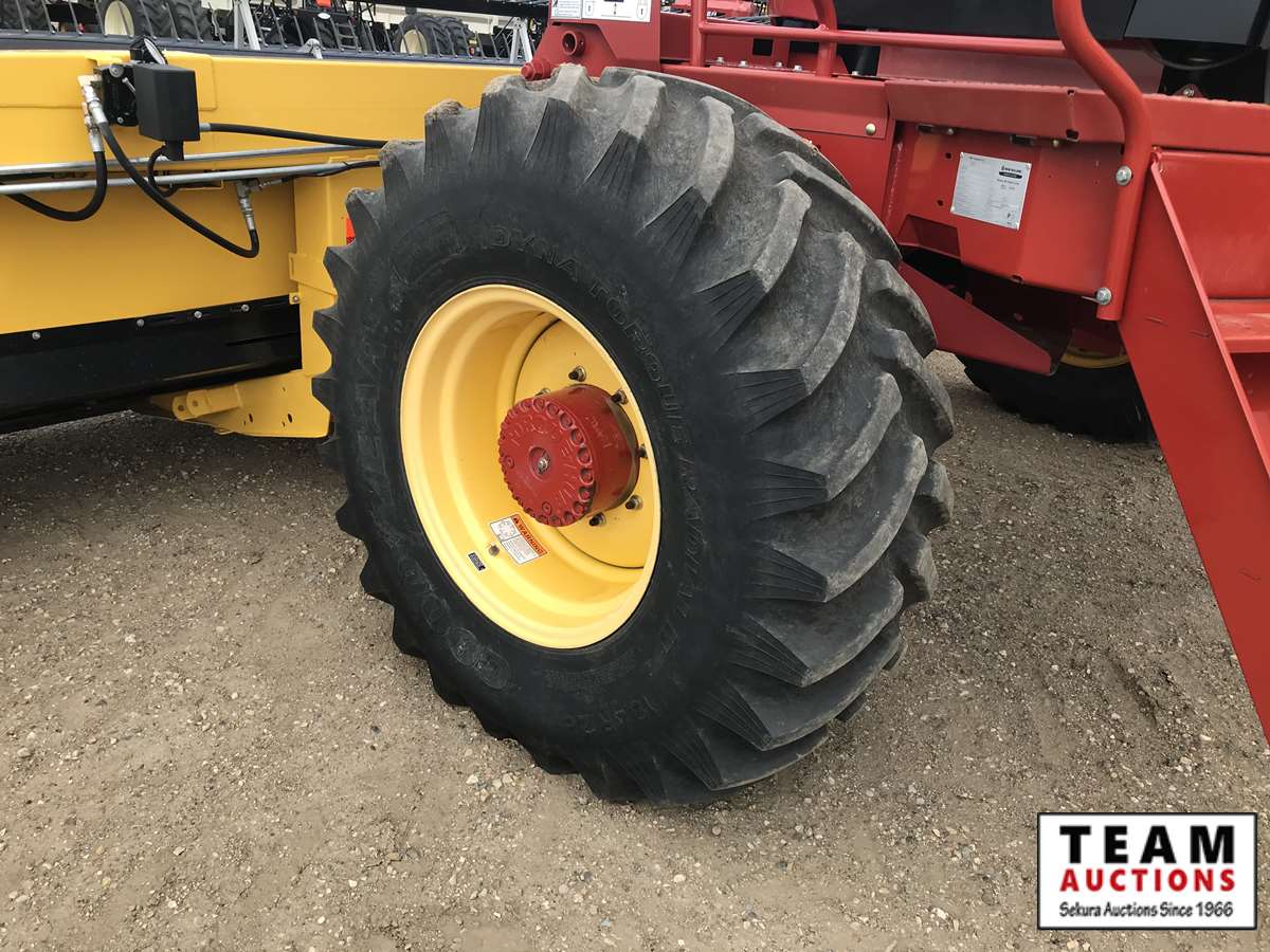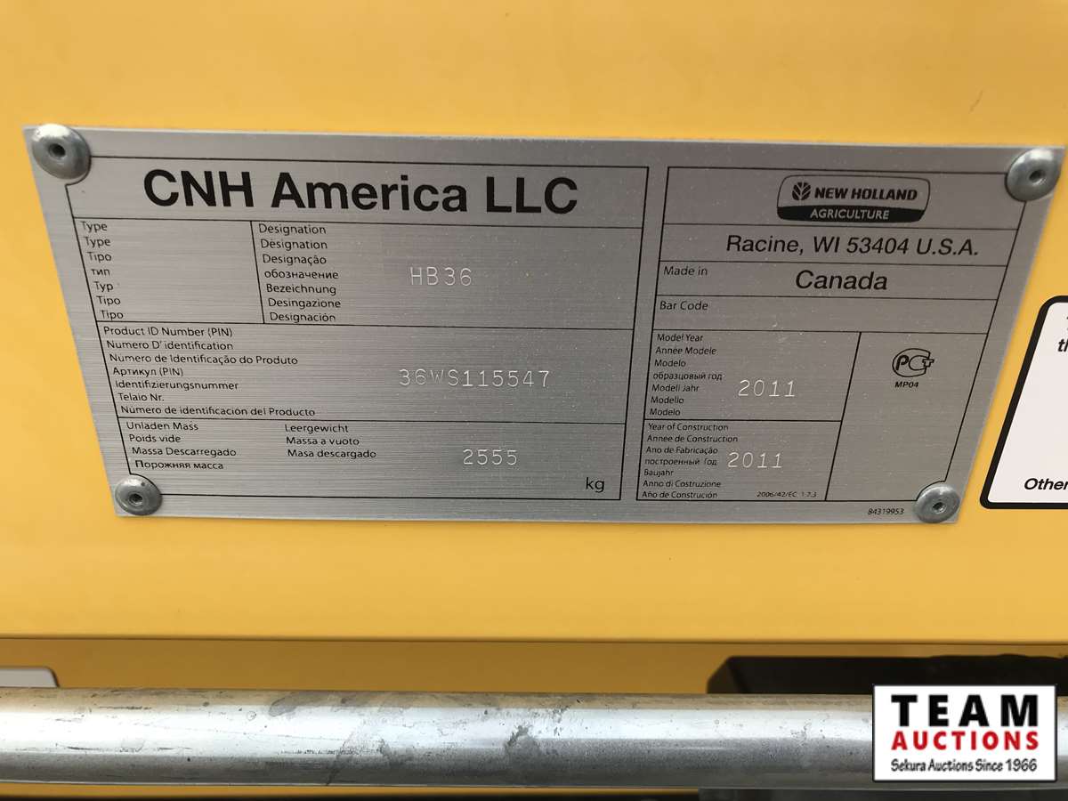 HB36 header, s/n 36WS115547, cross auger, p/u reel, hydraulic fore/aft, dbl knife drive, tapered poly swath roller, 18.4R26 F, 14L-16.1SL R, 357 hrs