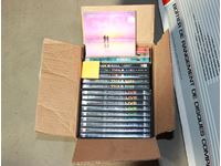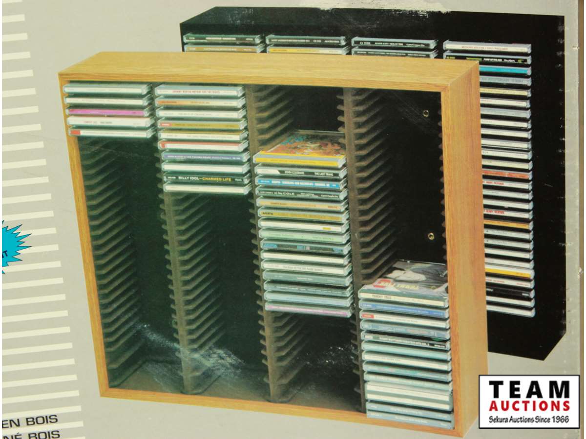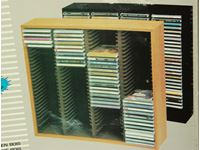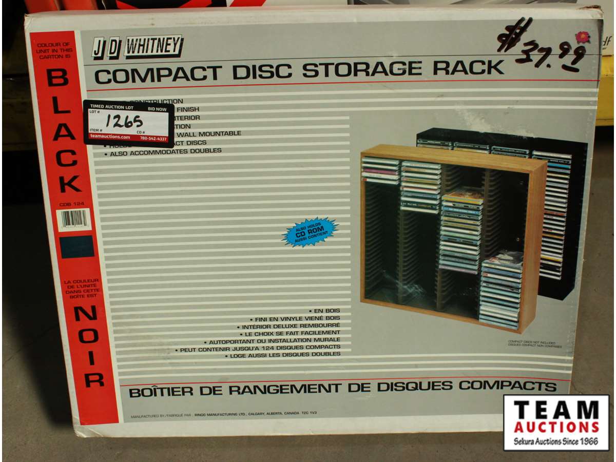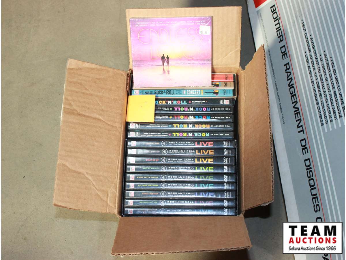 (1) CD storage rack holds 124 discs, (1) box w/ 1 Cd & 17 DVD's