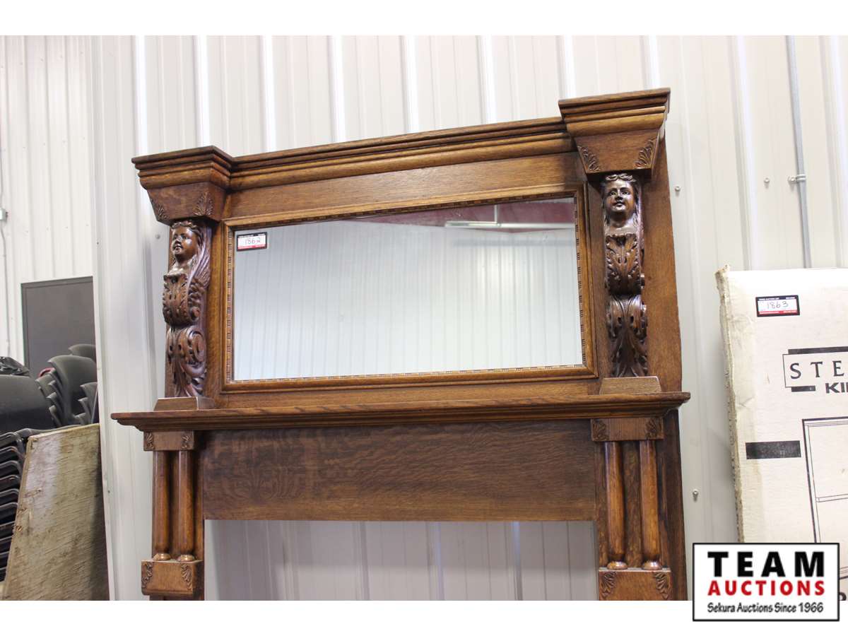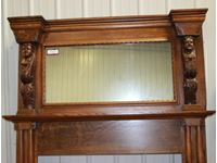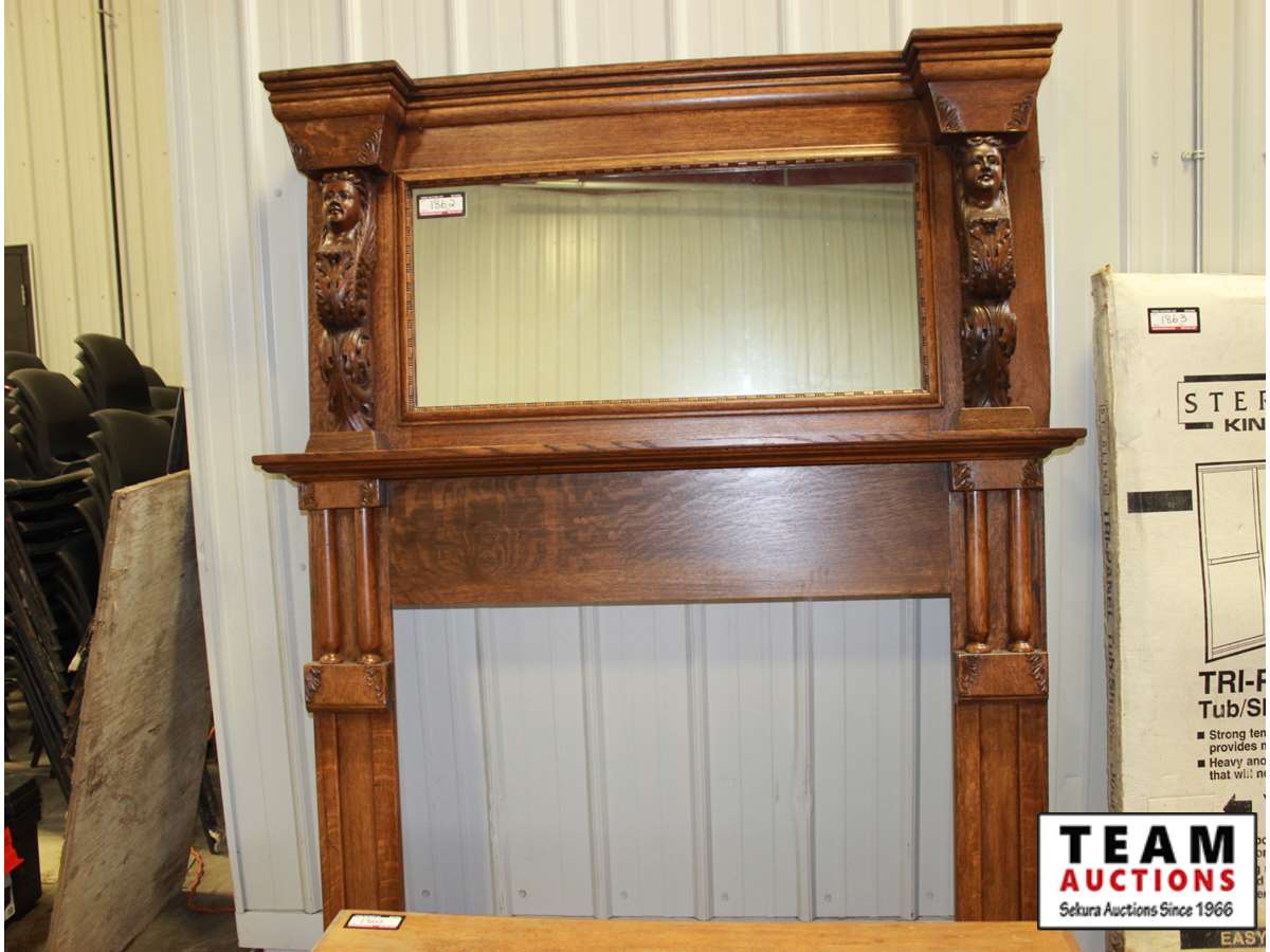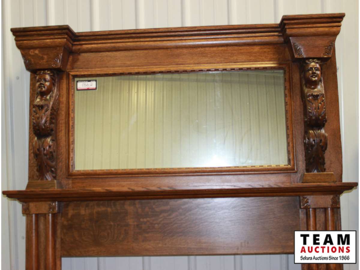 wood ornate fireplace mantel w/mirror & wooden coffee table