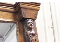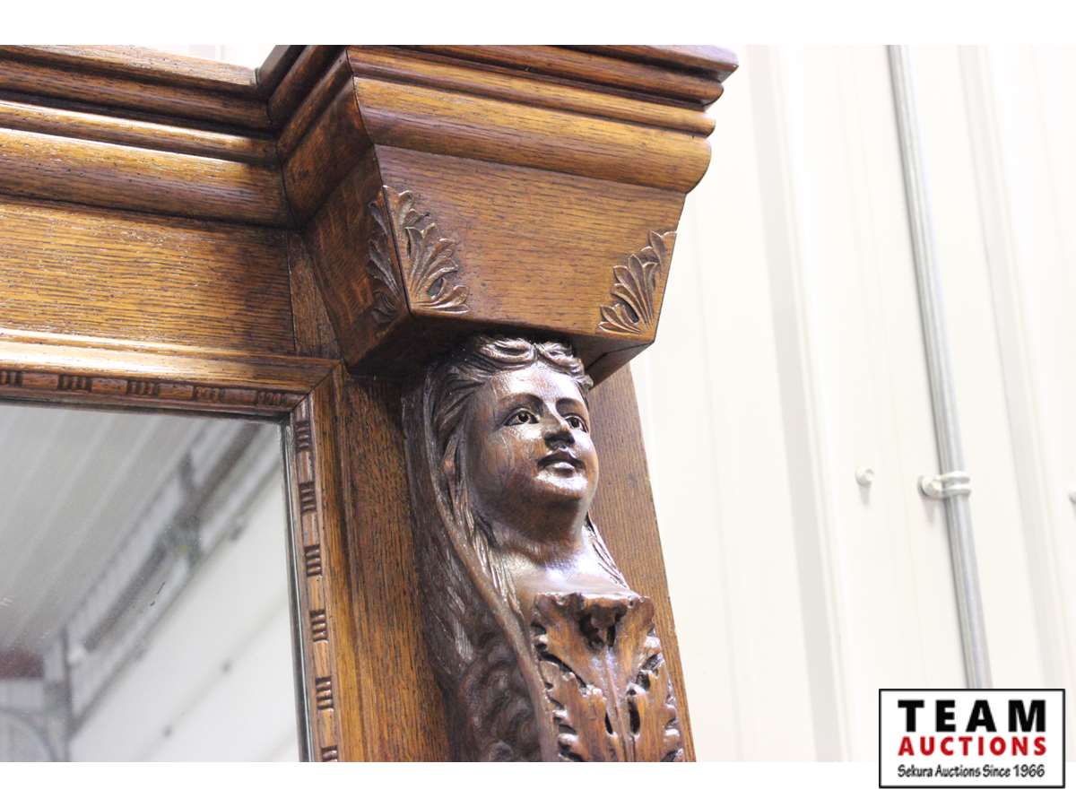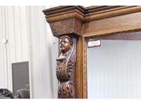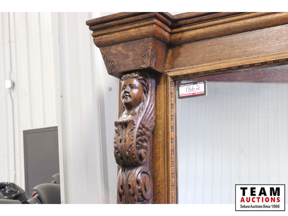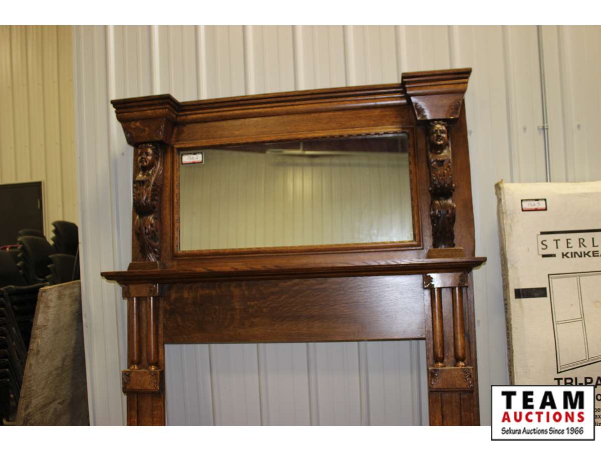 wood ornate fireplace mantel w/mirror & wooden coffee table