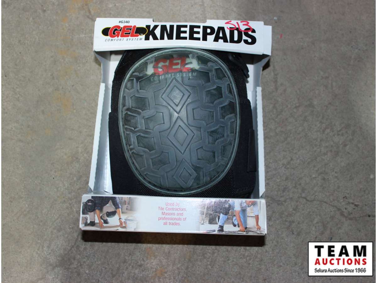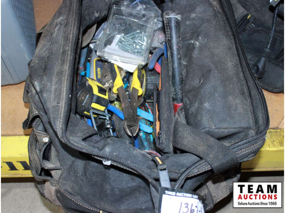black tool bag w/various tools, tape measure, screws, hammer, pliers, cutters, screwdrivers, knee pads