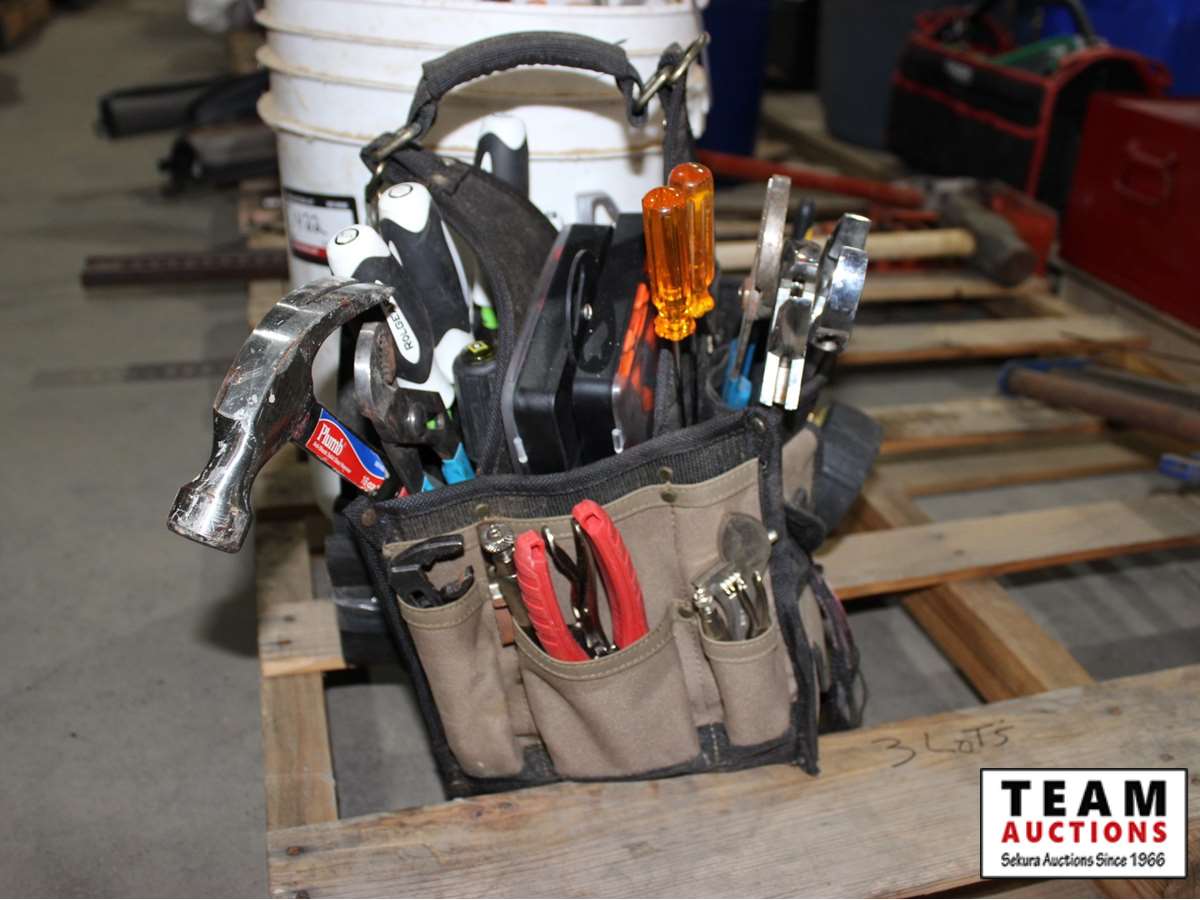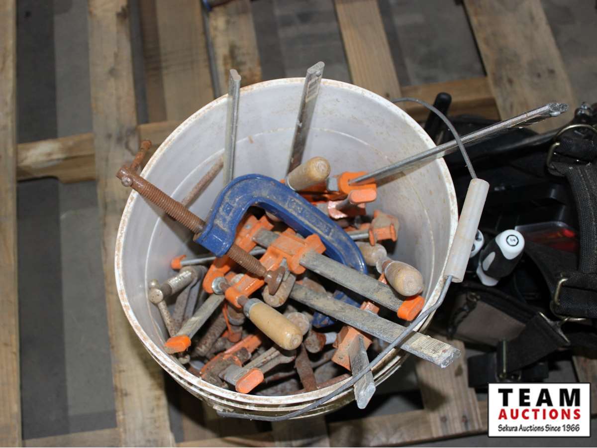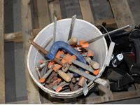 (1) tool bag black w/ Darius hammer, screwdrivers, crescent wrenches, pliers vice grips, tape measure, level part, (1) white bucket w/various clamps