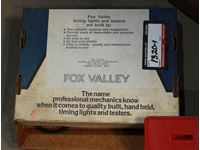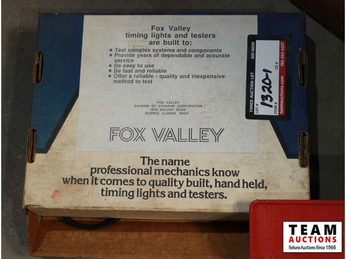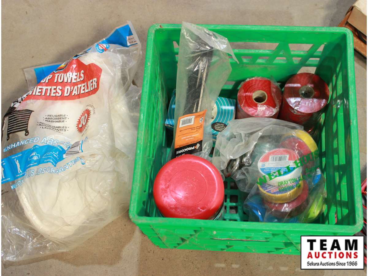 Green Milk Crate with shop towels, PVC insulating tape, rolls of tape, paint stick, markers, tie wraps, waterless cleaning wipes, red Proto case with drill bits, Fox Valley timing lights and testers