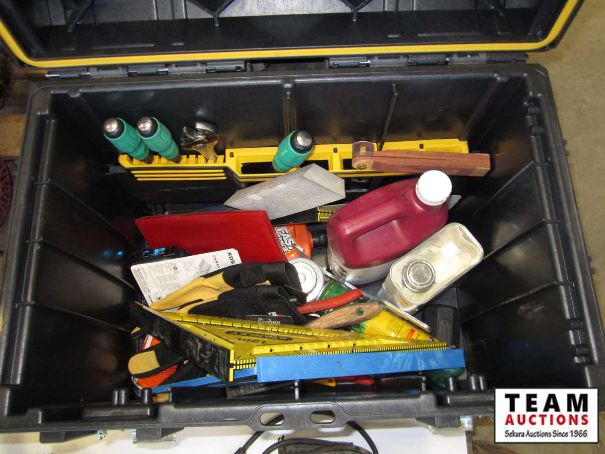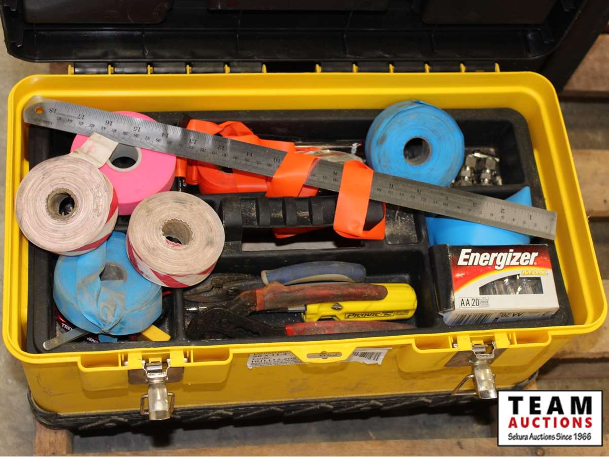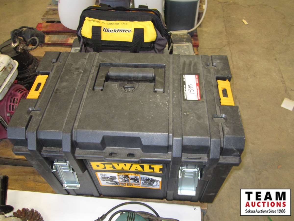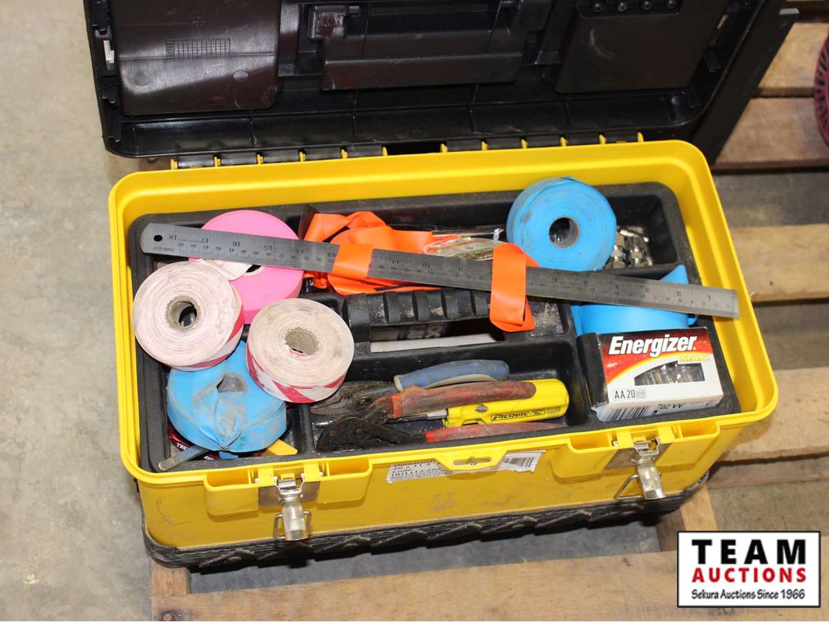 black DeWalt toolbox including measuring devices, glue, tape, Allen Keys, Workforce tool bag w/multiple jars of connectors, electrical tools, yellow & black tool box w/various roles of tape, large rubber mallet, batteries