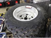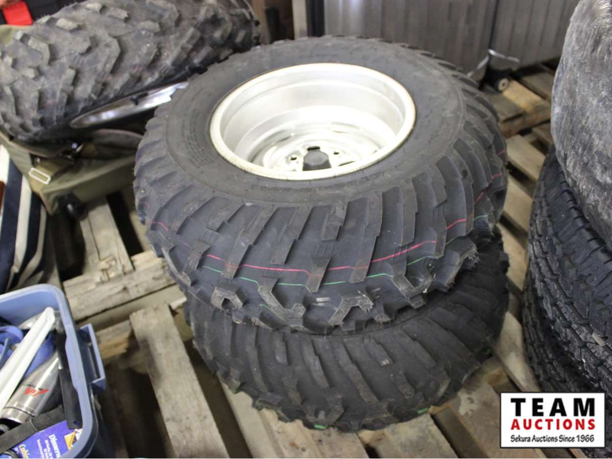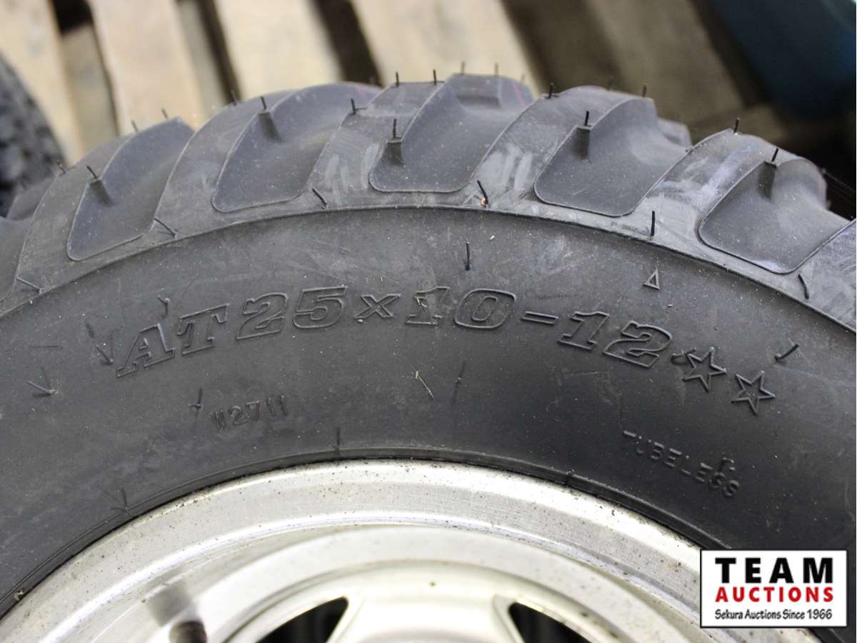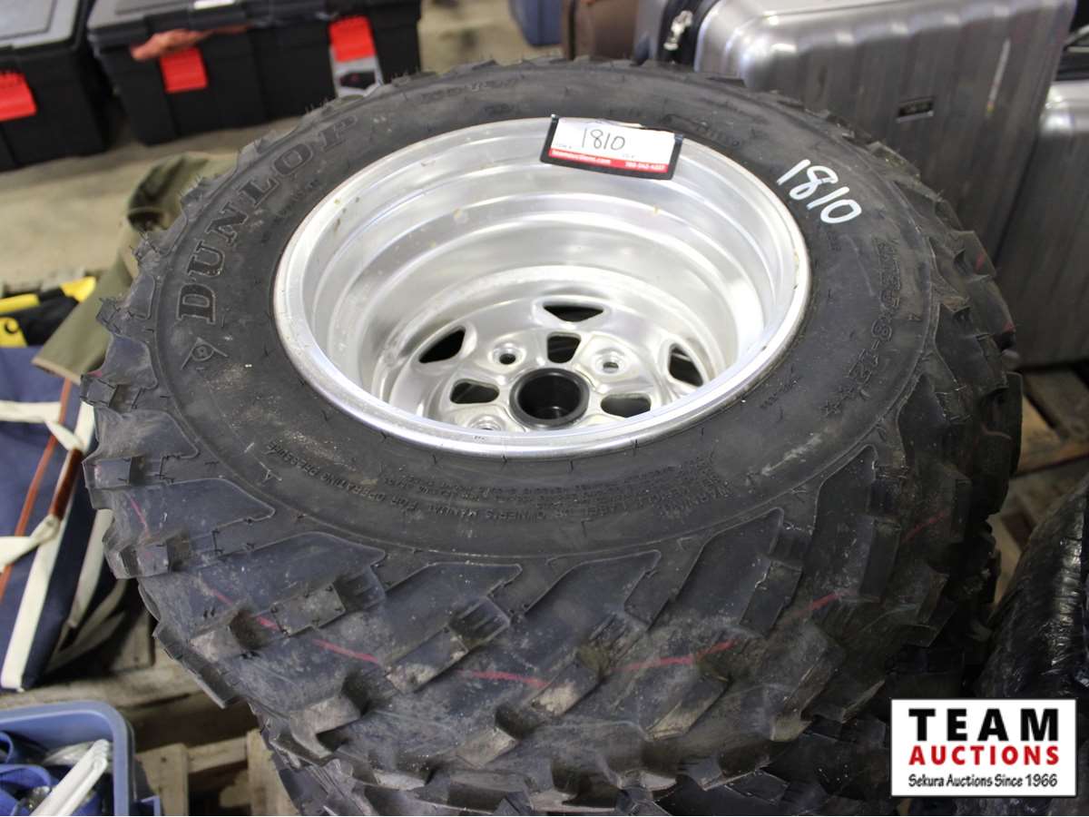 (1) misc Firestone, (2) Dunlop w/rims 25x8-12, (2) Dunlop 25x10-12