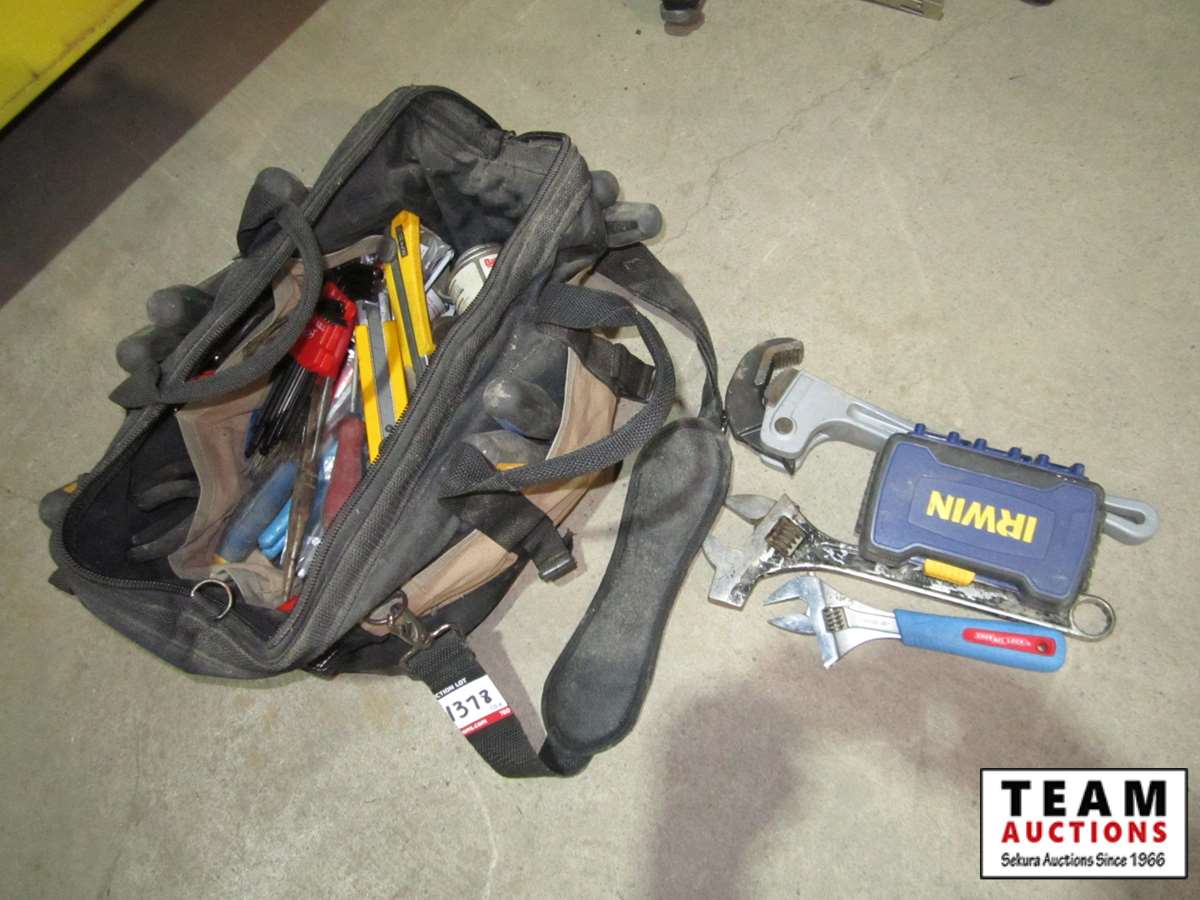 various tools, pipe wrench, crescent wrench, box cutter, Allen keys, screwdrivers, pipe joint compound, pliers and more