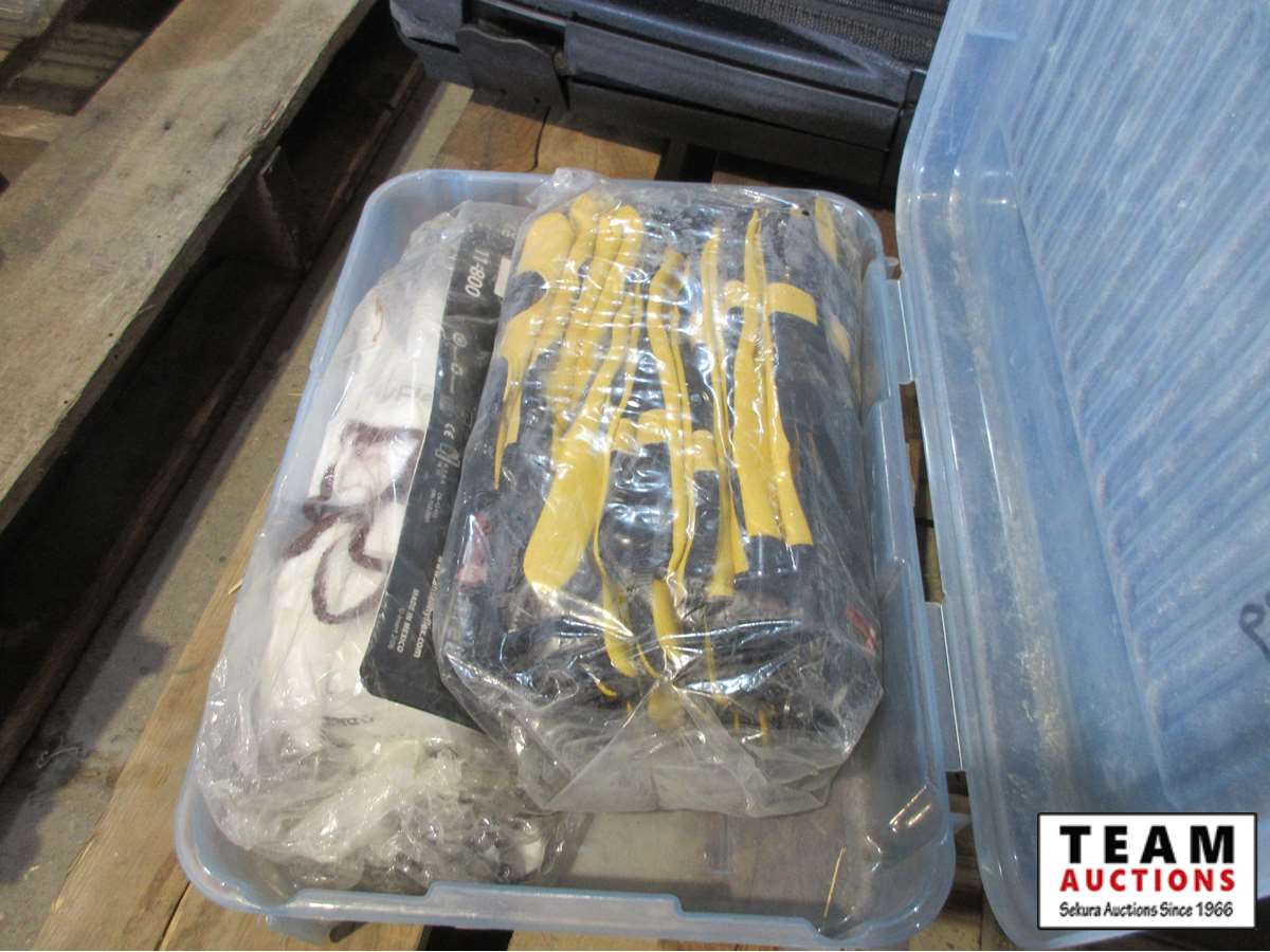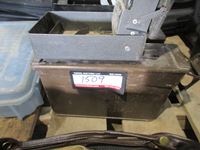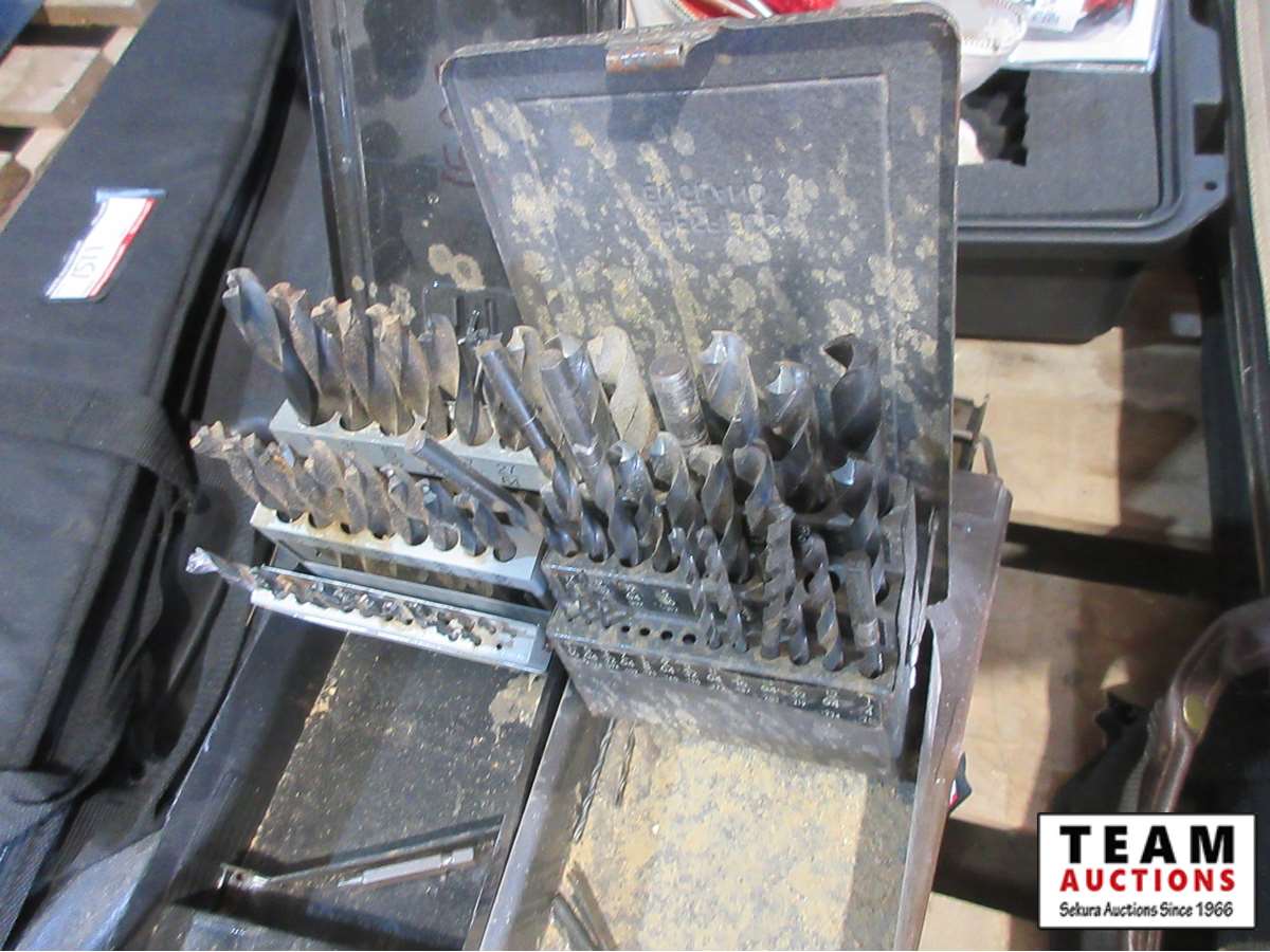 gloves, (3) small metal boxes, drill bits