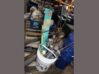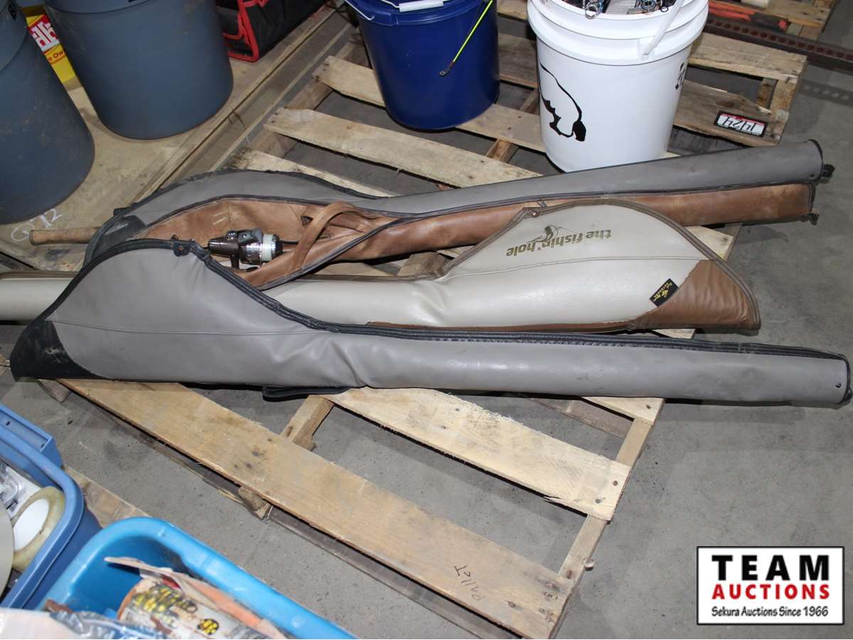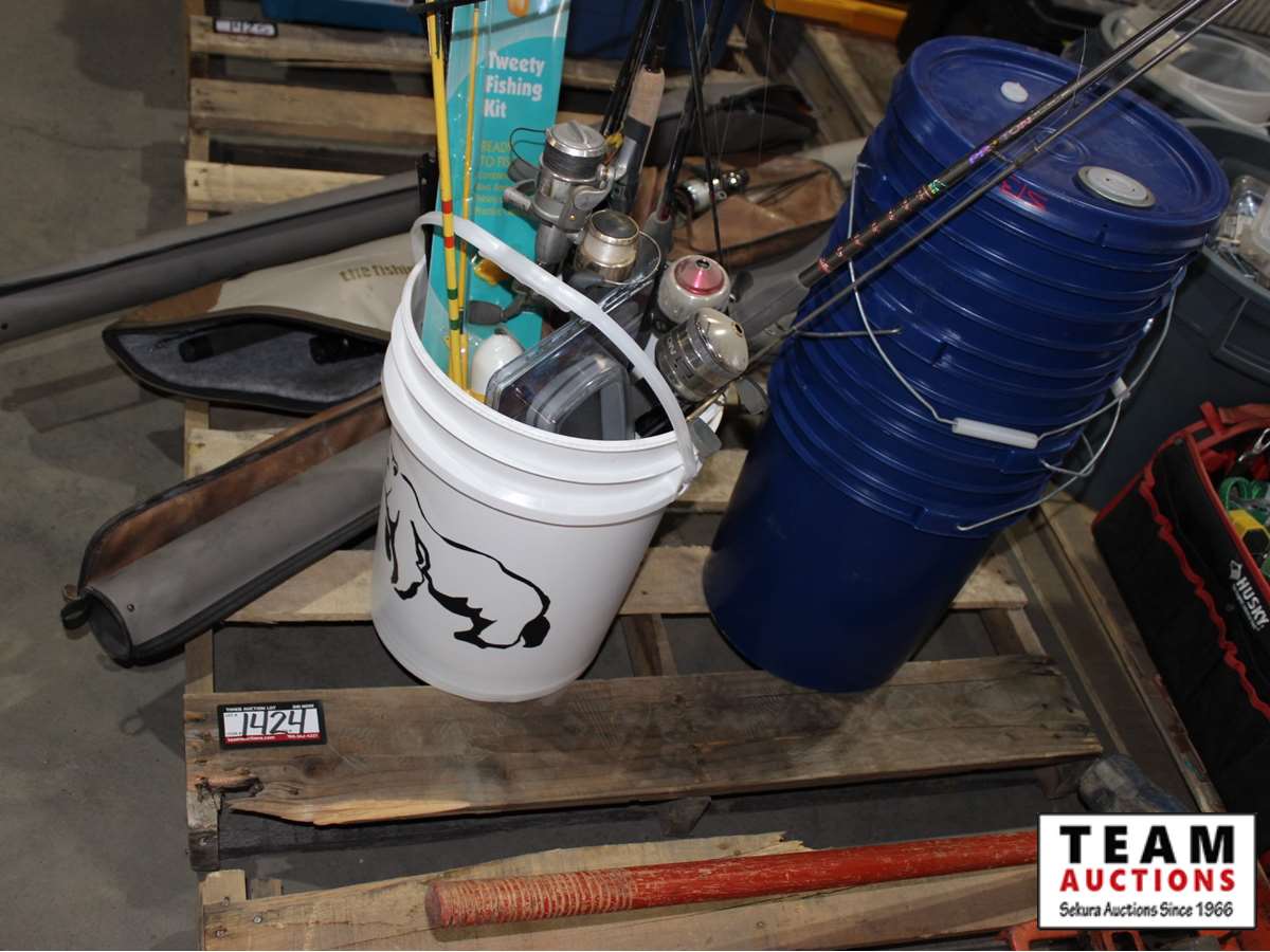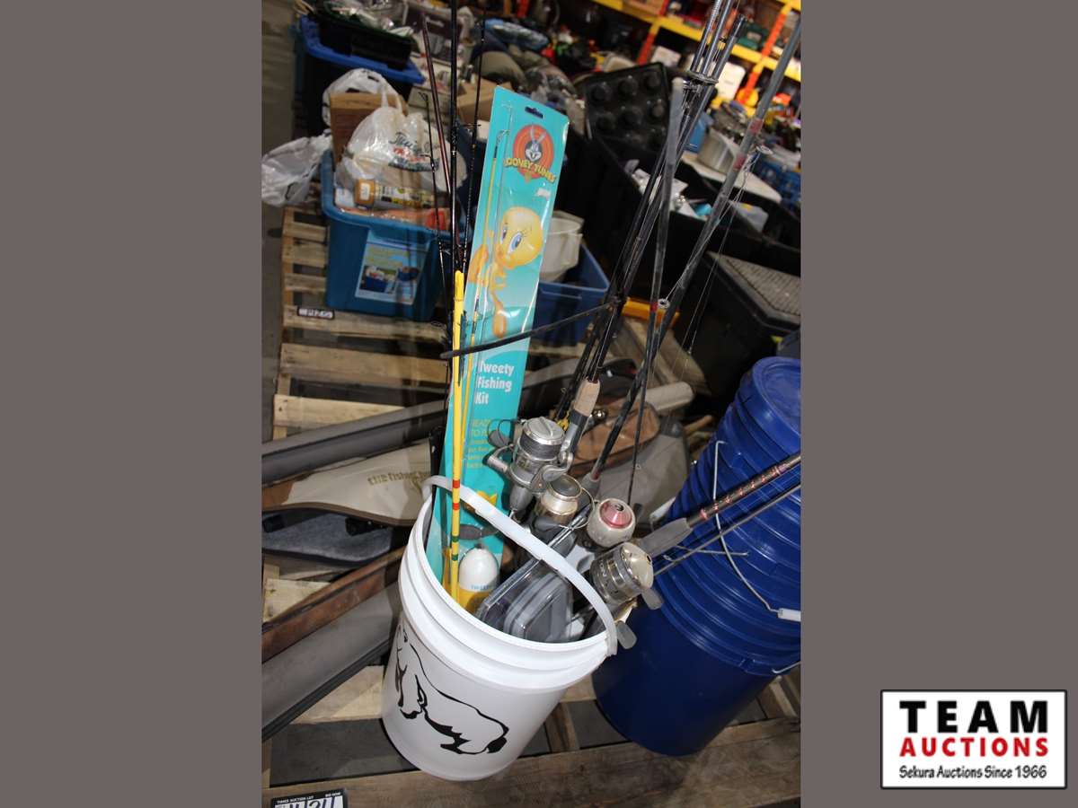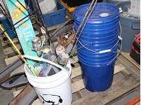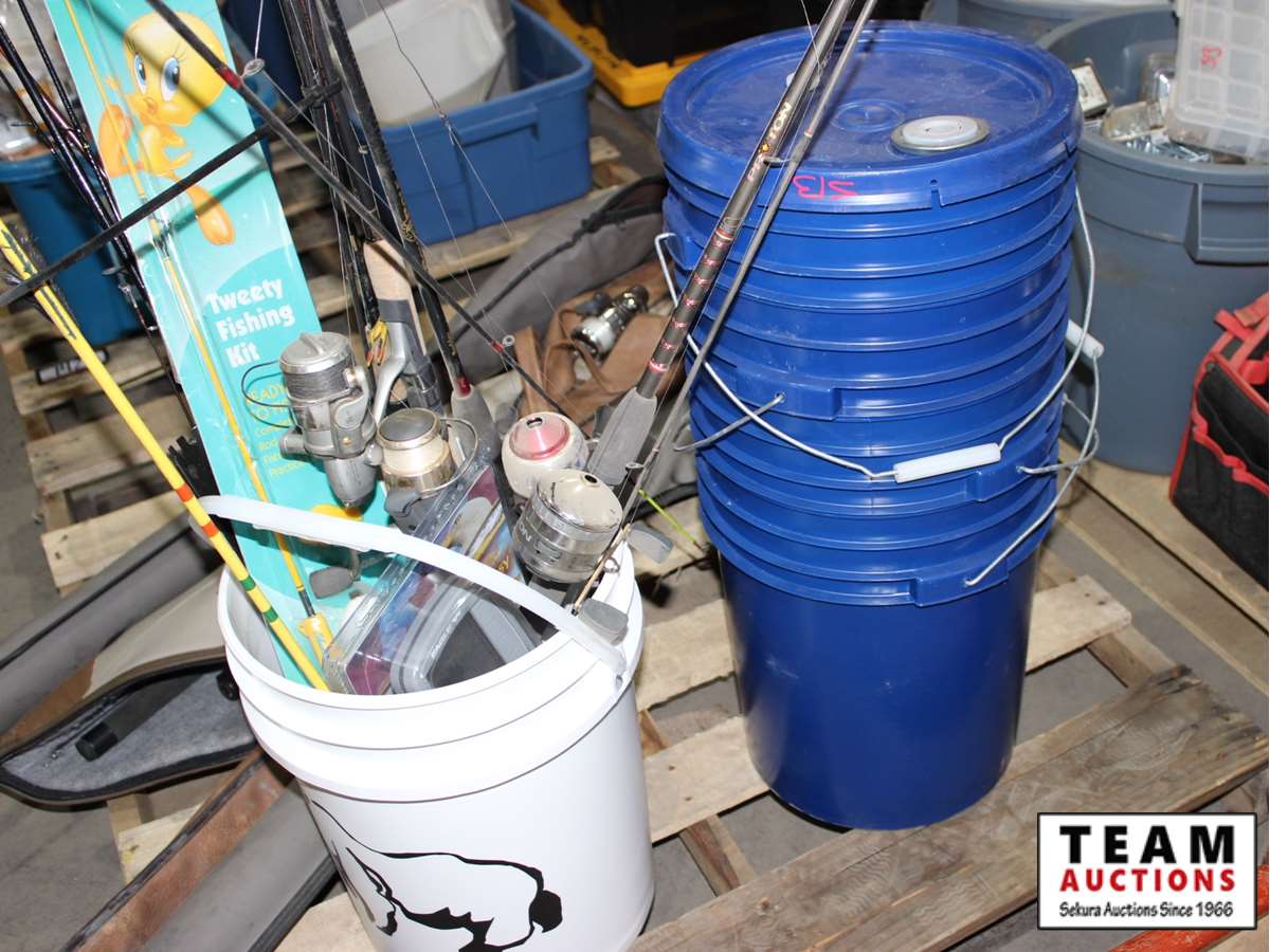 fishing poles, fishing accessories, multiple blue buckets, white bucket with fishing poles, 4 cases with fishing poles