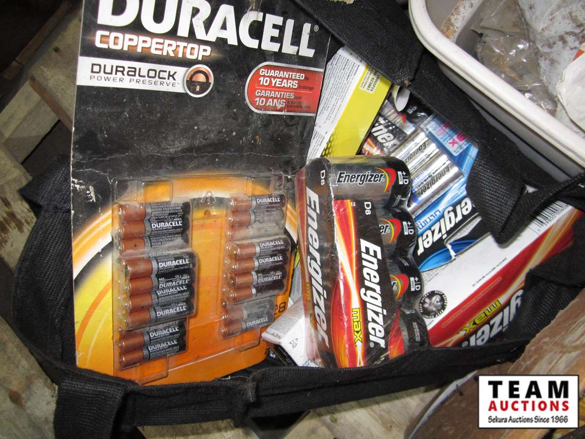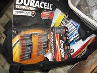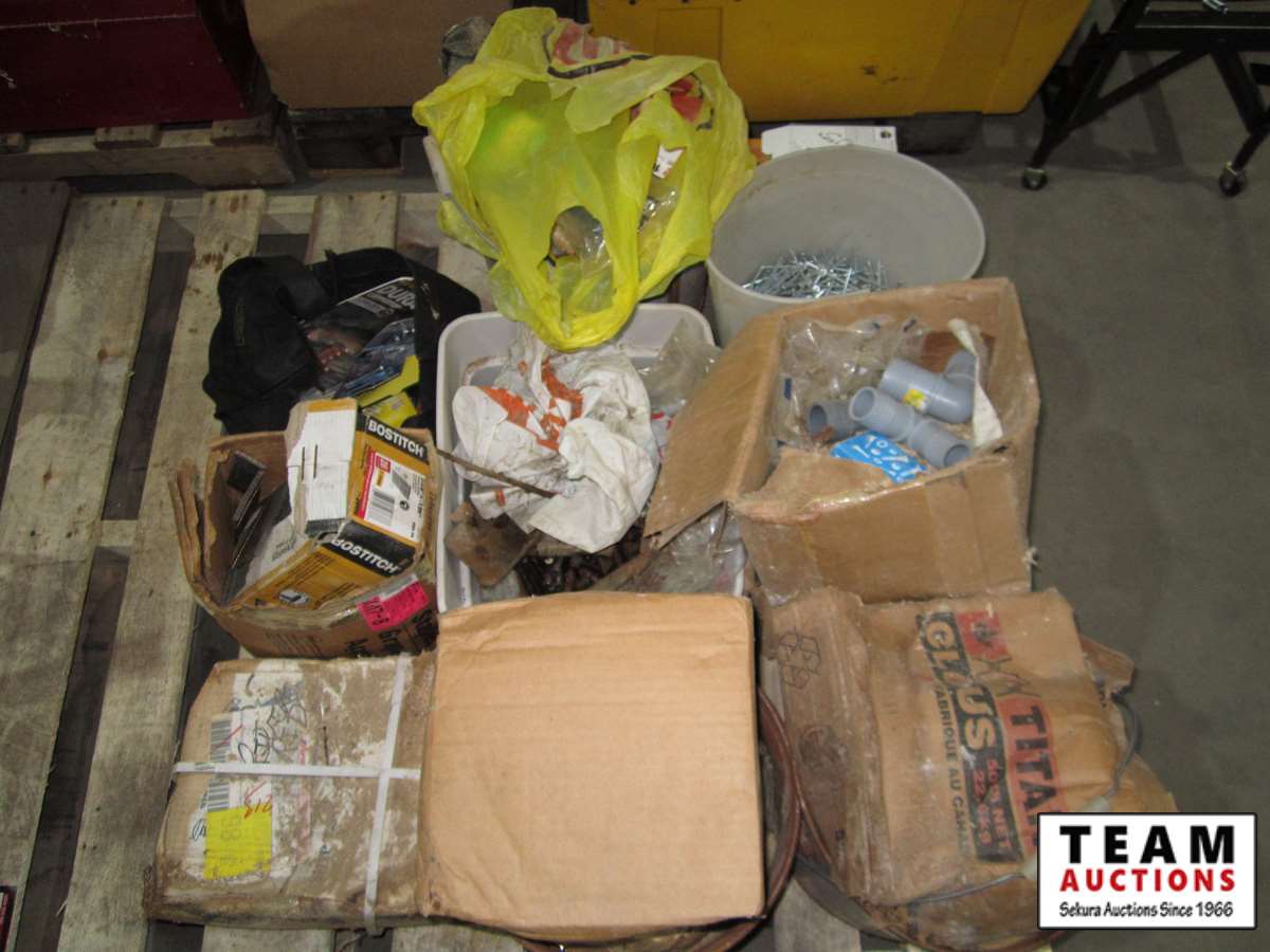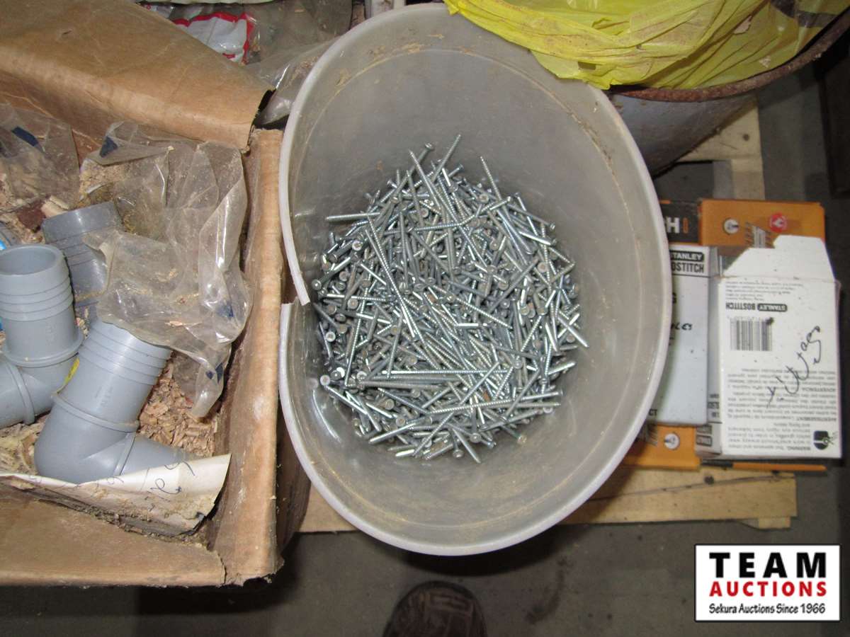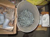 long wood screws, misc screws & nails, grey pipe fittings, elbows misc bolts, T-Rex tape, electrical boxes, various packages of batteries various sizes