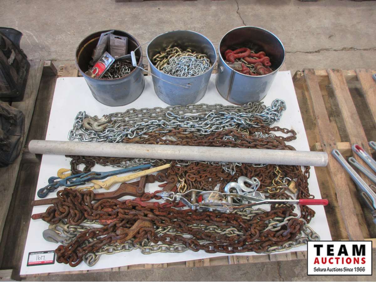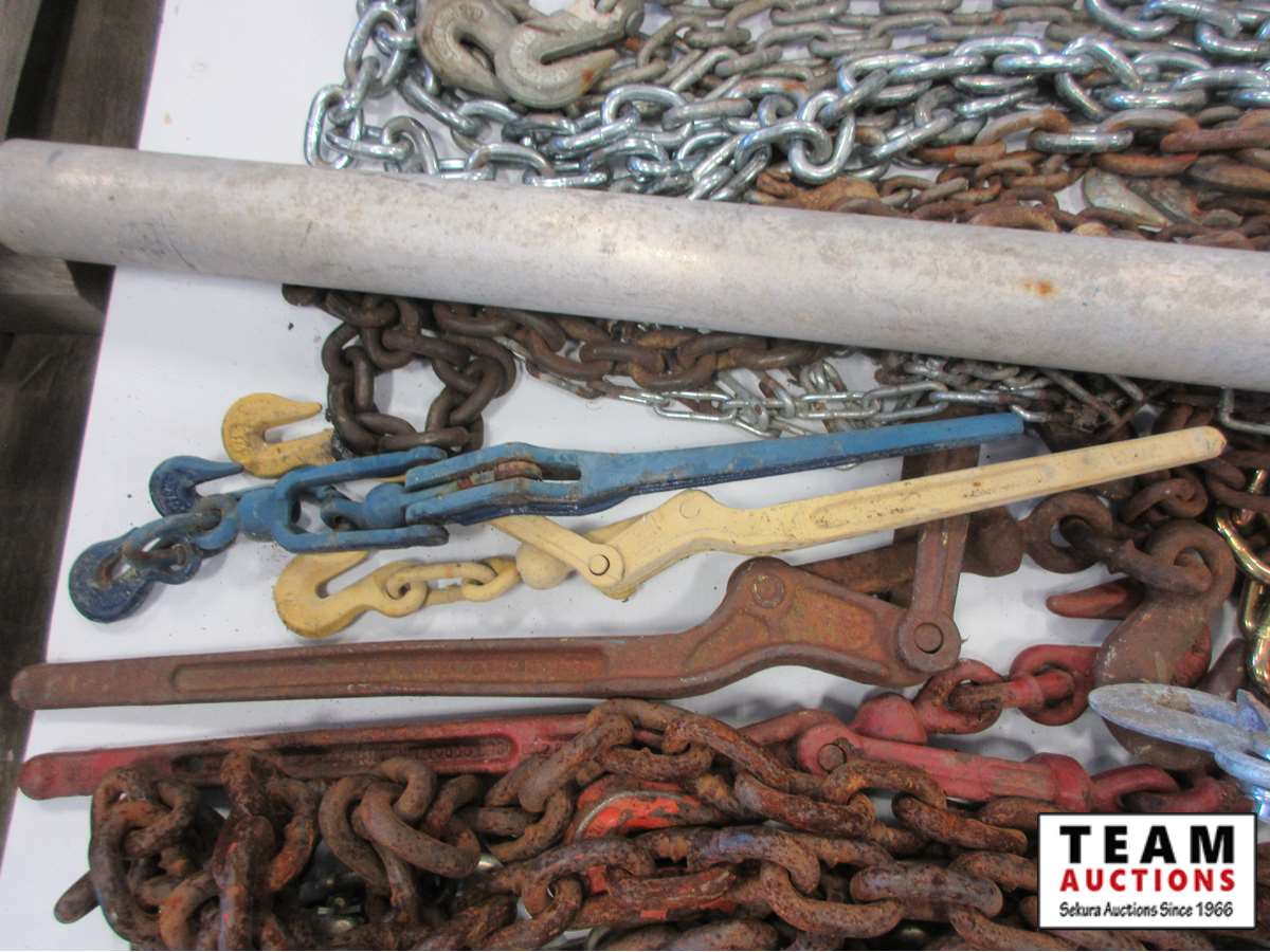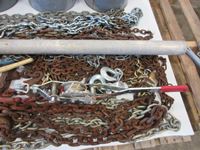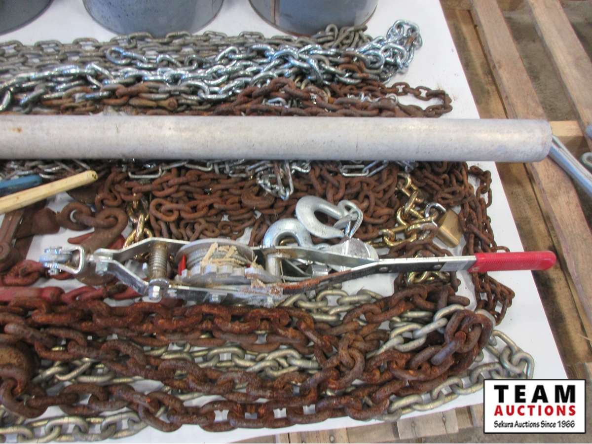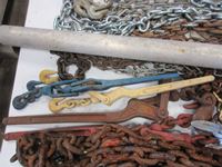 assortment of chains, boomers, cable come-a-long, transport chain, shackles