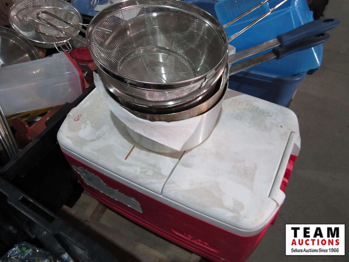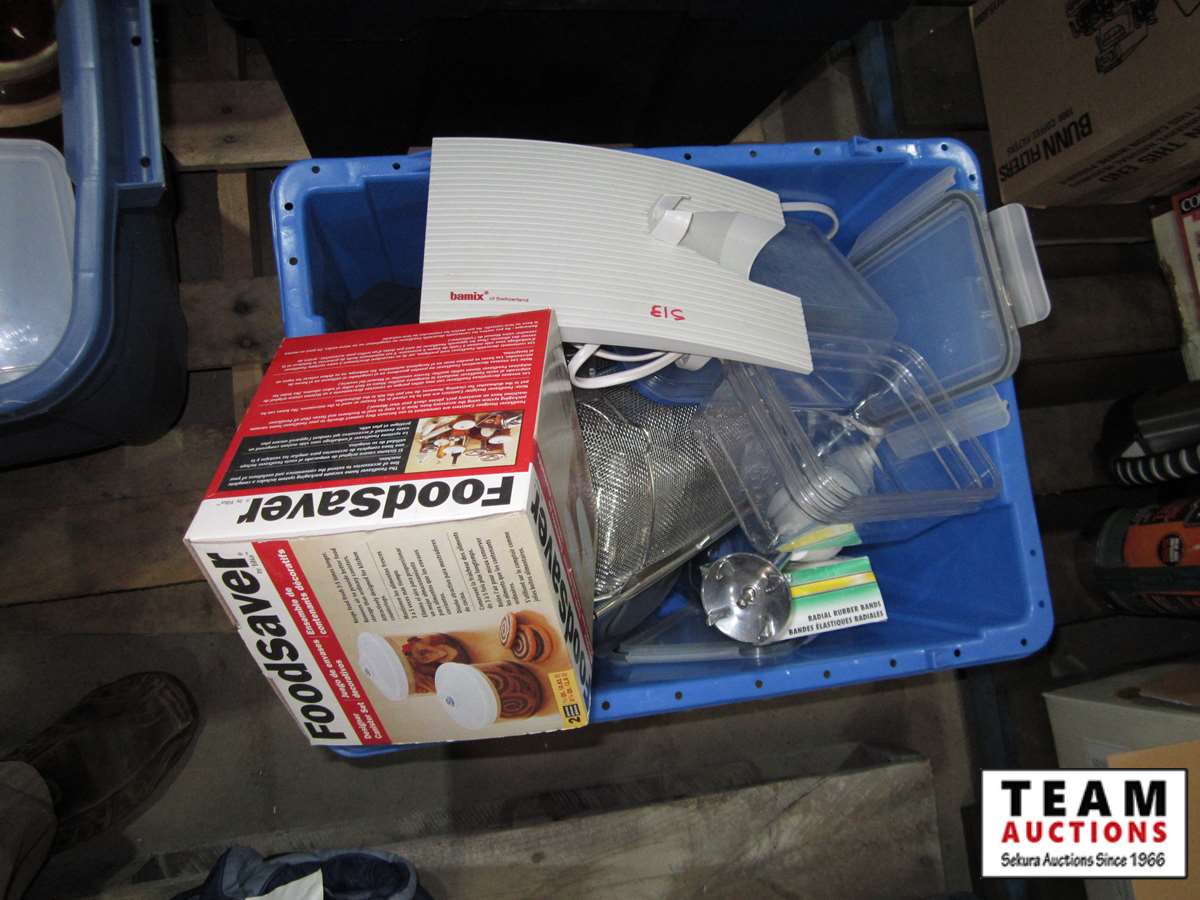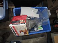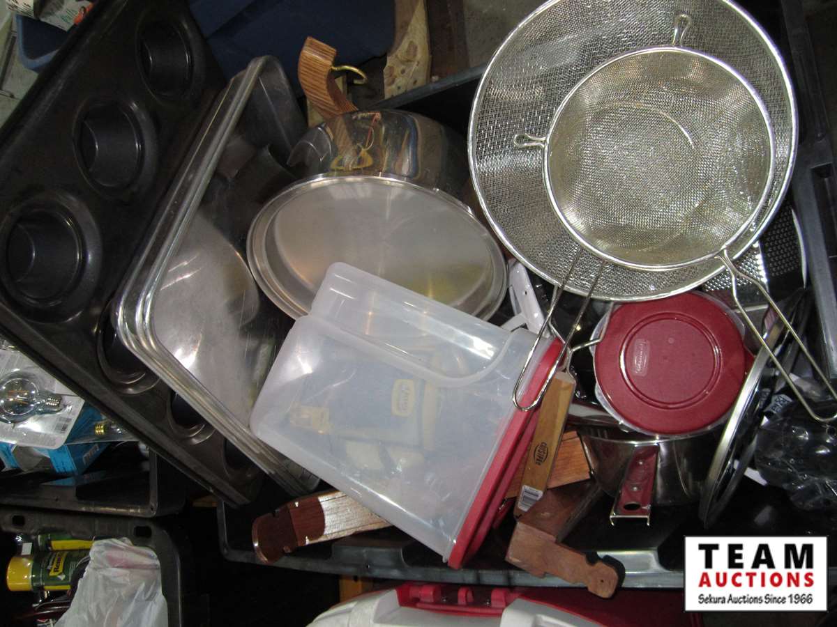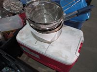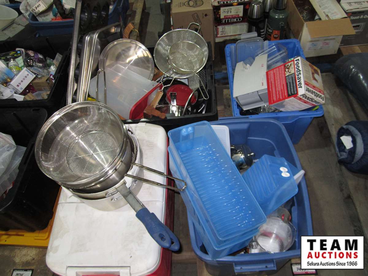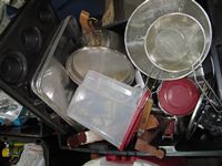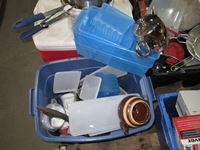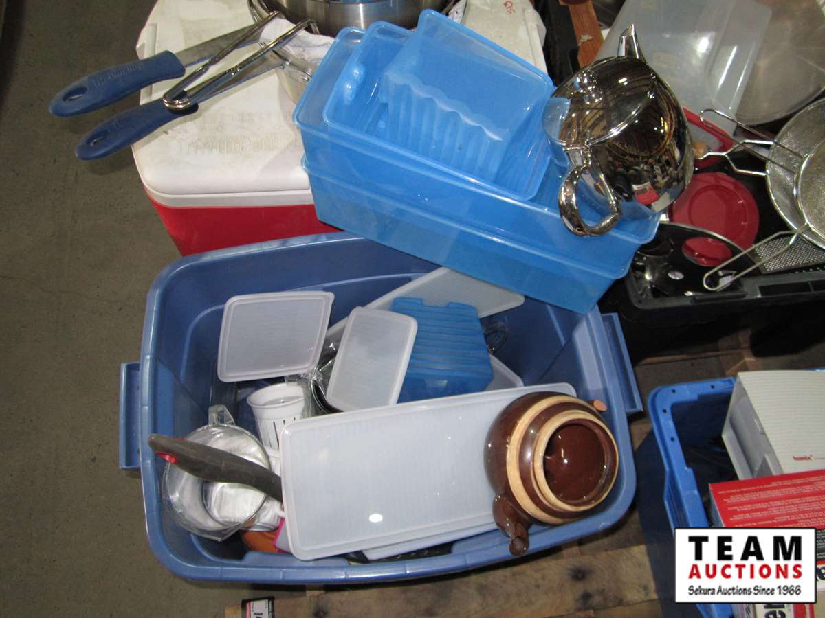 tote w/misc items, blue storage containers, teapot, coffee pot, strainers, measuring cup, spatulas, various kitchen tools, Igloo red and white cooler