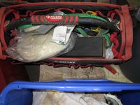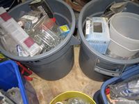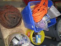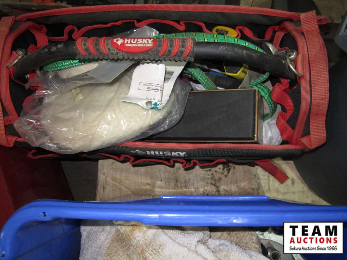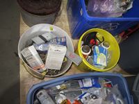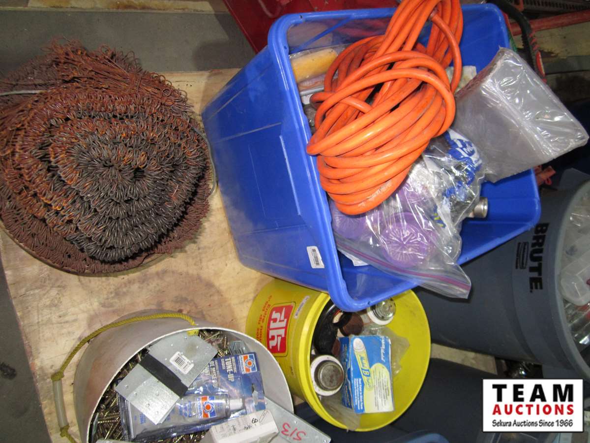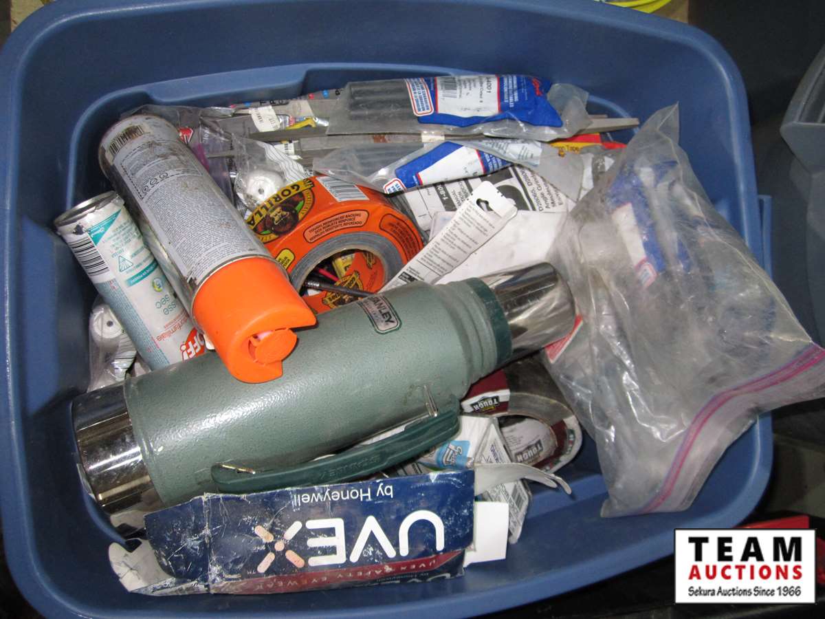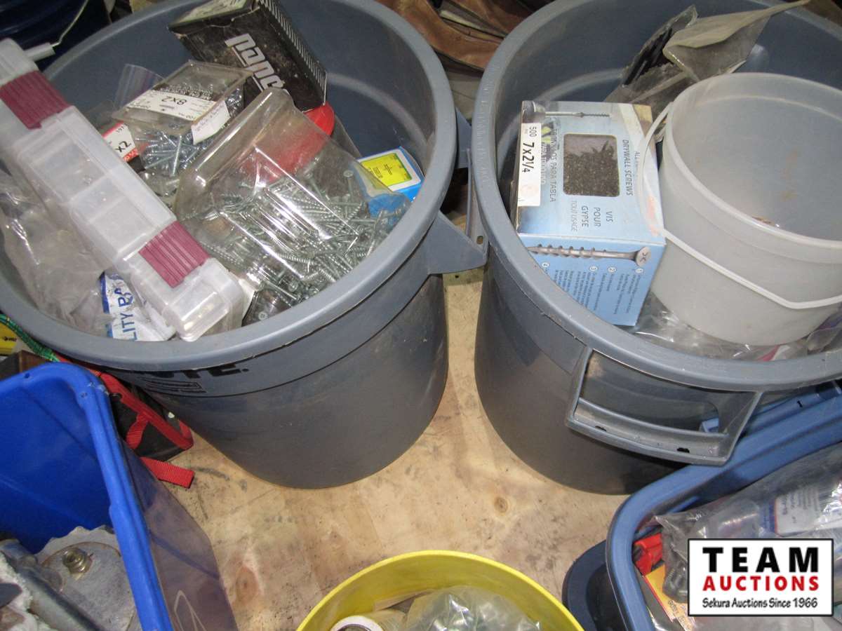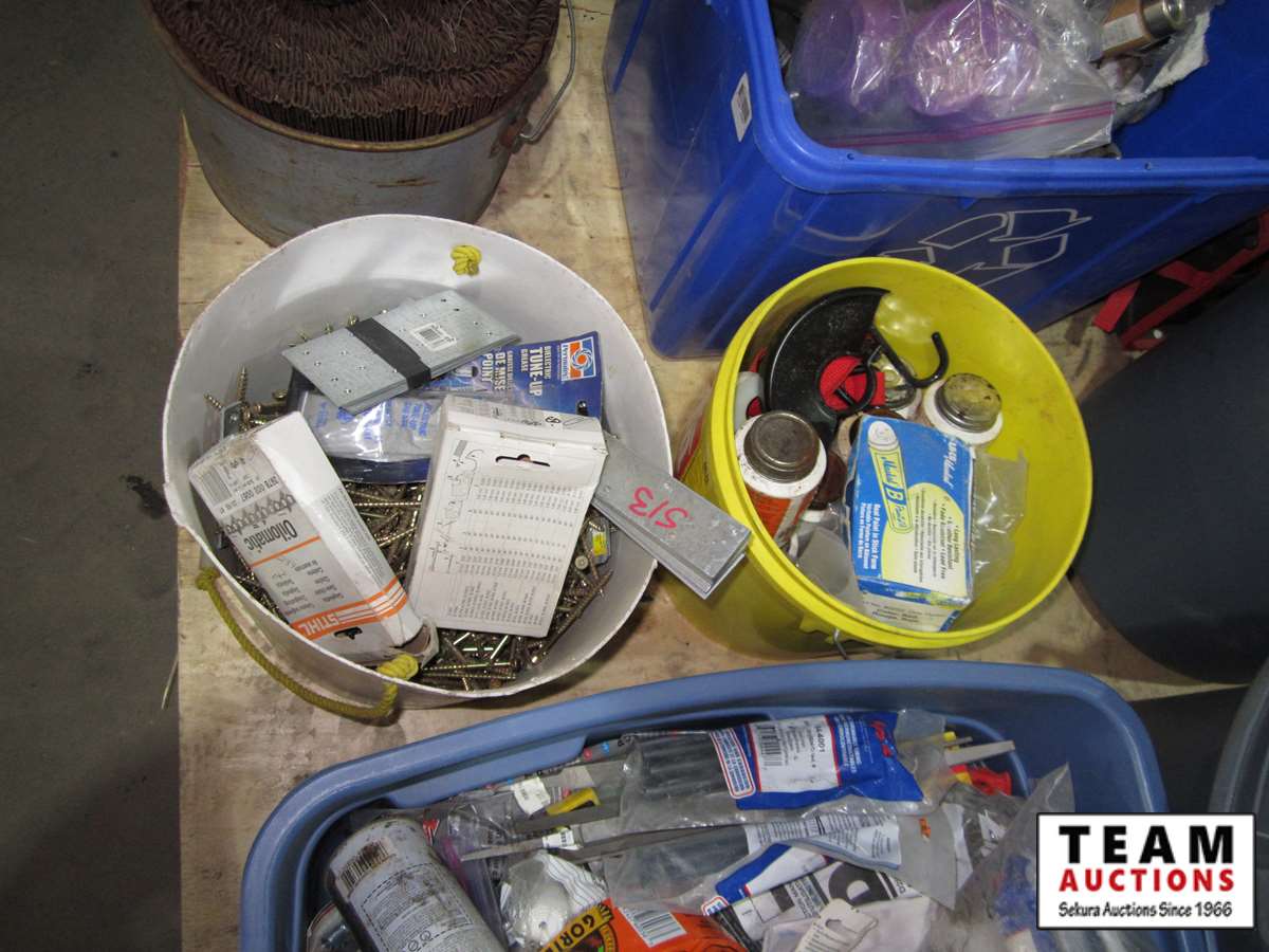 coffee thermos, misc. paint, cutting disc, misc tape, files, white bucket w/large wood screws, brackets, tune-up grease, saw chain yellow bucket w/multiple bottles thread sealant, bags of screws size unknown, Rubbermaid bucket, containers of various screws & pop rivets, paint tray roller, sponges, trowels, misc