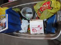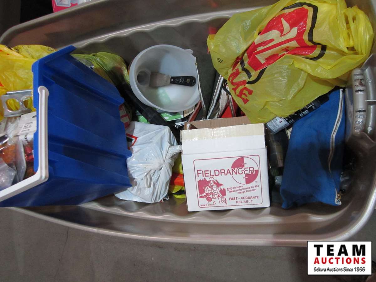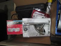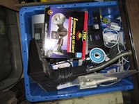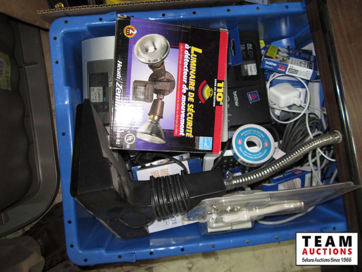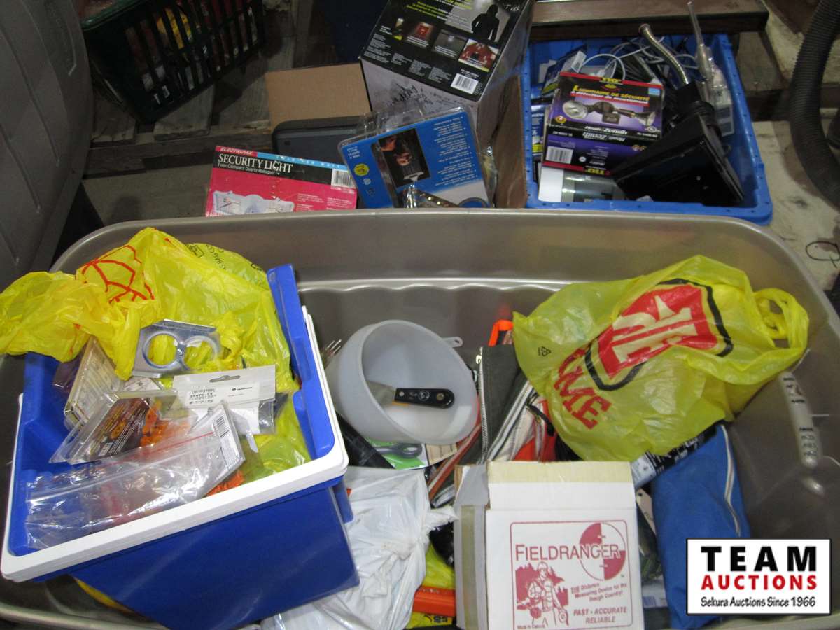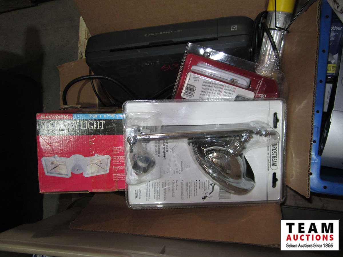 work gloves, screwdriver, string tape, snap line dye, towels, flashlight, fire extinguisher, 14-2 wire, wire connectors, electrical tape, electrical parts, spotlights, aerosol dust cleaner, HP Officejet 250 mobile all-in-one printer, security lights, label maker, desk lamp, various ink cartridges