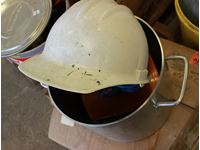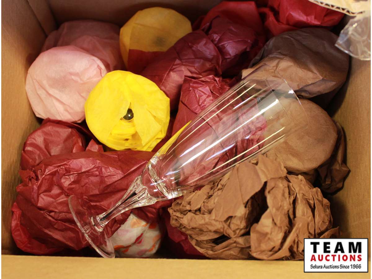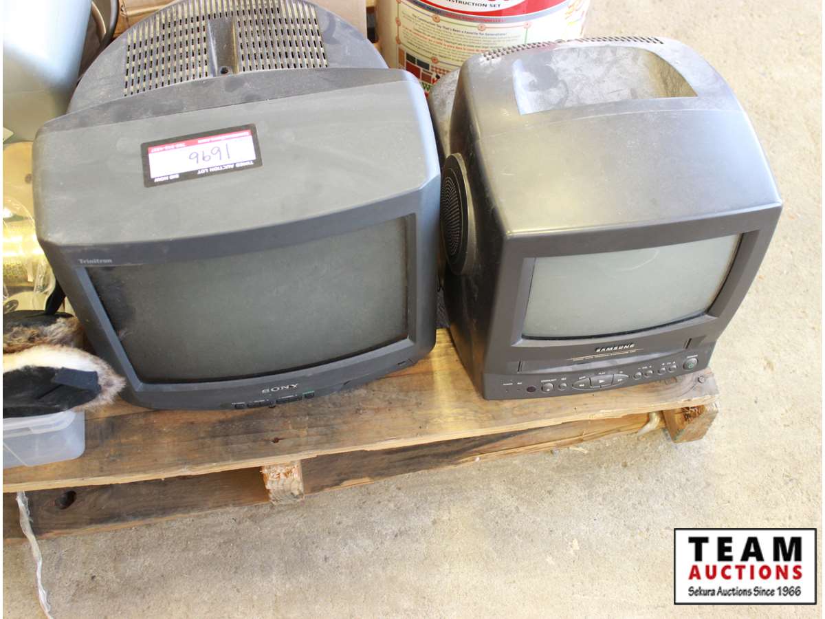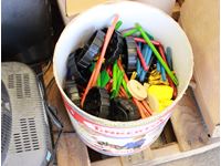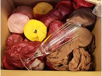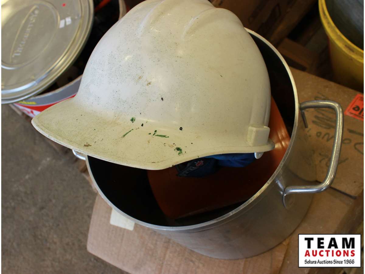 cooking pot, construction helmet, strap down cables, white shop rags, Sony TV, Samsung TV/video player, ribbon, winter hood, can of tinker toys, assorted glasses wine glasses, mixing bowls, bamboo containers, large watering can