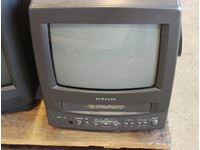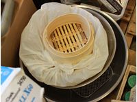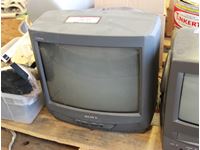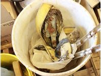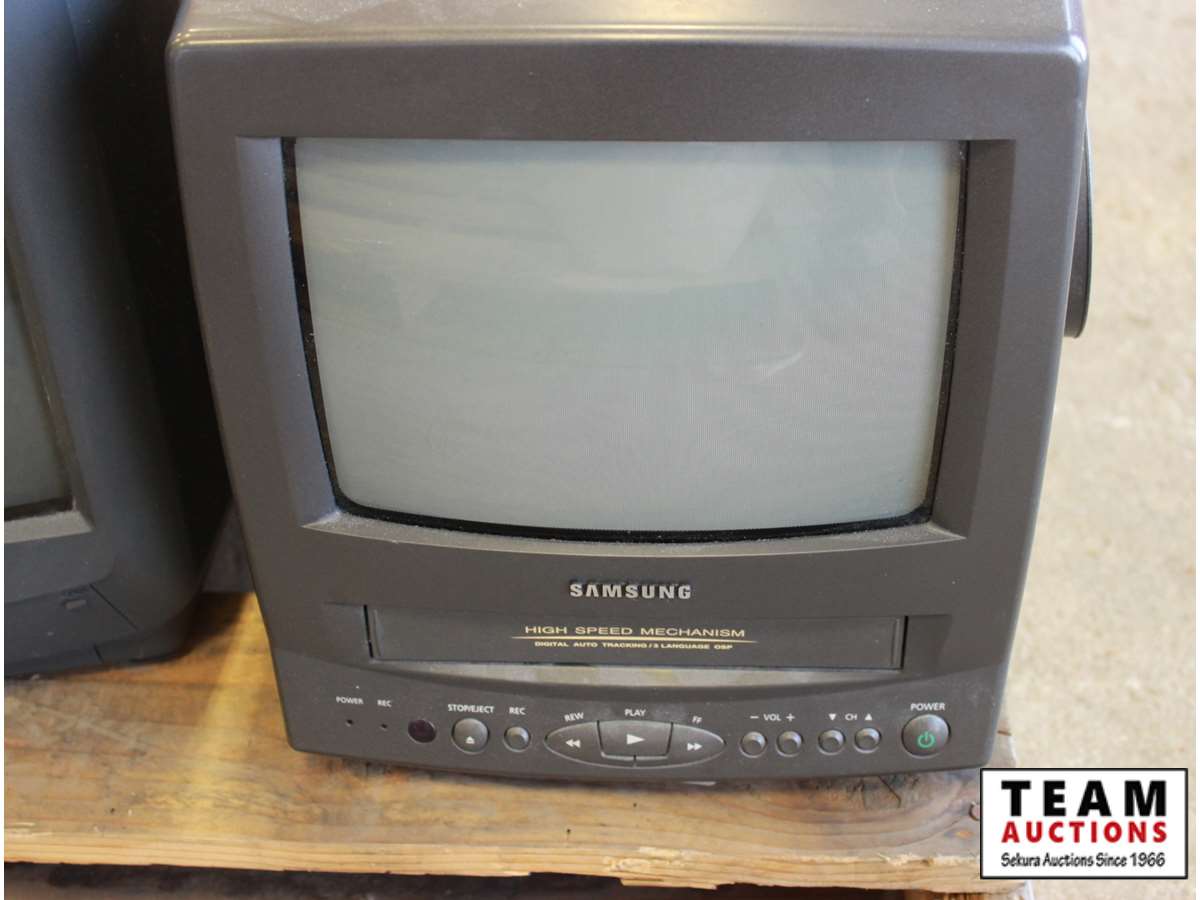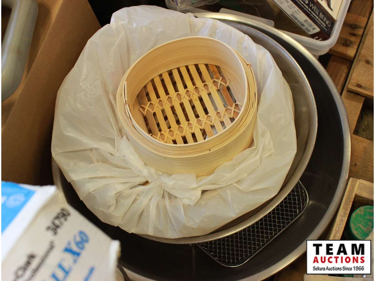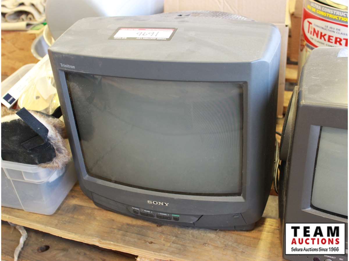 cooking pot, construction helmet, strap down cables, white shop rags, Sony TV, Samsung TV/video player, ribbon, winter hood, can of tinker toys, assorted glasses wine glasses, mixing bowls, bamboo containers, large watering can