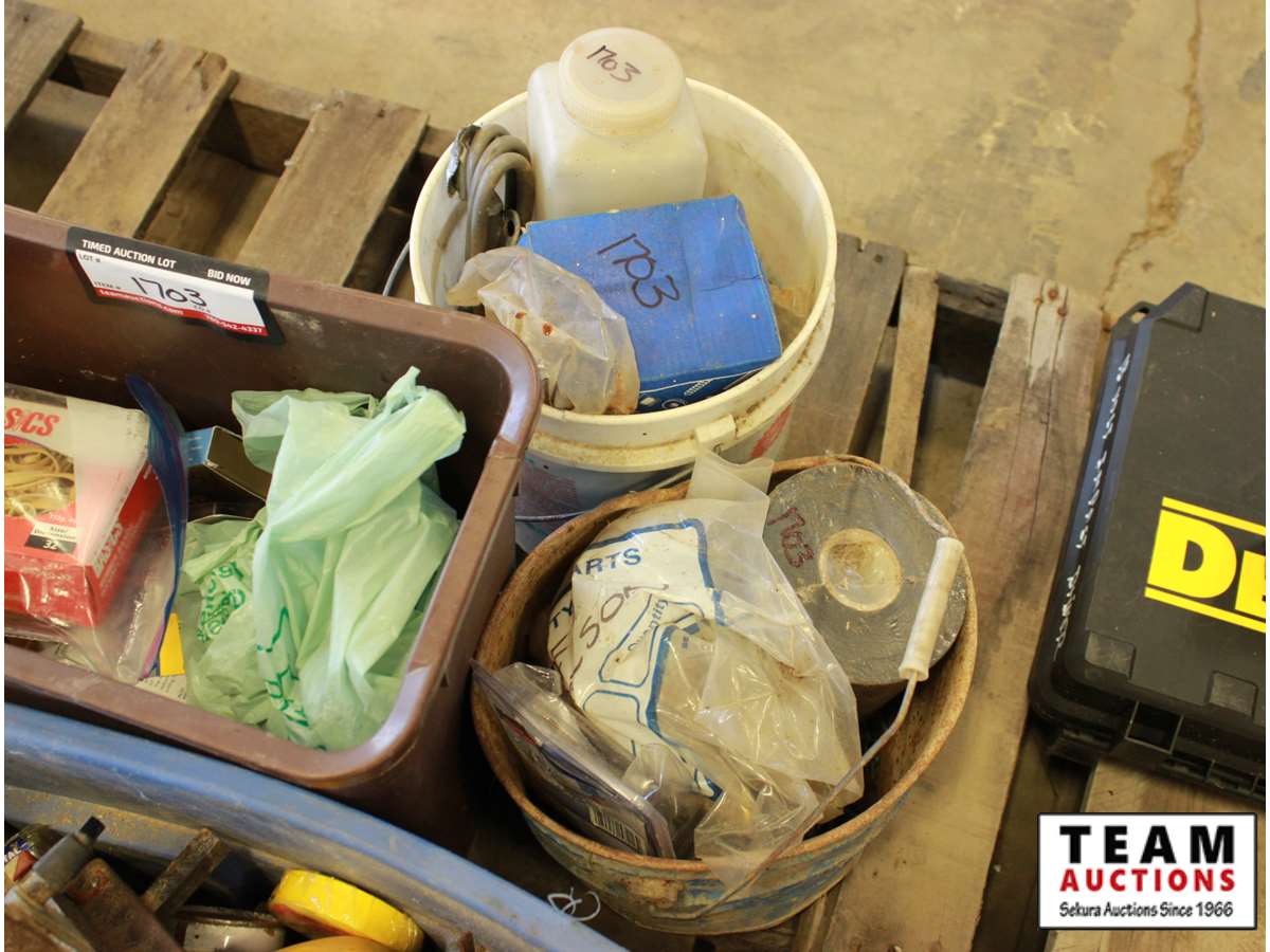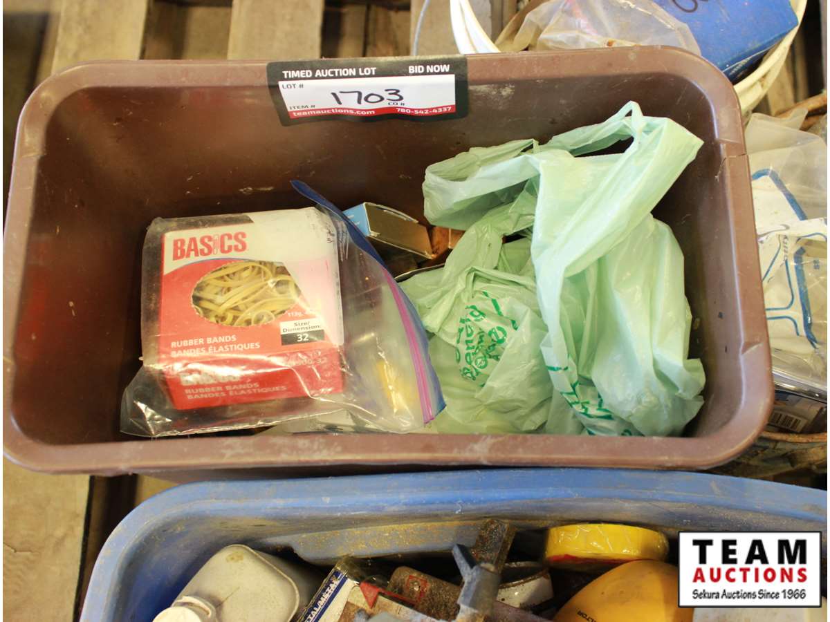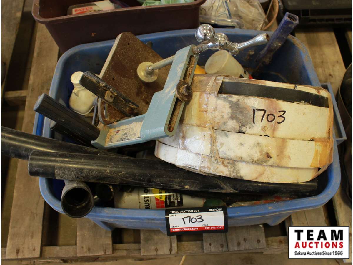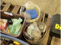 Rustoleum primer, Peltor ear protectors, rolls of foam insulation, Delta vice, black vacuum cleaner fittings, brown garbage can, elastic bands, various pens, white bucket w/screws, wire, 1" finishing nails, deck screws, electrical tape