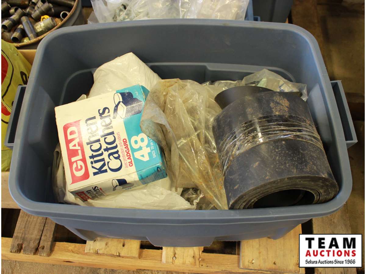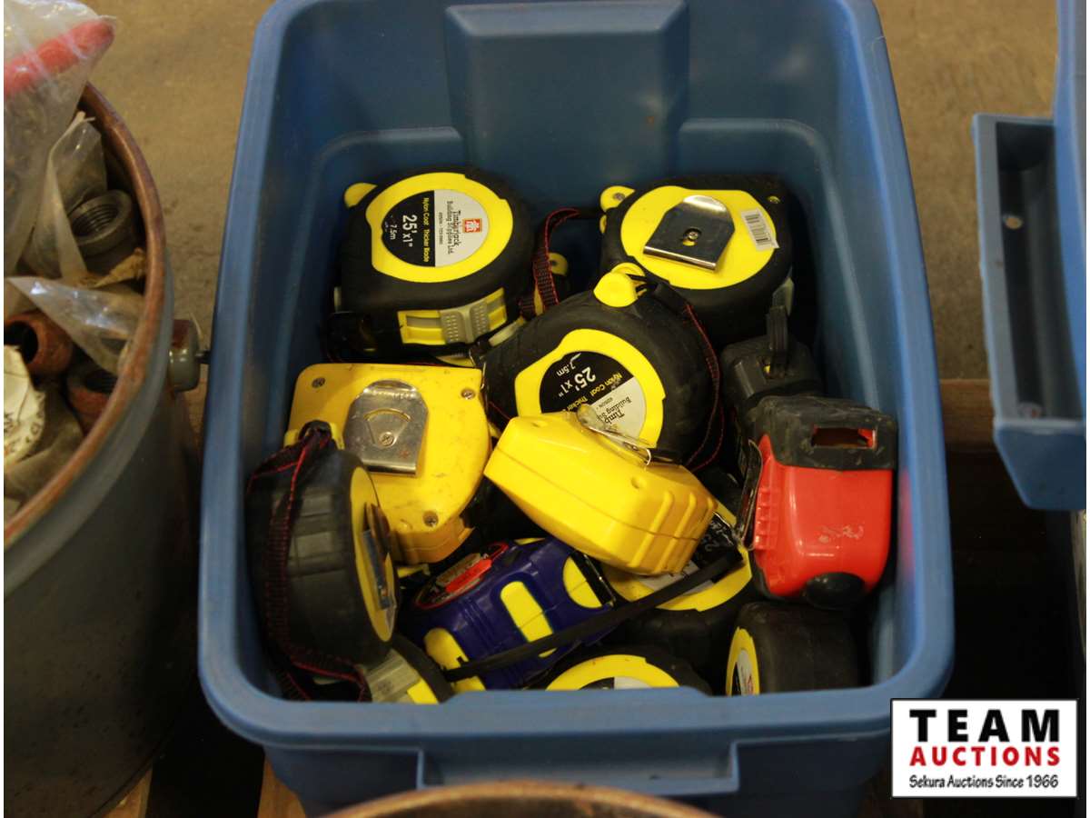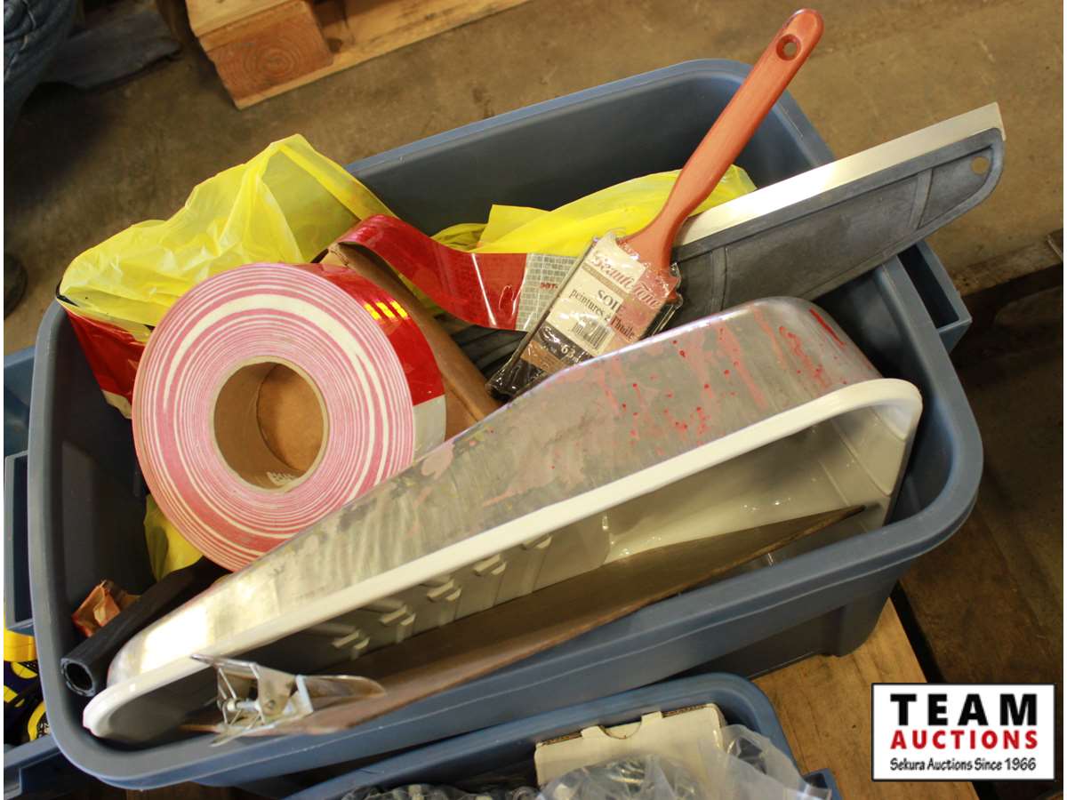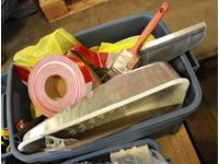 ABS pipe, tape measures, steel pipe fittings, large washers, kitchen catcher garbage bags, misc bolts & hardware, paint supplies, tray, brush, tape guide, roller
