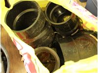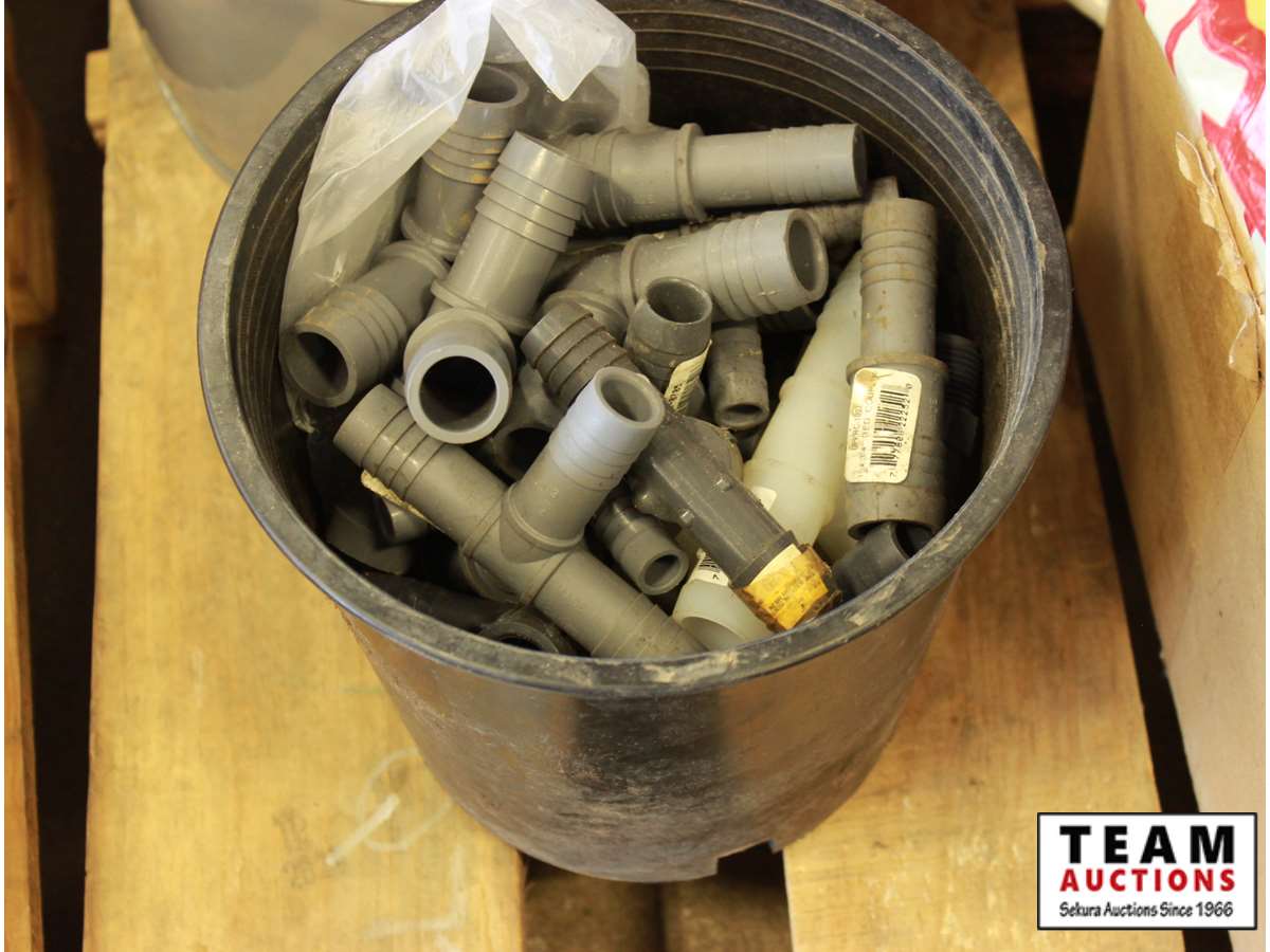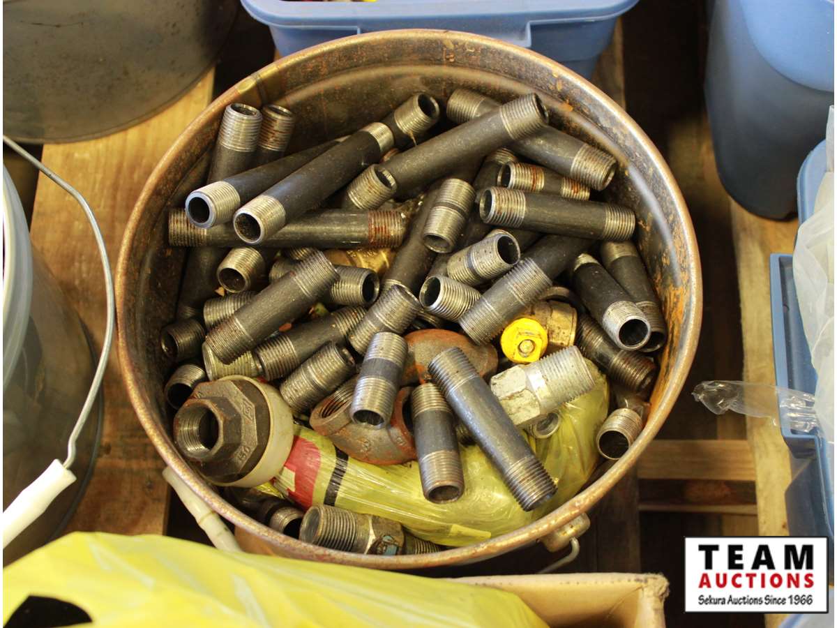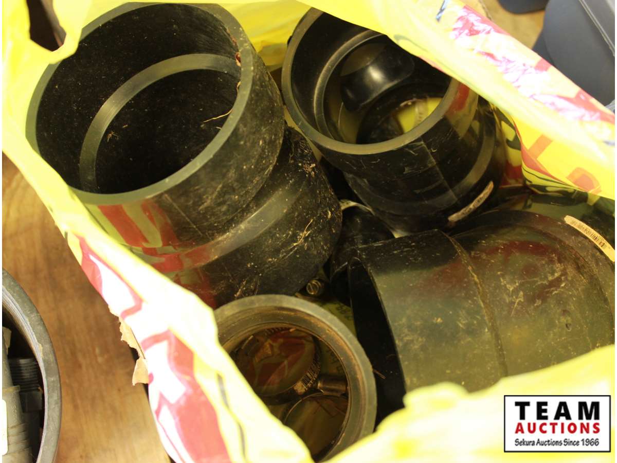 ABS pipe, tape measures, steel pipe fittings, large washers, kitchen catcher garbage bags, misc bolts & hardware, paint supplies, tray, brush, tape guide, roller