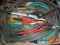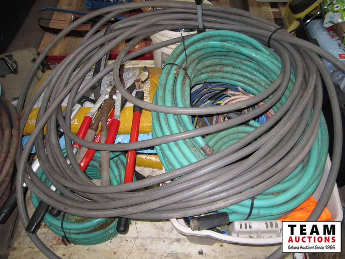 various garden hose, extension cords, strapping, potting soil, garden tools, snow scraper,miscellaneous items