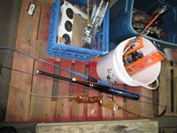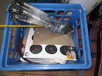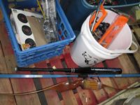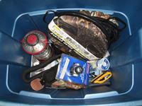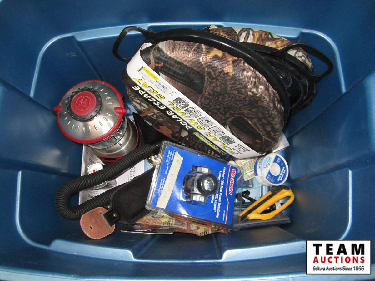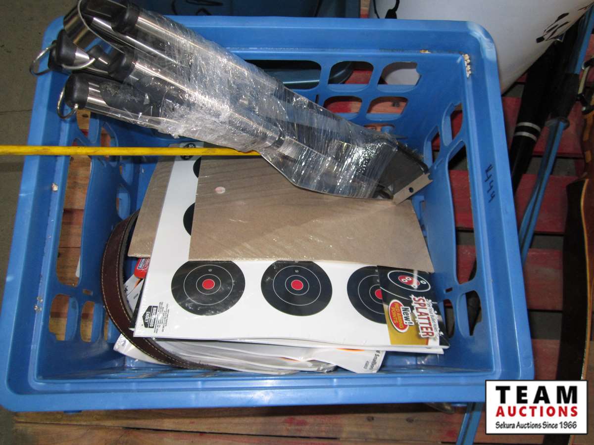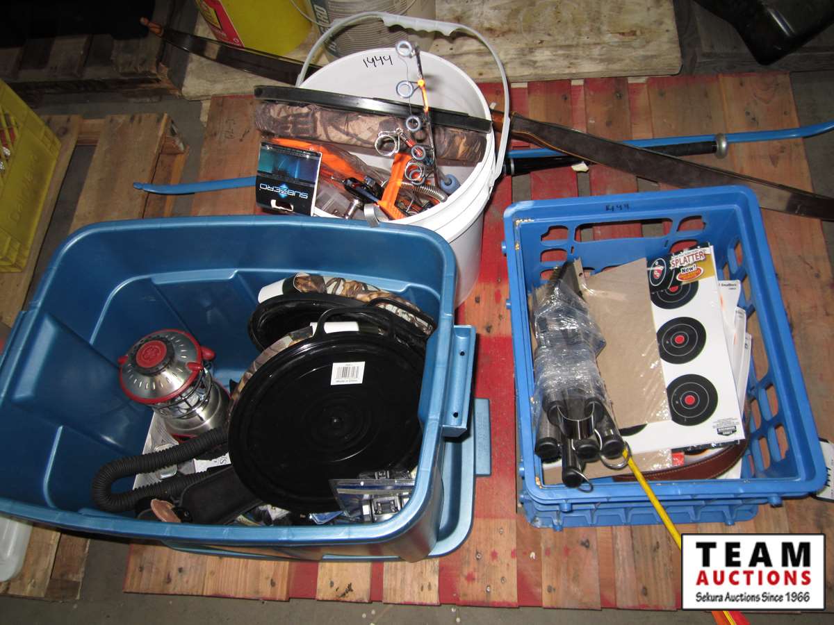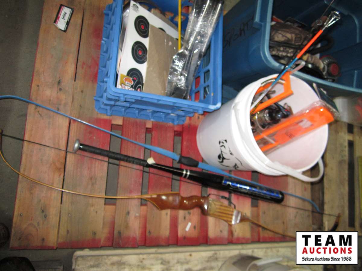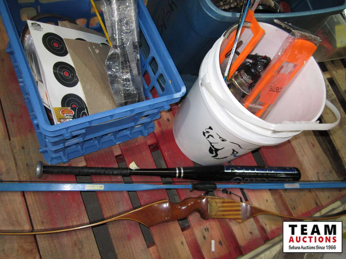 archery bows, baseball bat, blue tote w/BBQ tools, targets, blue tote w/ LED headlamp, (2) outdoor swivel seats, outdoor lamp GE