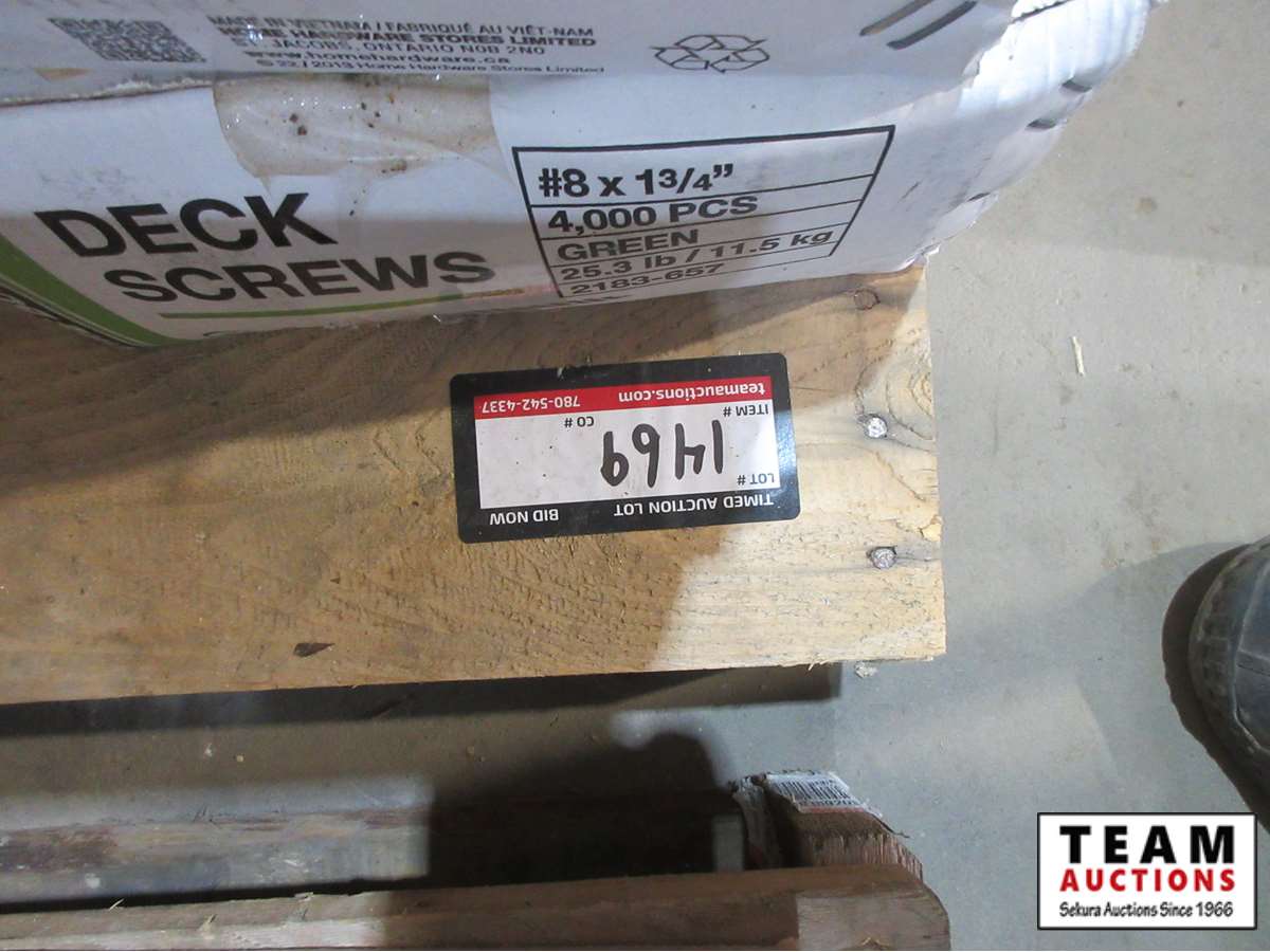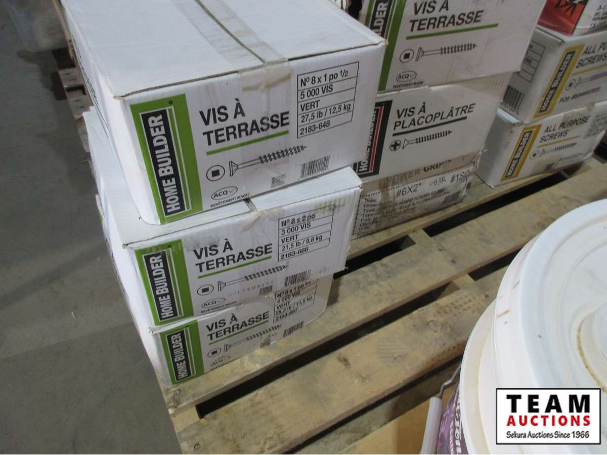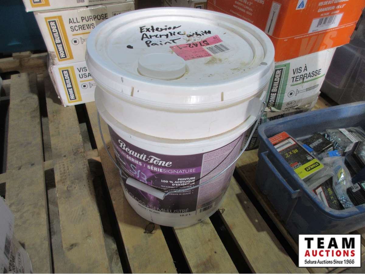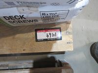 Approx (19) boxes of deck & drywall screws from 1 1/4" to 3 1/2", 18.2 L of Acrylic paint (white)