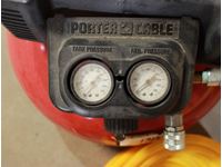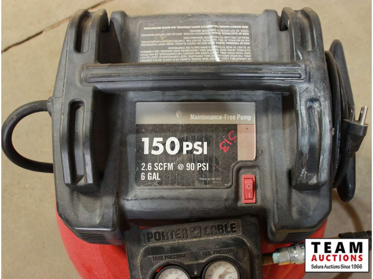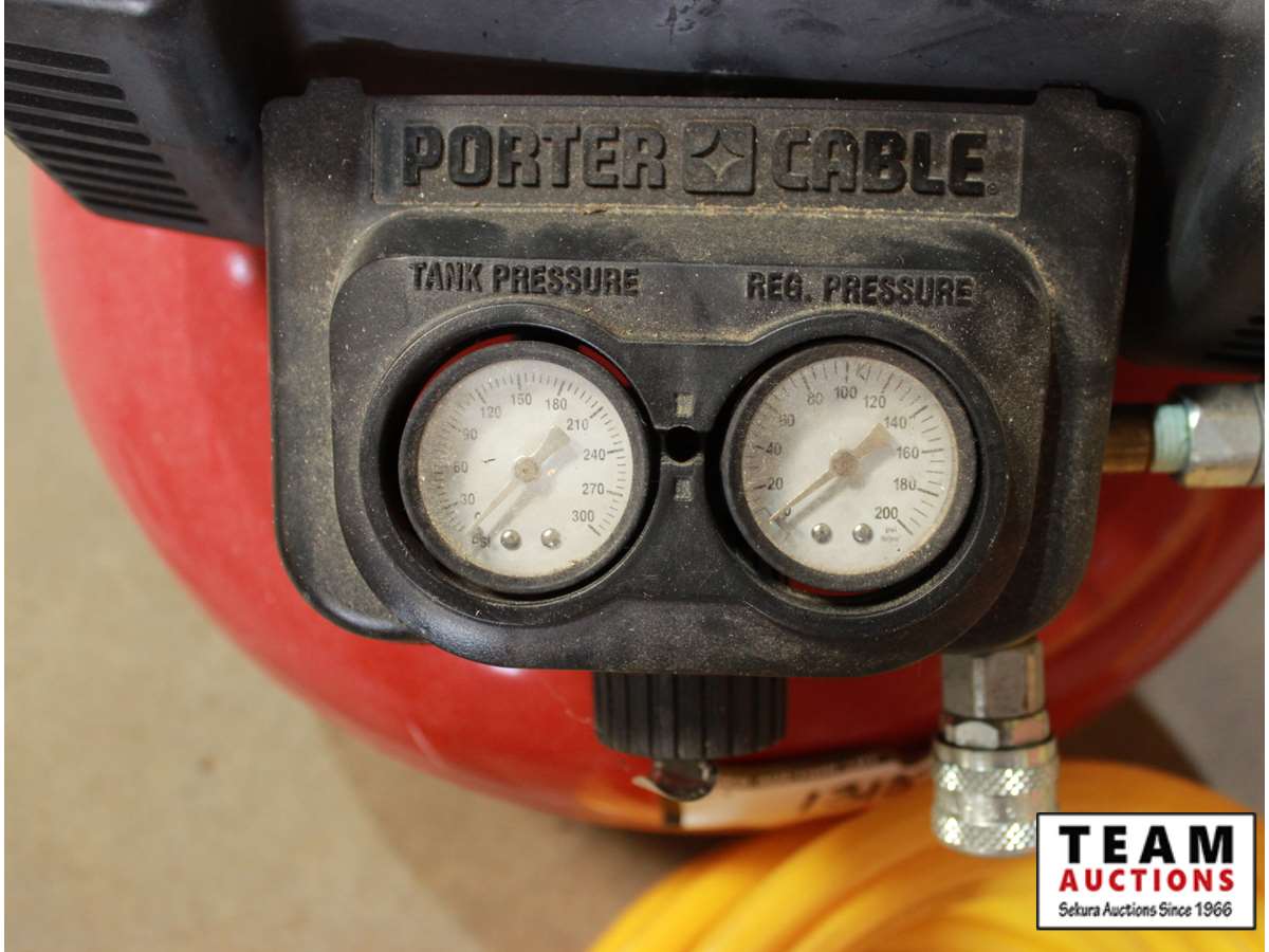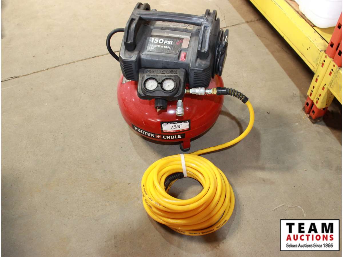 Porter Cable portable air tank with pump 150 psi 2.6 scfm at 90 PSI 6 gallon with long Bostitch hose