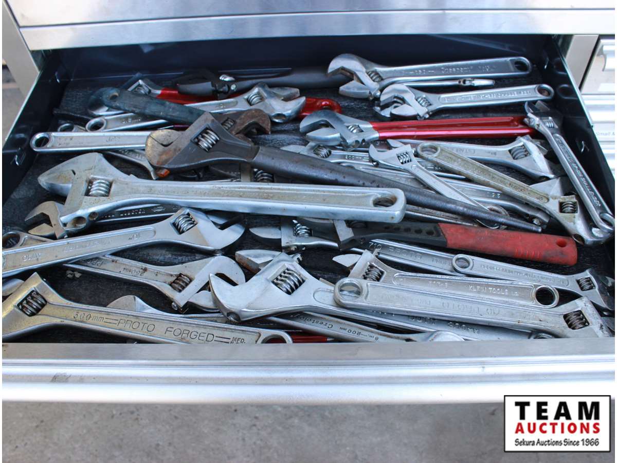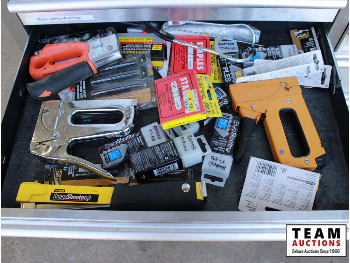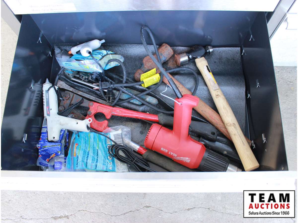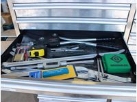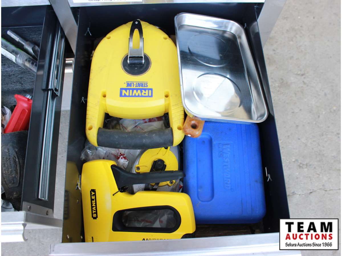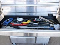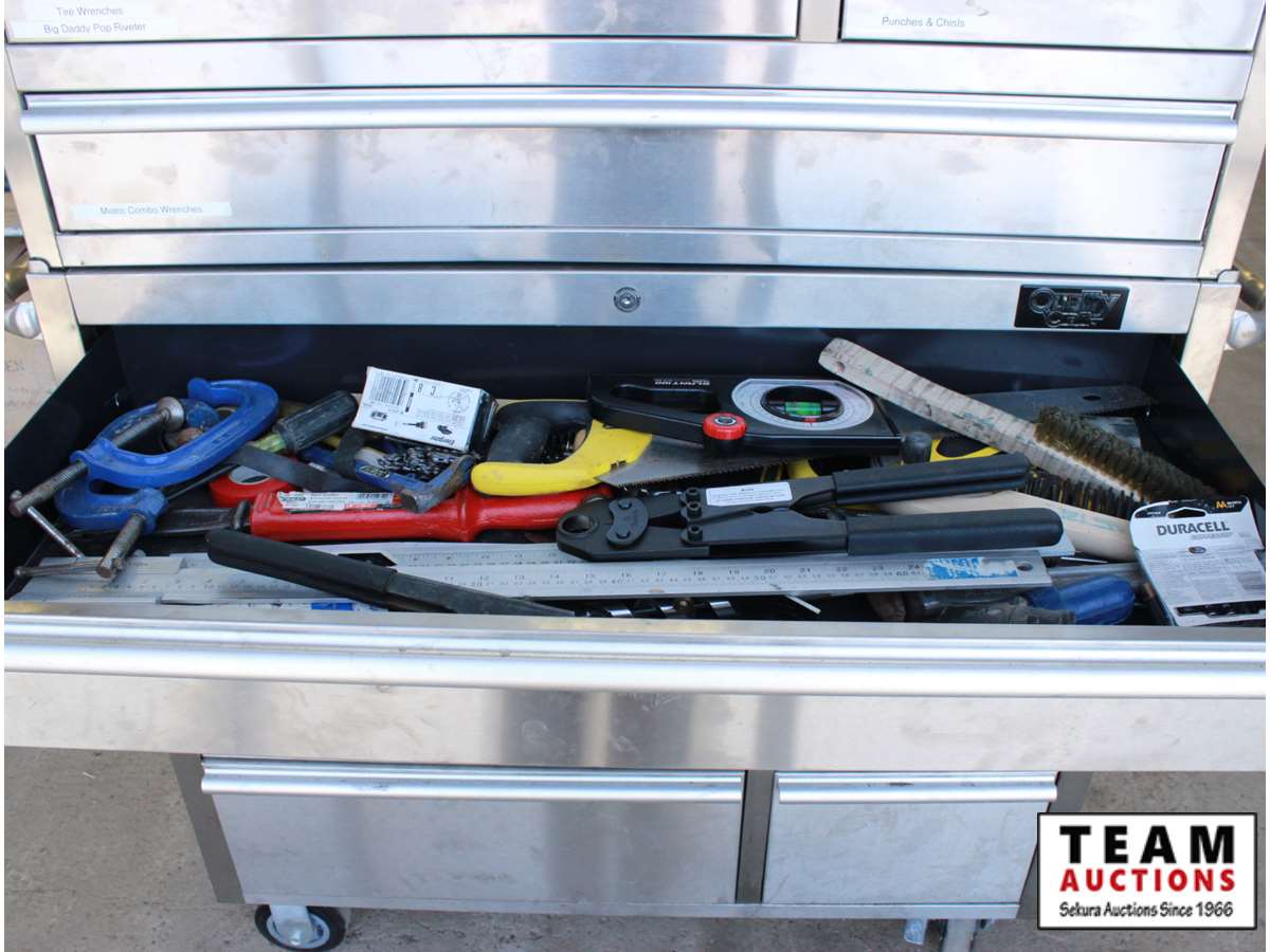 stainless steel tool box complete w/various misc tools, wrenches, measuring devices, knives, staple guns, pliers, vice grips, & more