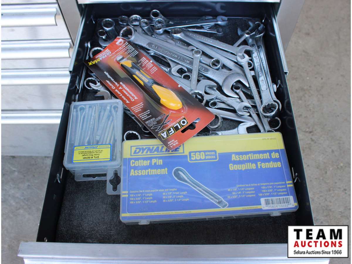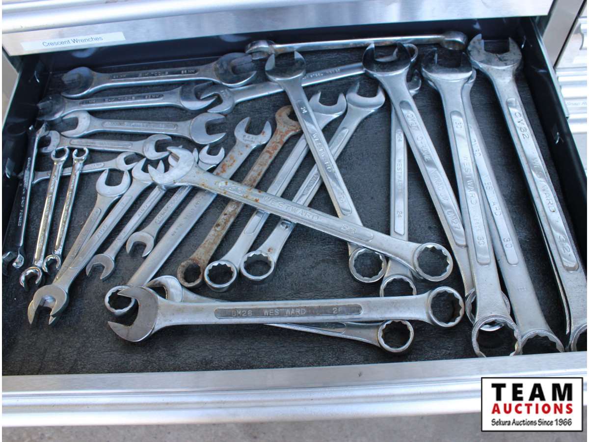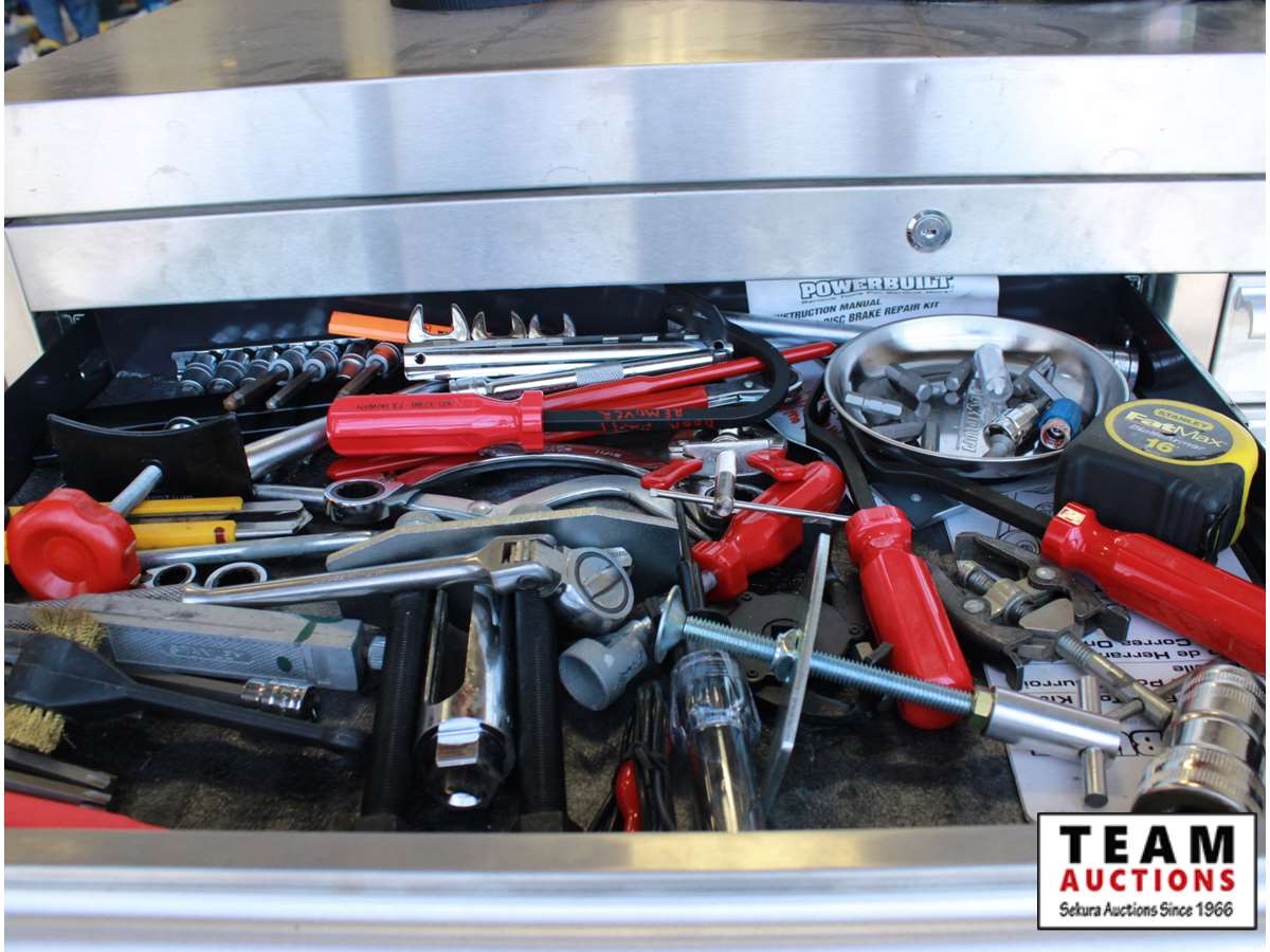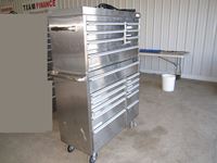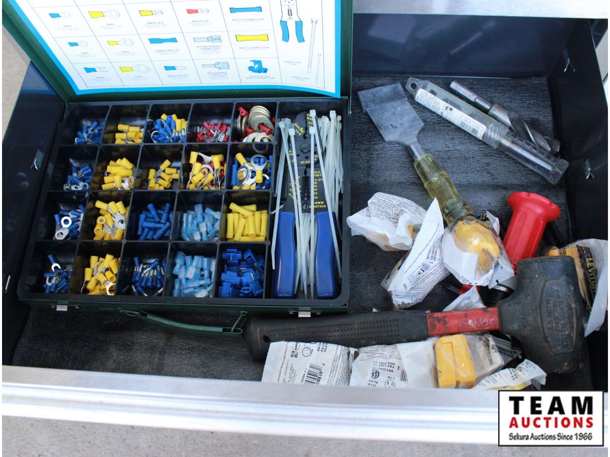 stainless steel tool box complete w/various misc tools, wrenches, measuring devices, knives, staple guns, pliers, vice grips, & more