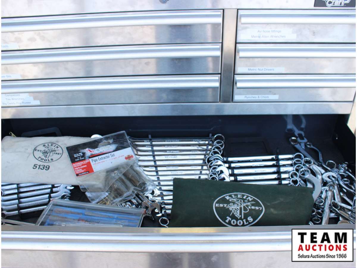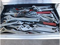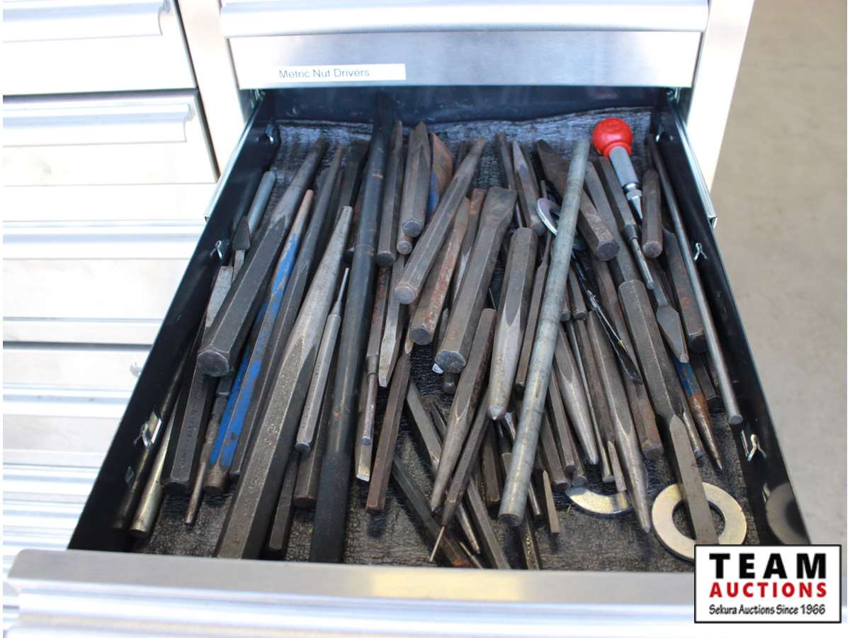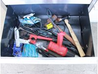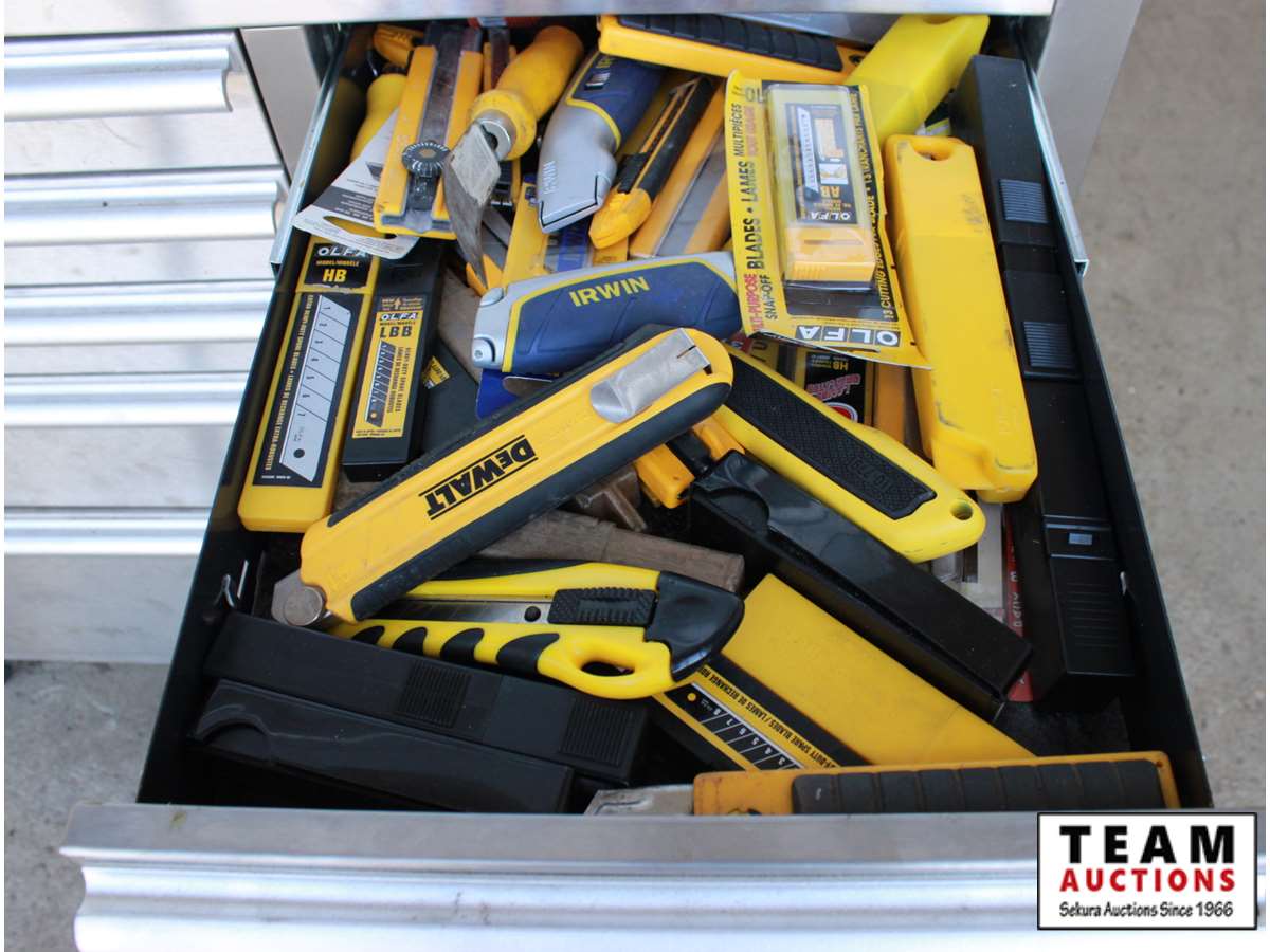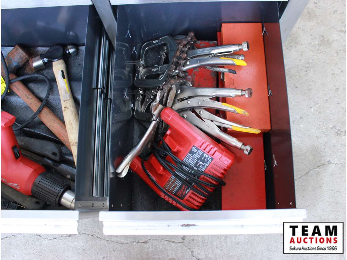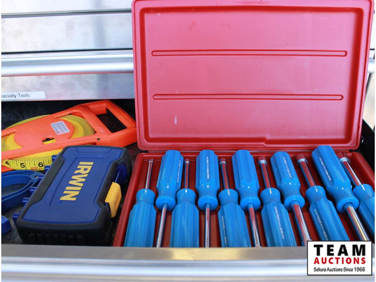 stainless steel tool box complete w/various misc tools, wrenches, measuring devices, knives, staple guns, pliers, vice grips, & more