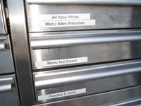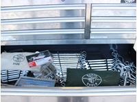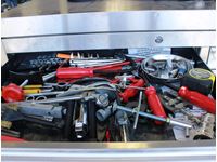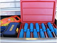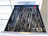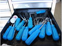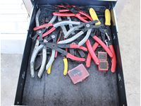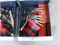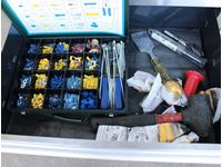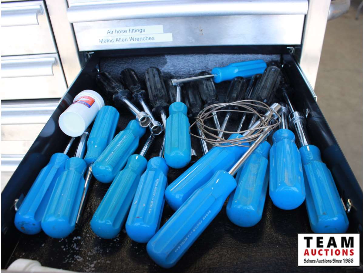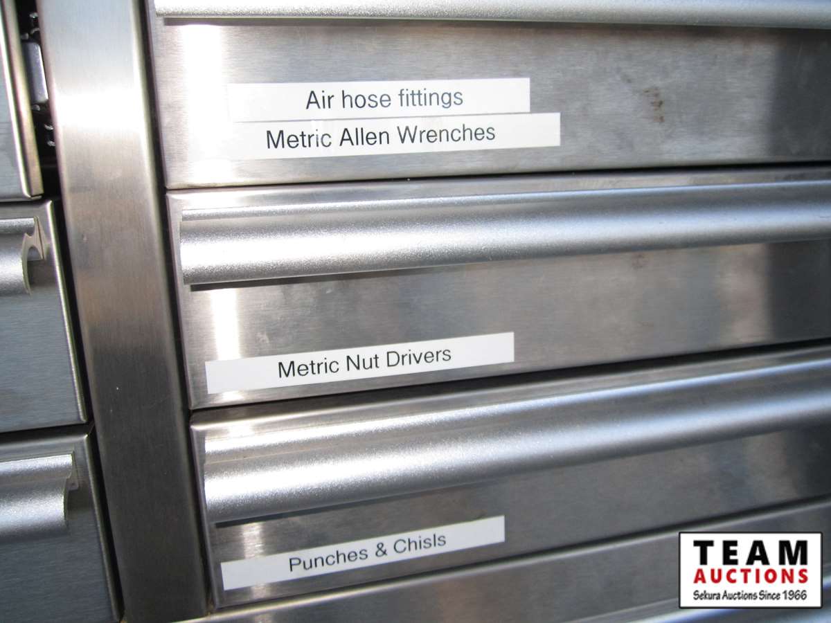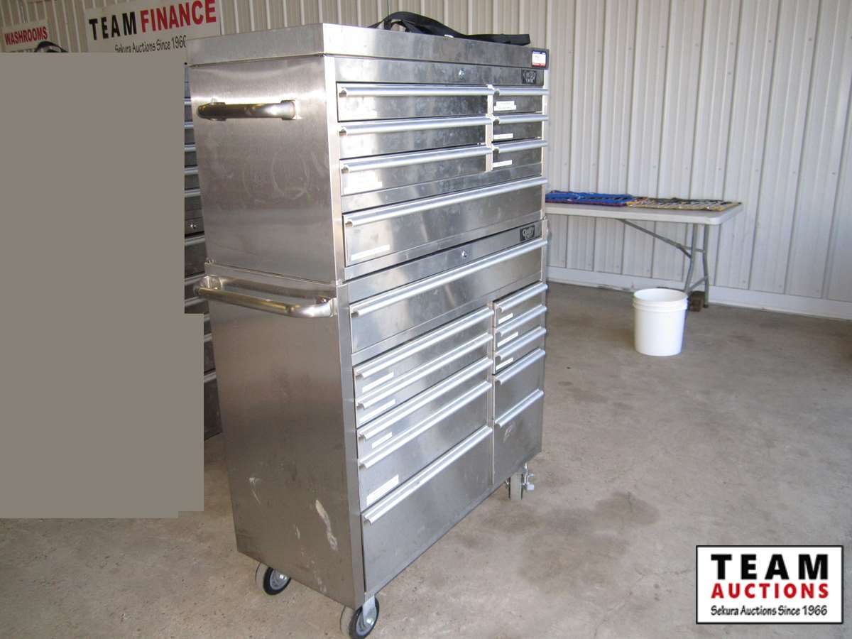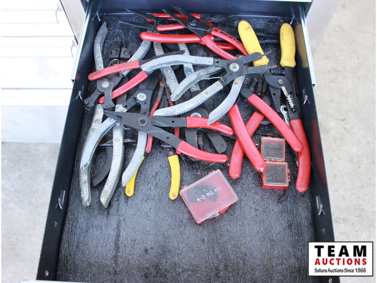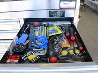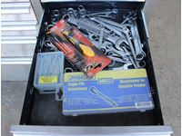 stainless steel tool box complete w/various misc tools, wrenches, measuring devices, knives, staple guns, pliers, vice grips, & more
