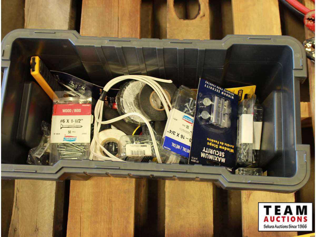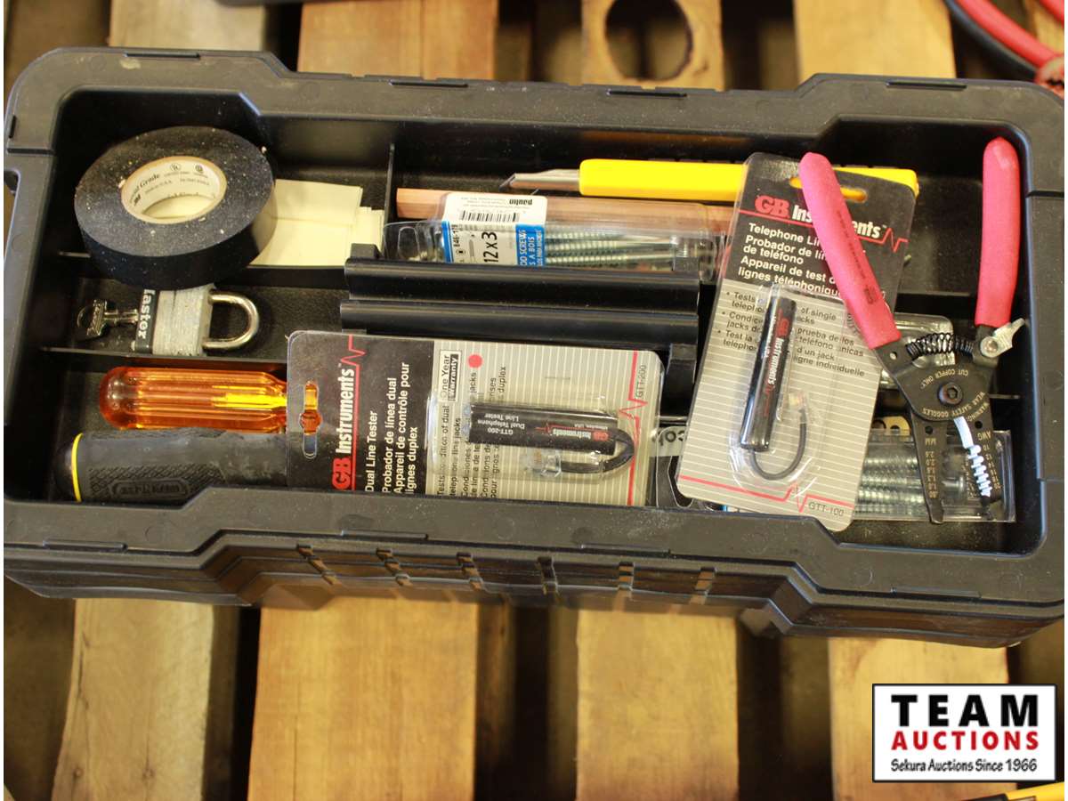wire cutters, dual telephone line tester, screwdrivers, electrical tape, knife, hammer, screwdriver, miscellaneous screws, electrical tape, window stops, miscellaneous
