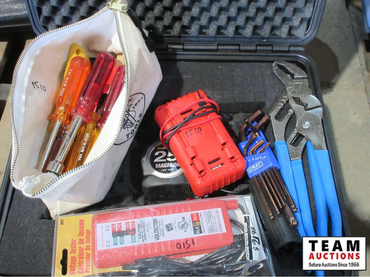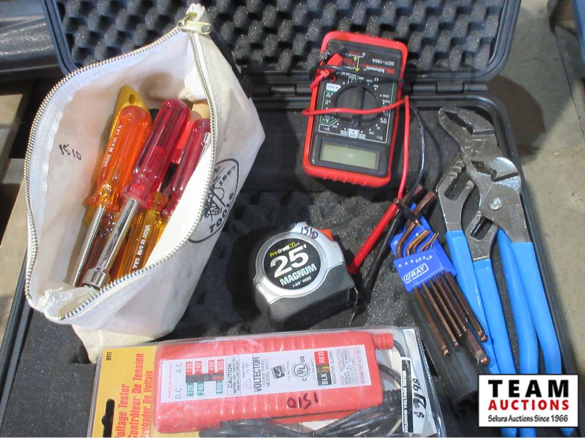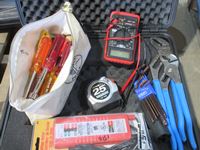 voltage tester, multi meter, nut drivers, (3) Channelock pliers, tape measure, Allen wrenches