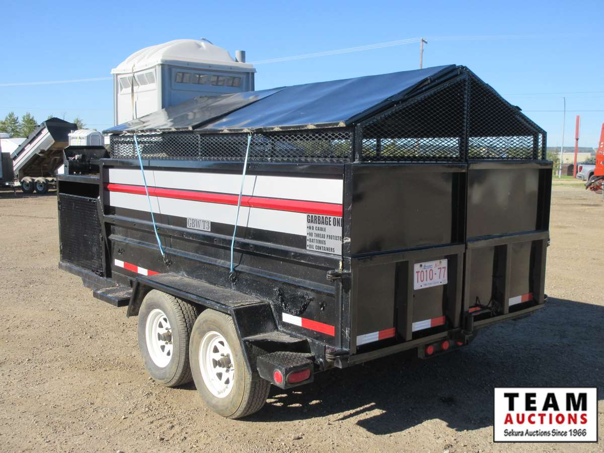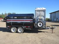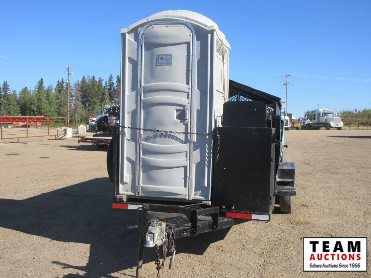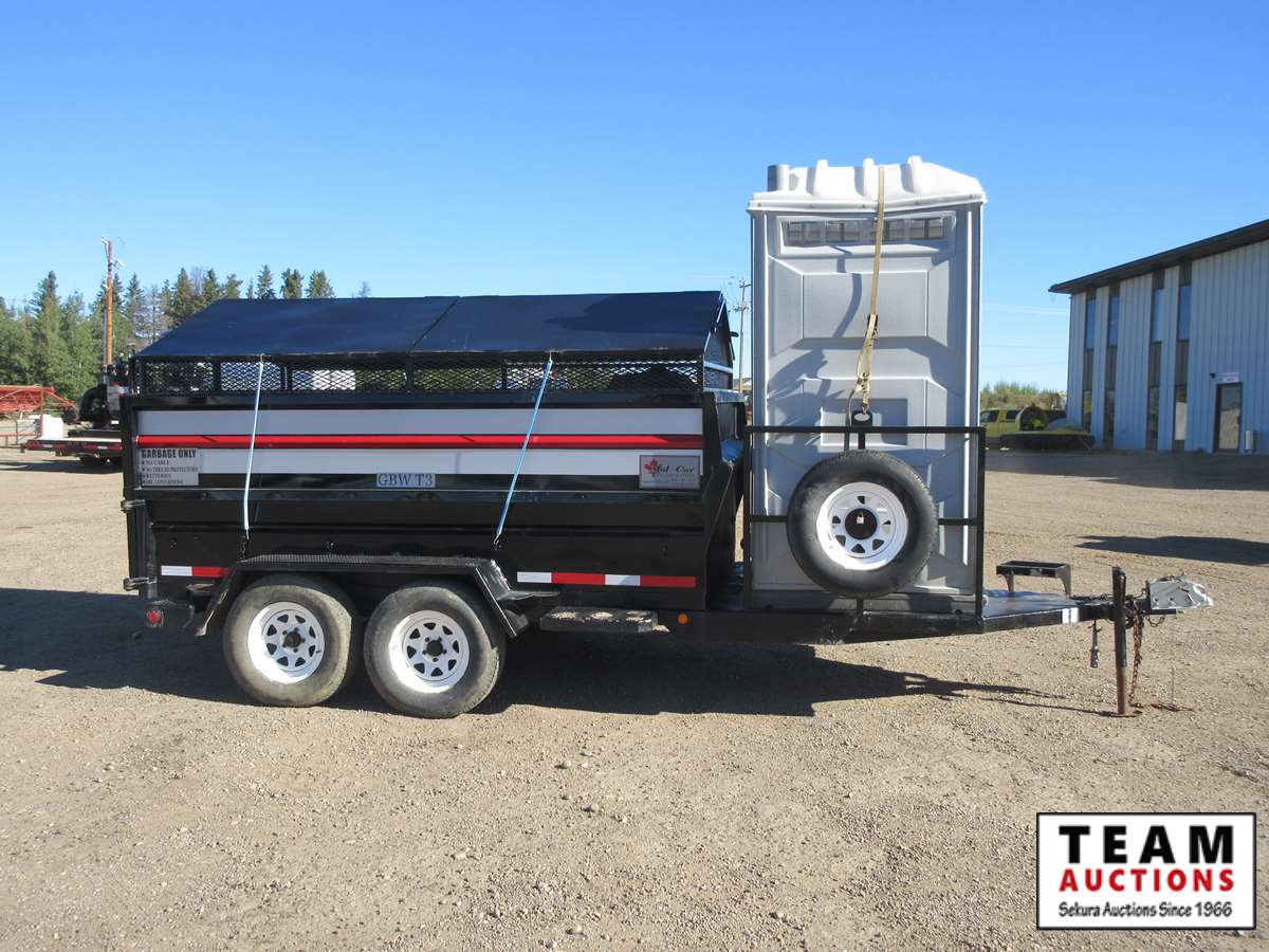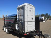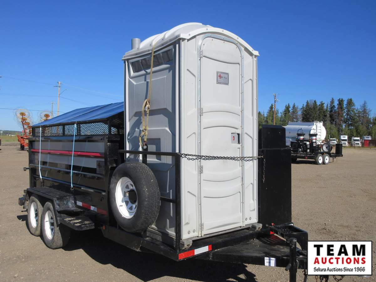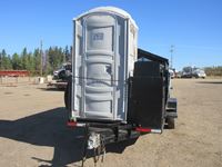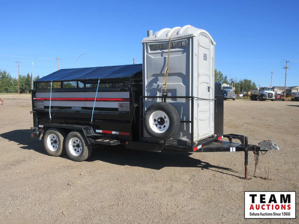 custom built tilt dumpster combo unit with used oil tank, metal bin, toilet, insulated toilet cover, 10' covered dump box, 12V self contained hydraulic system, 3500 lb axles, spring suspension, 225/75R15 rubber, spare, surge hydraulic brakes