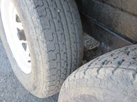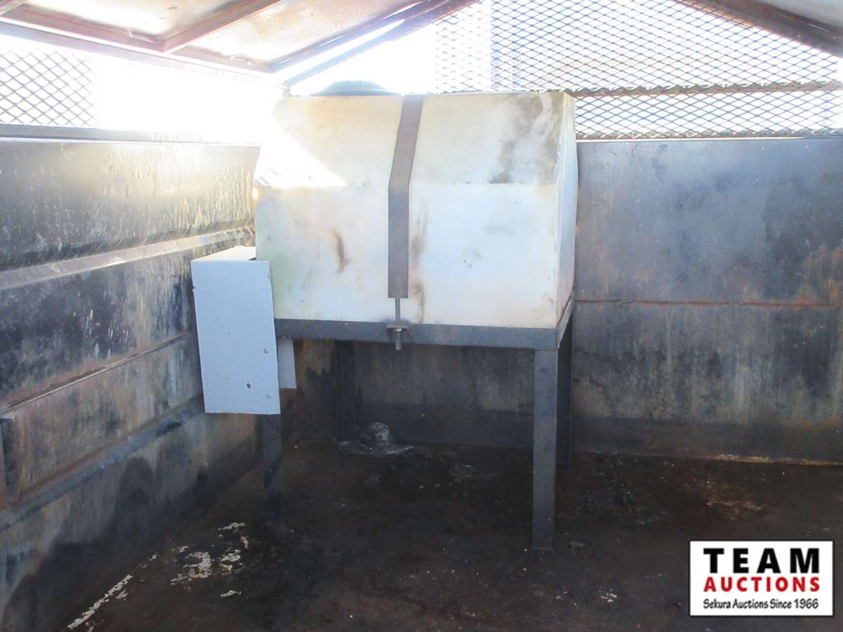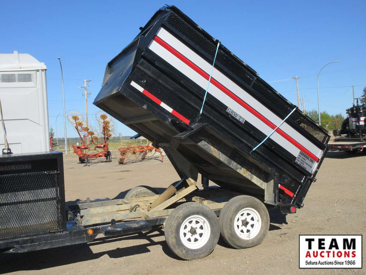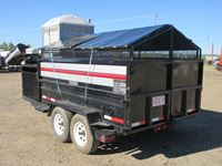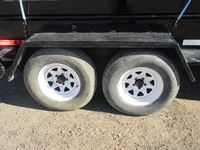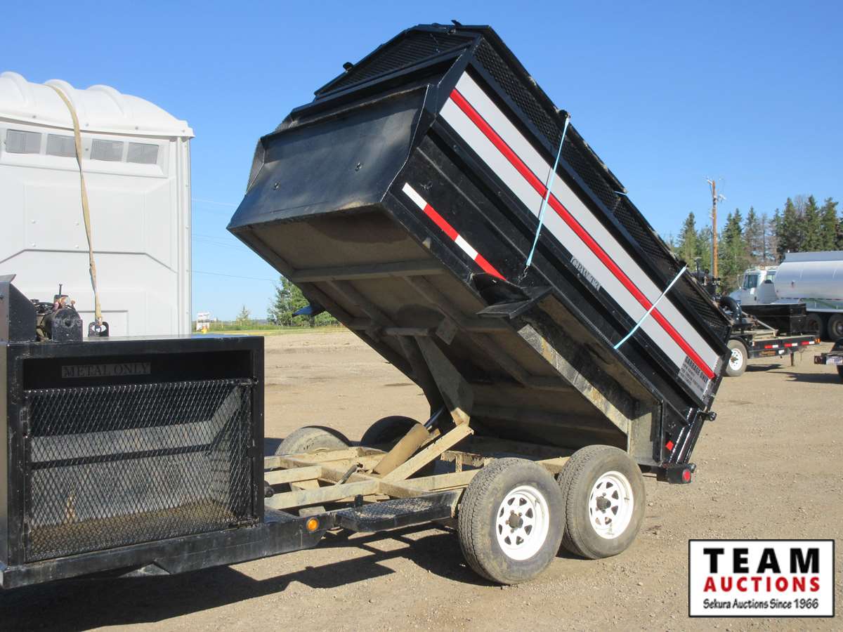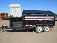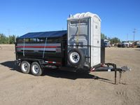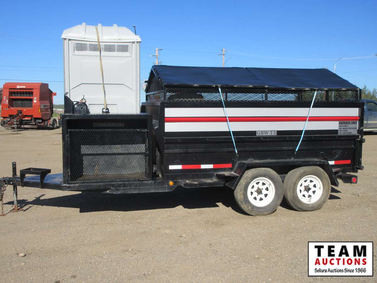 custom built tilt dumpster combo unit with used oil tank, metal bin, toilet, insulated toilet cover, 10' covered dump box, 12V self contained hydraulic system, 3500 lb axles, spring suspension, 225/75R15 rubber, spare, surge hydraulic brakes