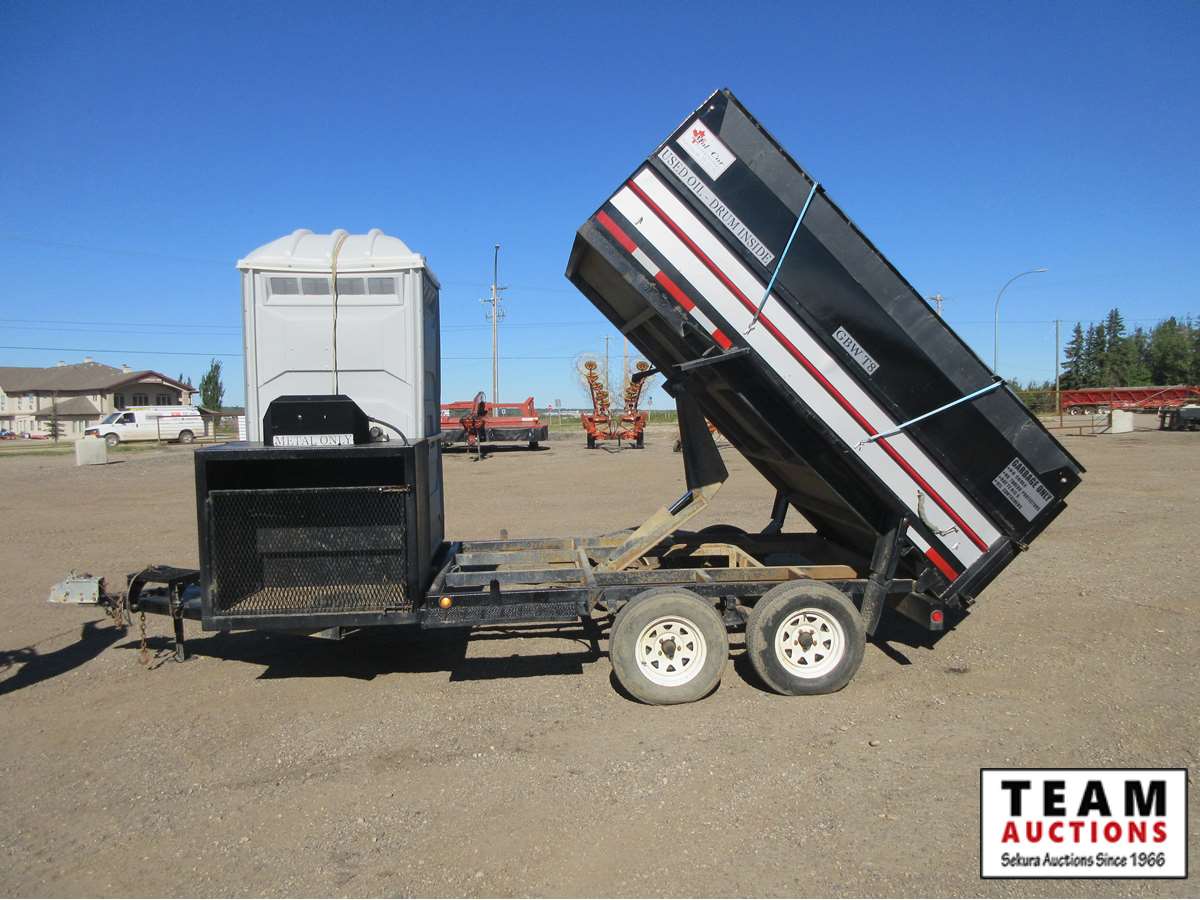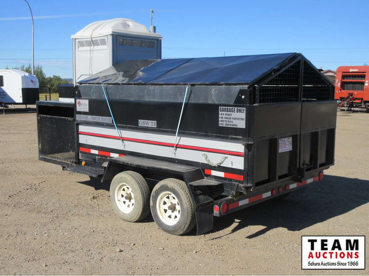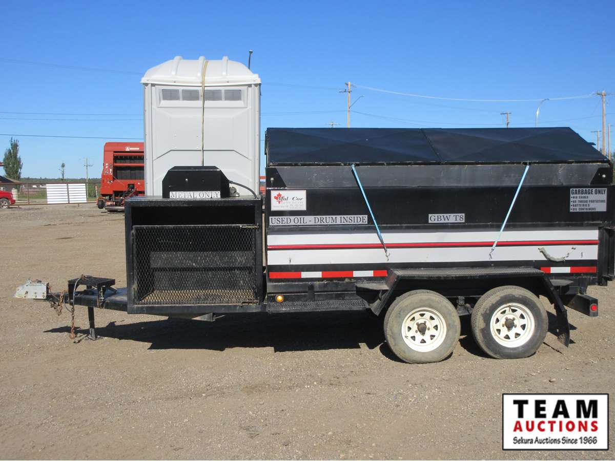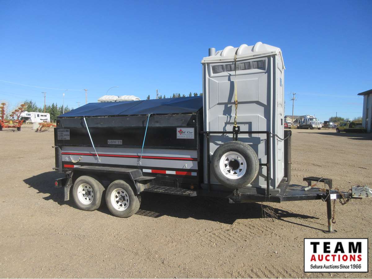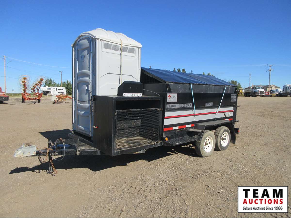 custom built tilt dumpster combo unit with used oil tank, metal bin, toilet, insulated toilet cover, 10' covered dump box, 12V self contained hydraulic system, 3500 lb axles, spring suspension, 215/75R14 rubber, spare, surge hydraulic brakes