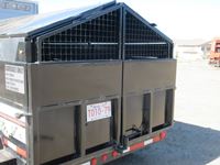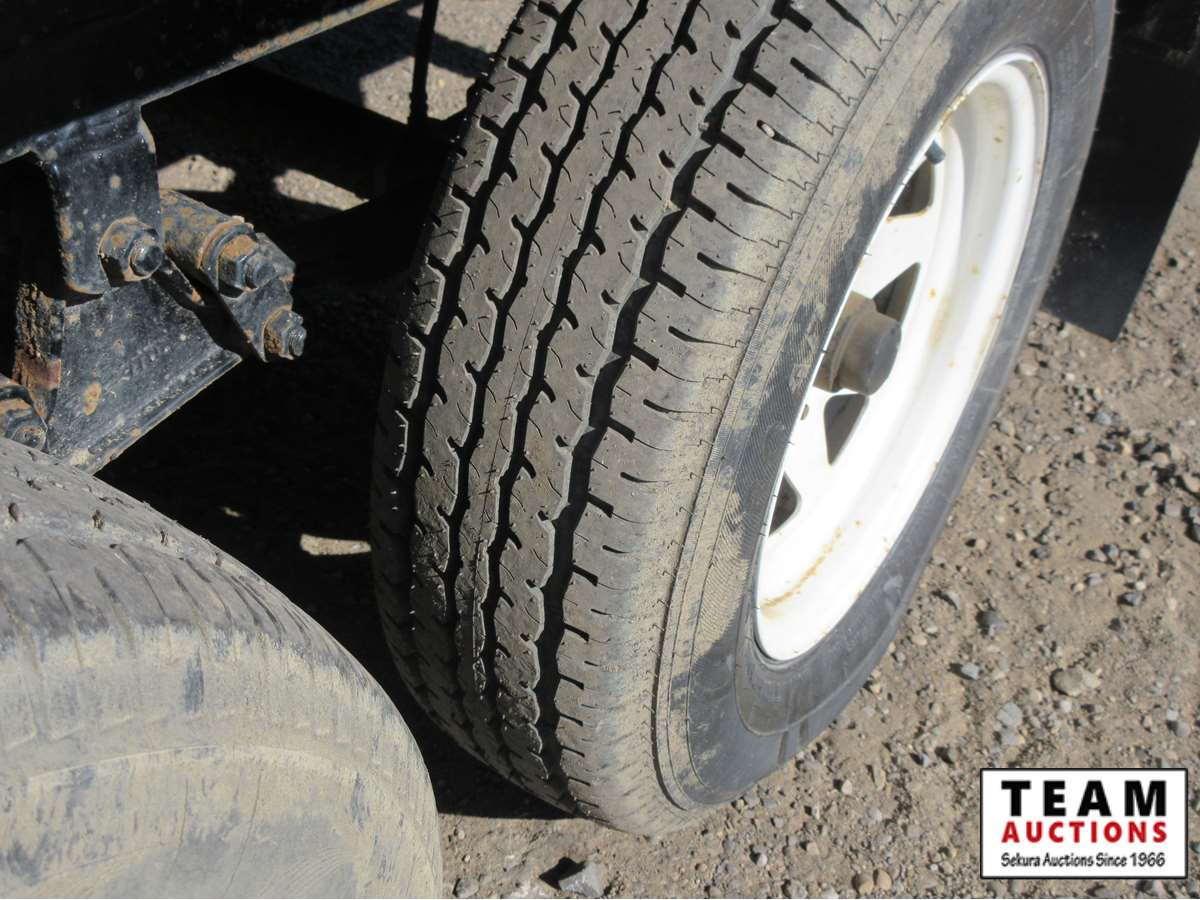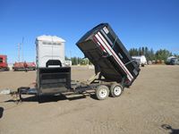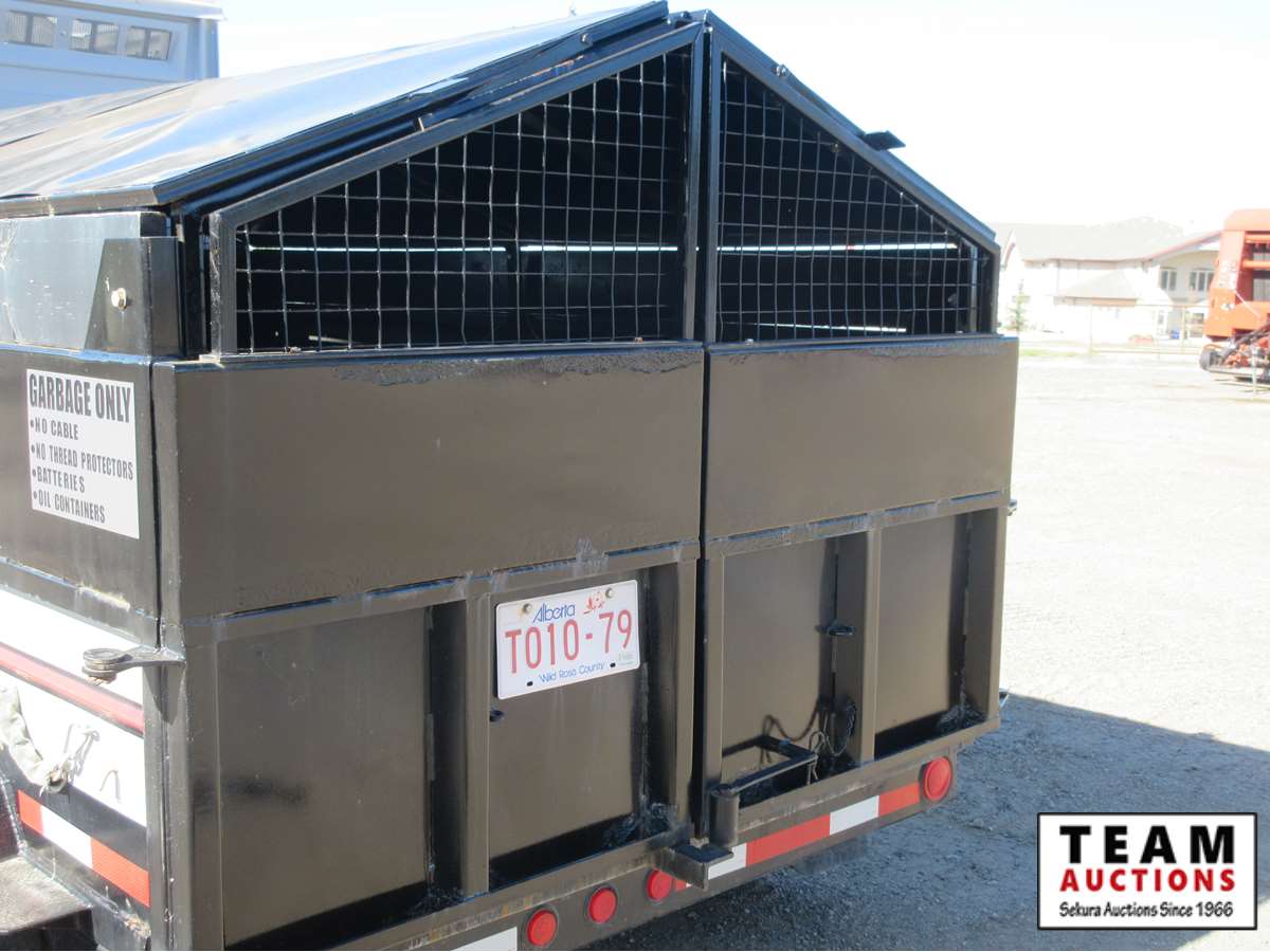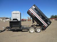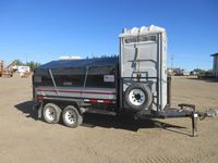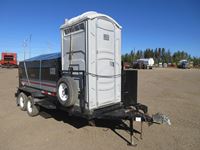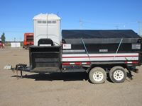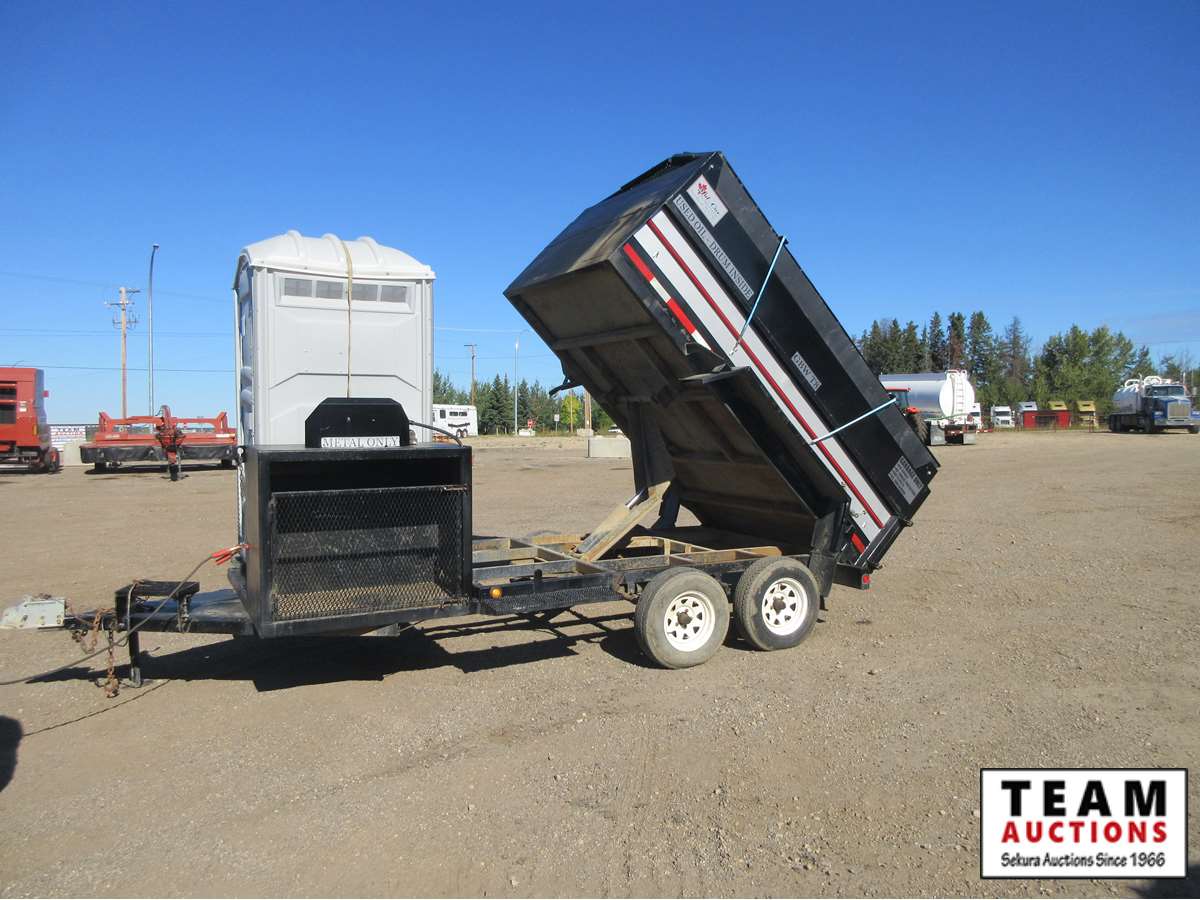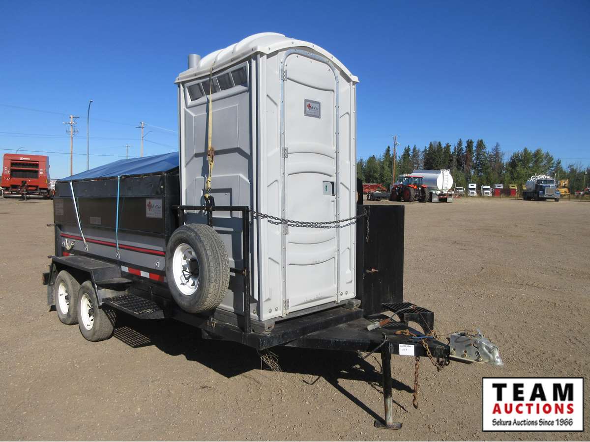 custom built tilt dumpster combo unit with used oil tank, metal bin, toilet, insulated toilet cover, 10' covered dump box, 12V self contained hydraulic system, 3500 lb axles, spring suspension, 215/75R14 rubber, spare, surge hydraulic brakes
