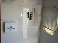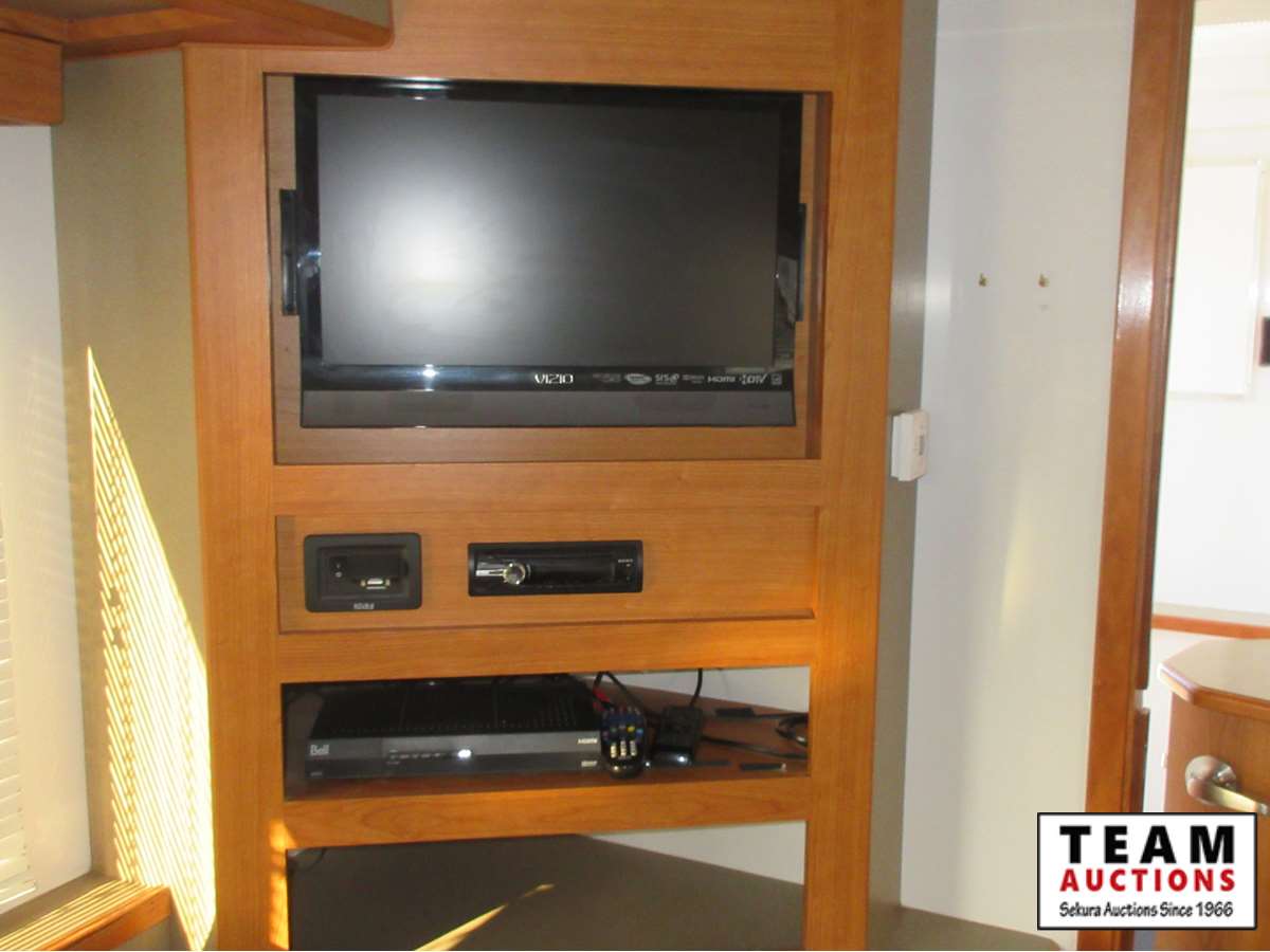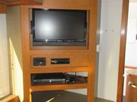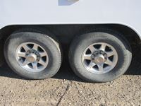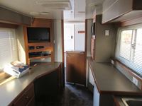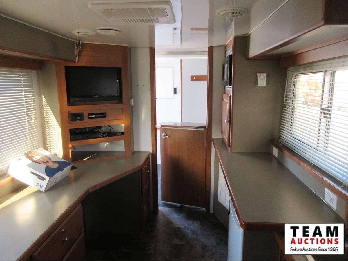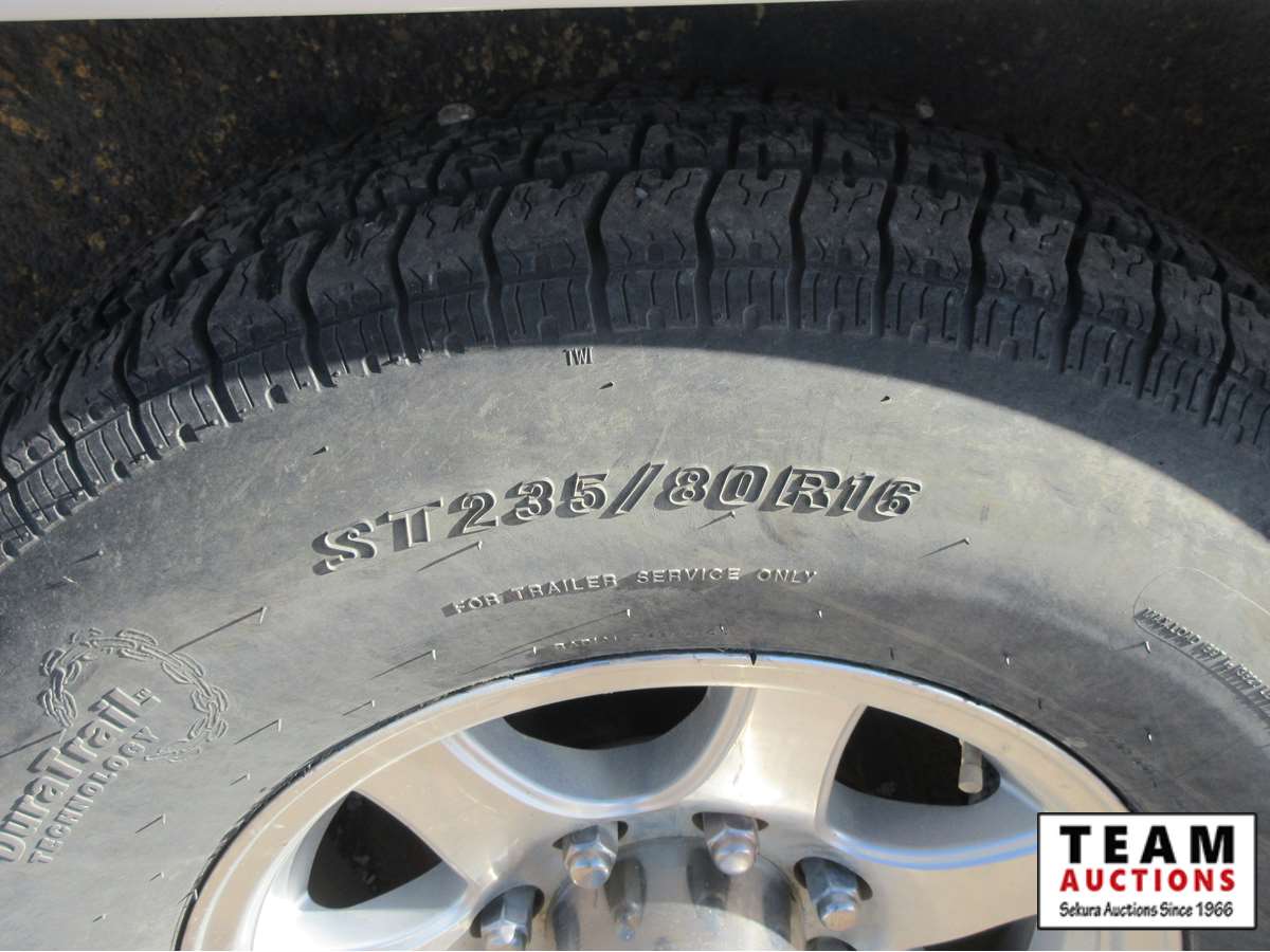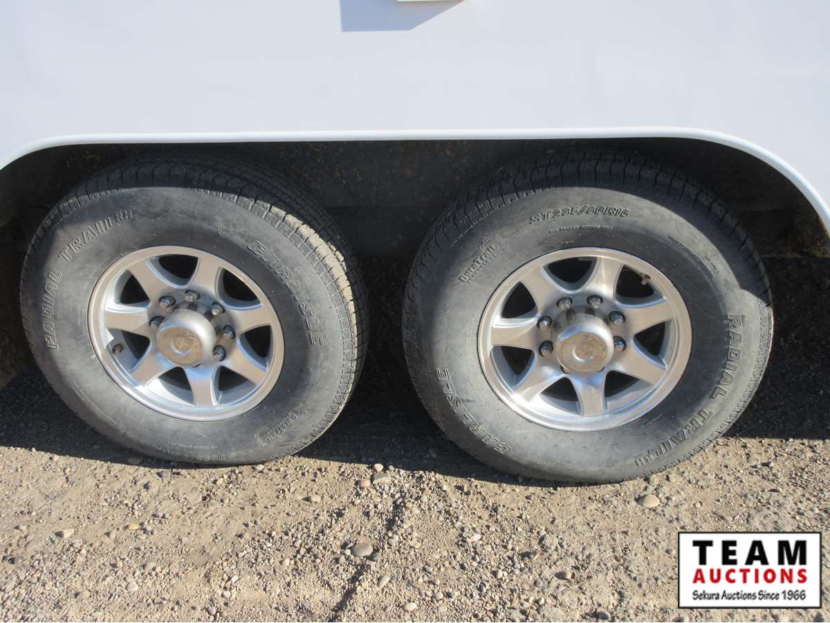desk, couch, microwave, TV, AC, small sink, fridge, toilet room with Incinolet toilet, 7000 lb torsion axles, aluminum rims, 235/80R16 rubber, spare, rear stabilizer jacks, rear power cord compartment, rear ladder