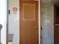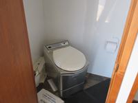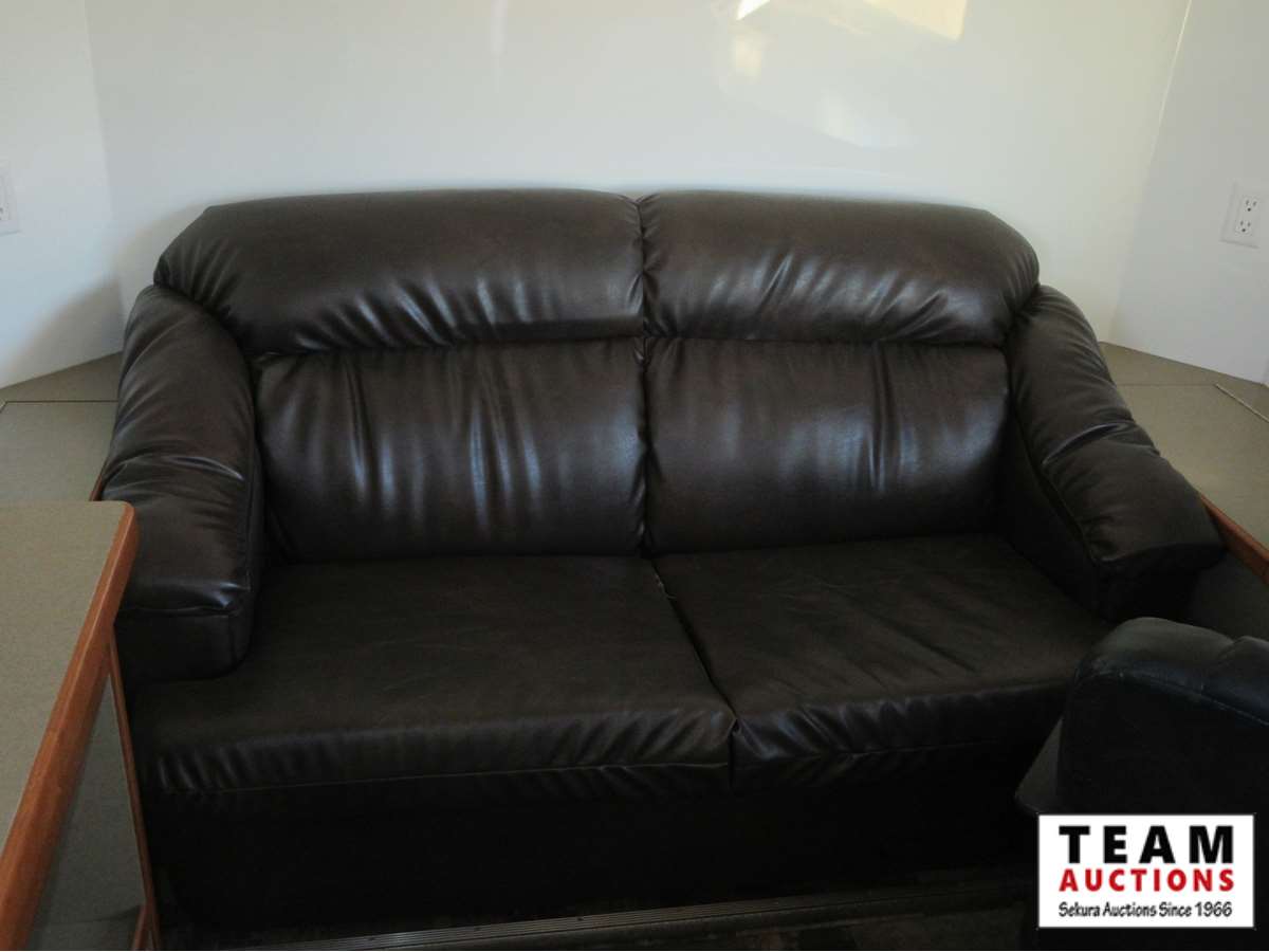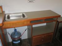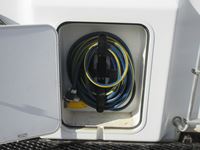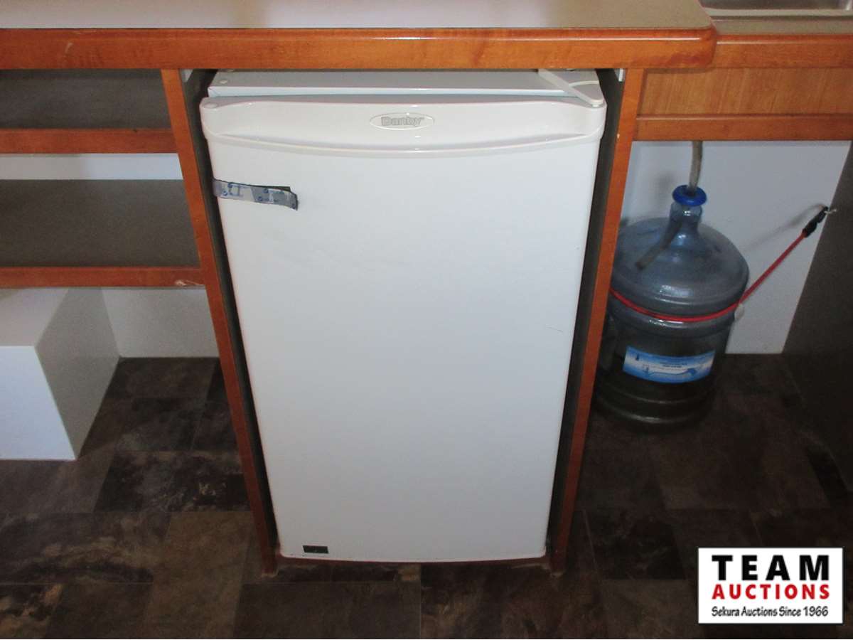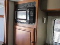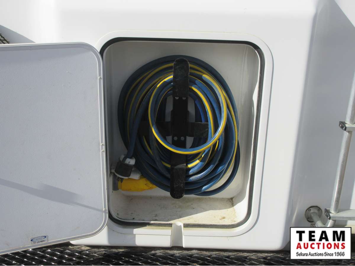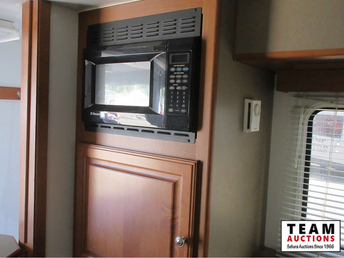 desk, couch, microwave, TV, AC, small sink, fridge, toilet room with Incinolet toilet, 7000 lb torsion axles, aluminum rims, 235/80R16 rubber, spare, rear stabilizer jacks, rear power cord compartment, rear ladder