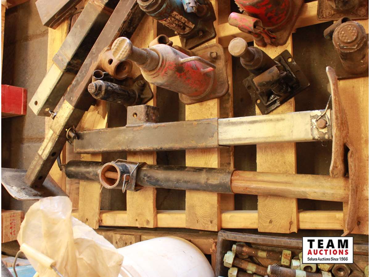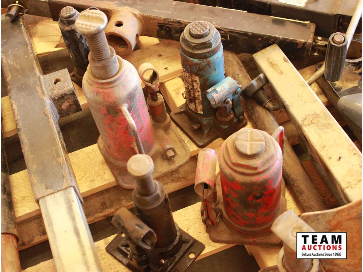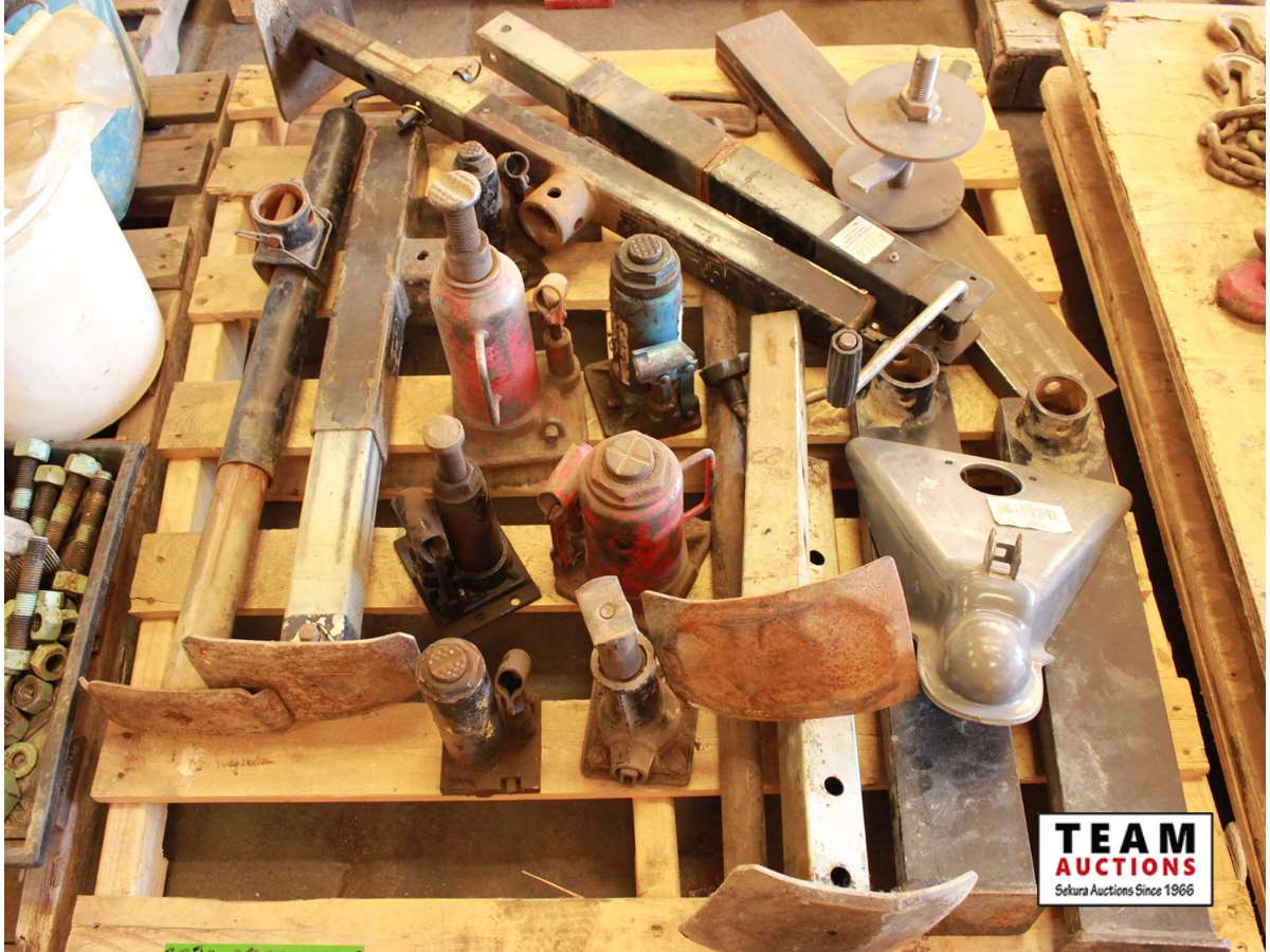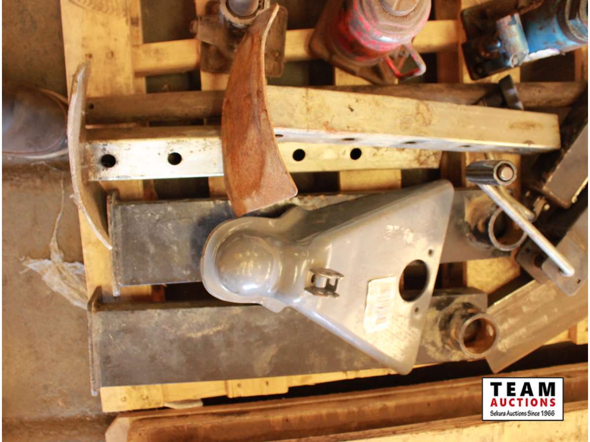 trailer jacks, ball hitch, spare tire holder, trailer stands, (7) bottle jacks