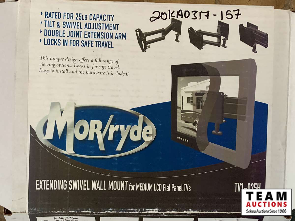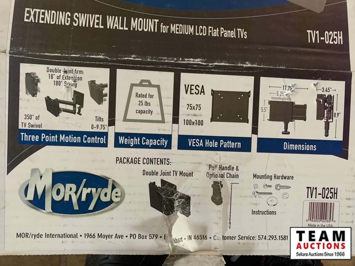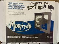 rated for 25lb capacity, tilt and swivel adjustment, double joint extension arm, locks in for safe travel