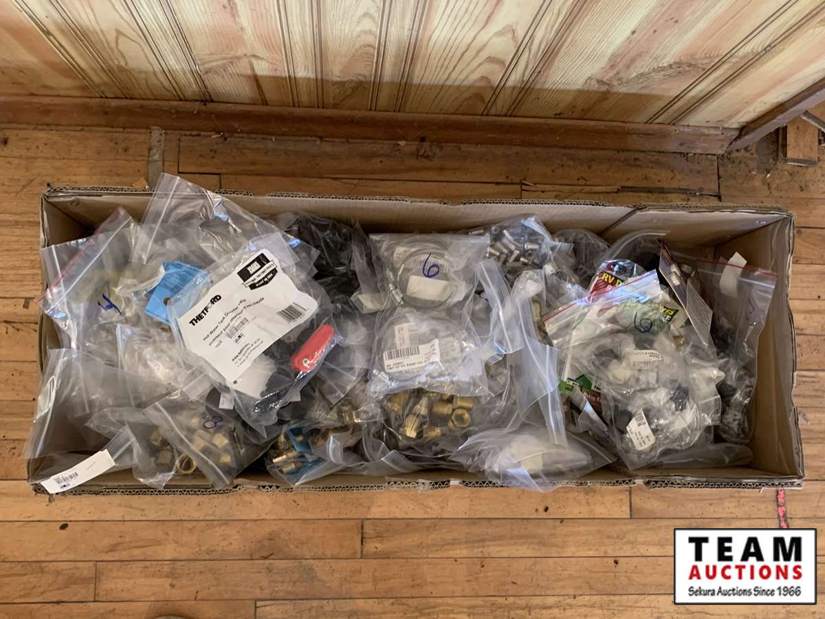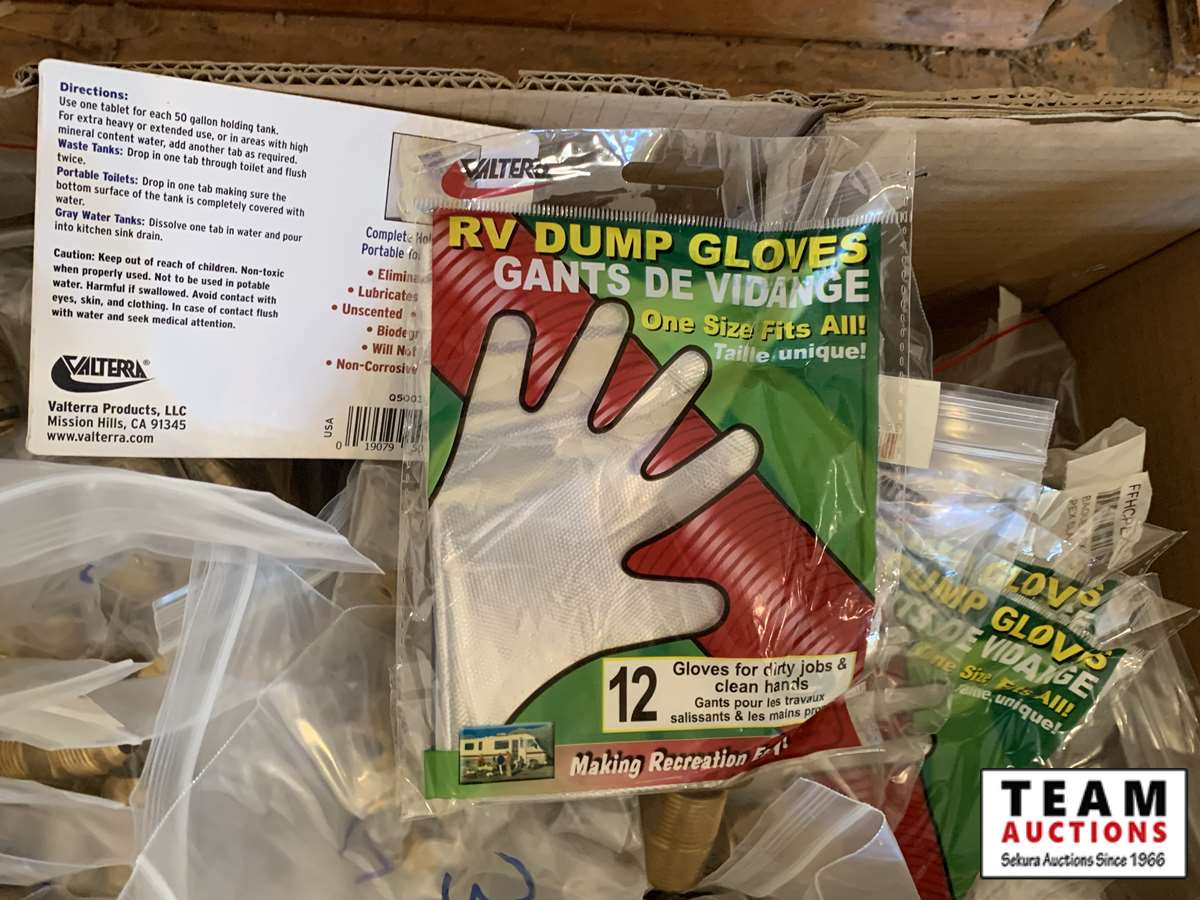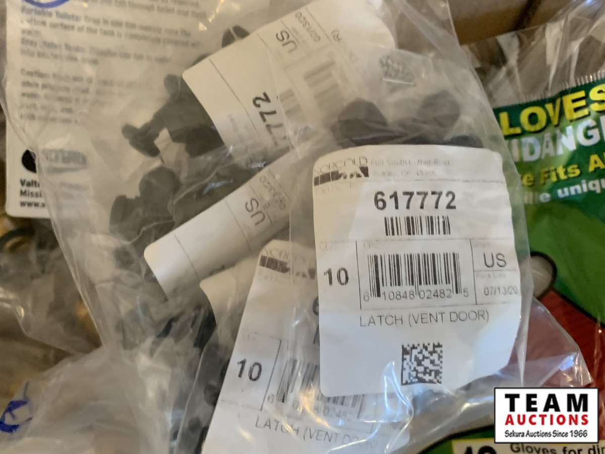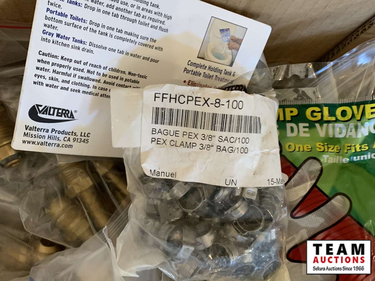 3/8 forged nuts, RV dump gloves, pex clamp 3/8 in. , latch (vent door), cmp 1/2 in. band, hot water tank diverter valve