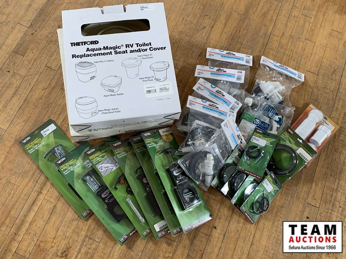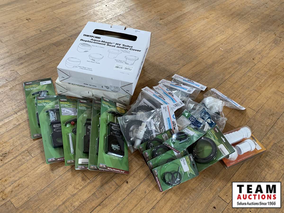 (2) Aqua Magic rv toilets, (6) 2 in. Bladex waste valve, (5) Thetford water valve replacement package, (5) 1.5 in. Blandex waste value seals