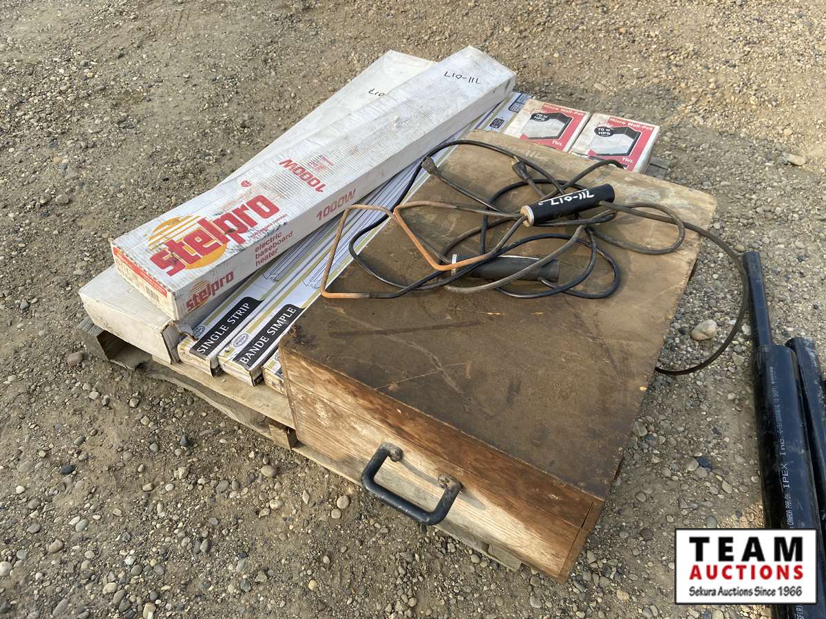 88 Fluorescent Lights(Unused), (2) Micro Wall Pak Lights, (2) Electric Bale String Cutters, Wooden Box
