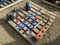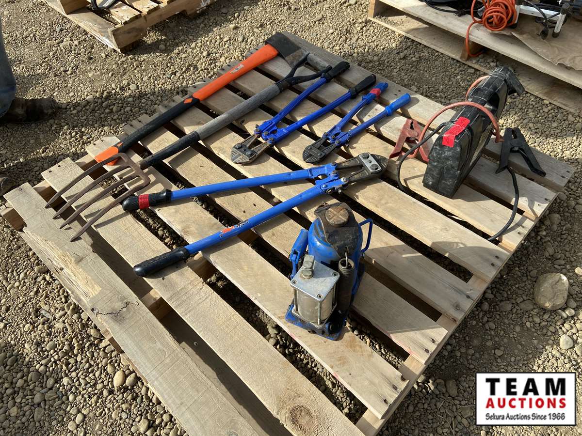 axe, (3) wire cutters, (1) 20 ton jack, battery buster, potato fork