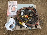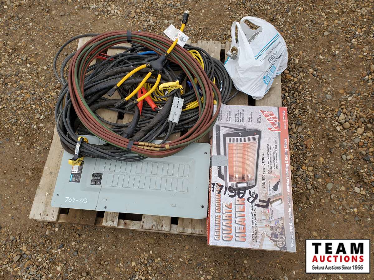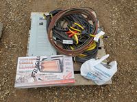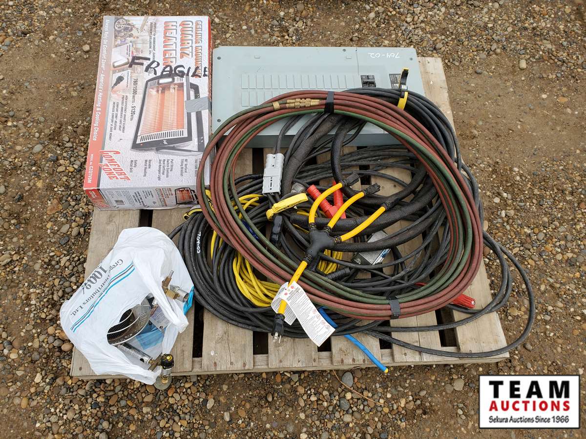eletcrical cables, (3) small shop heaters, 20 ft Industrial booster cables & breaker box