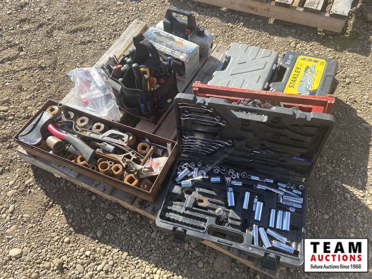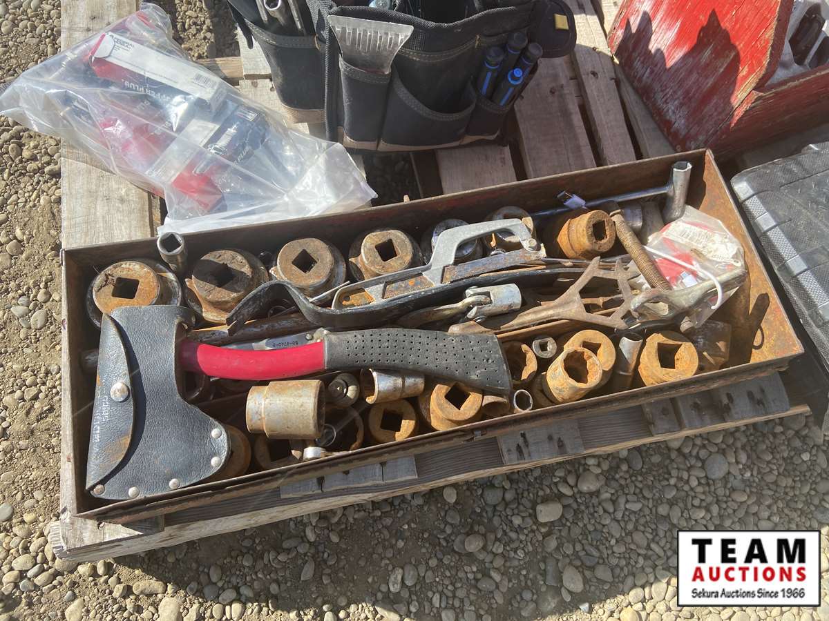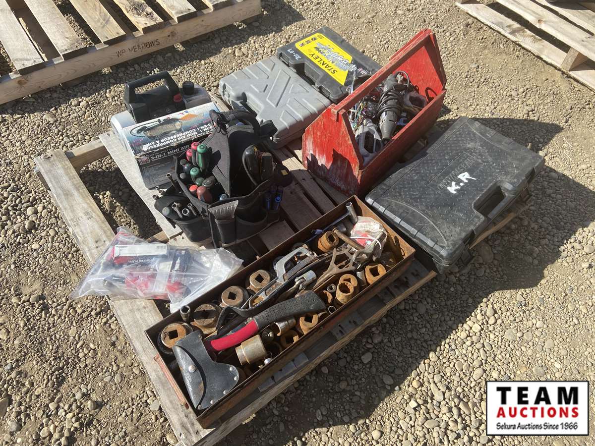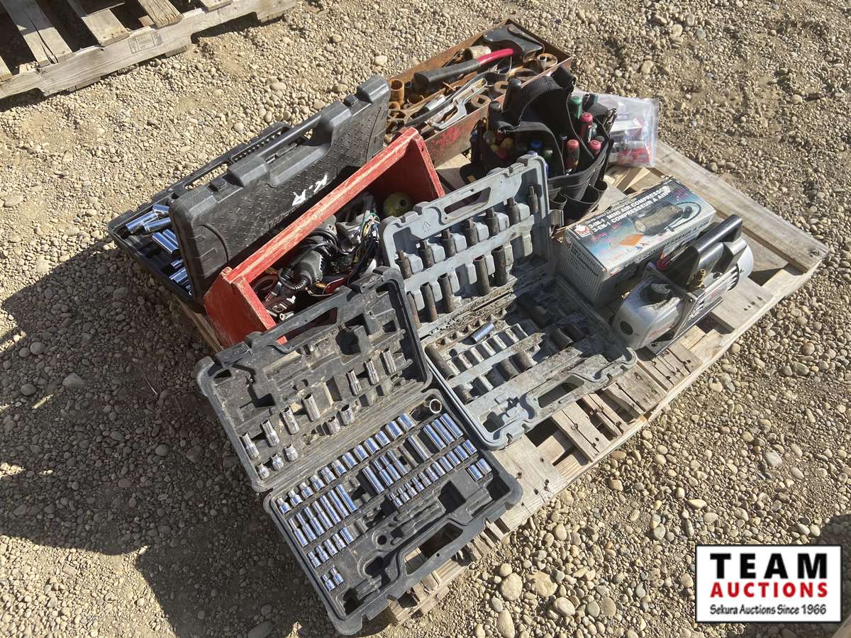 (1)stage vacuum pump, pouch with screwdrivers, 3 in 1 mini air compressor, sparks plugs, Socket sets, HD Sockets set, box with misc. Tools