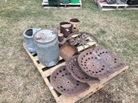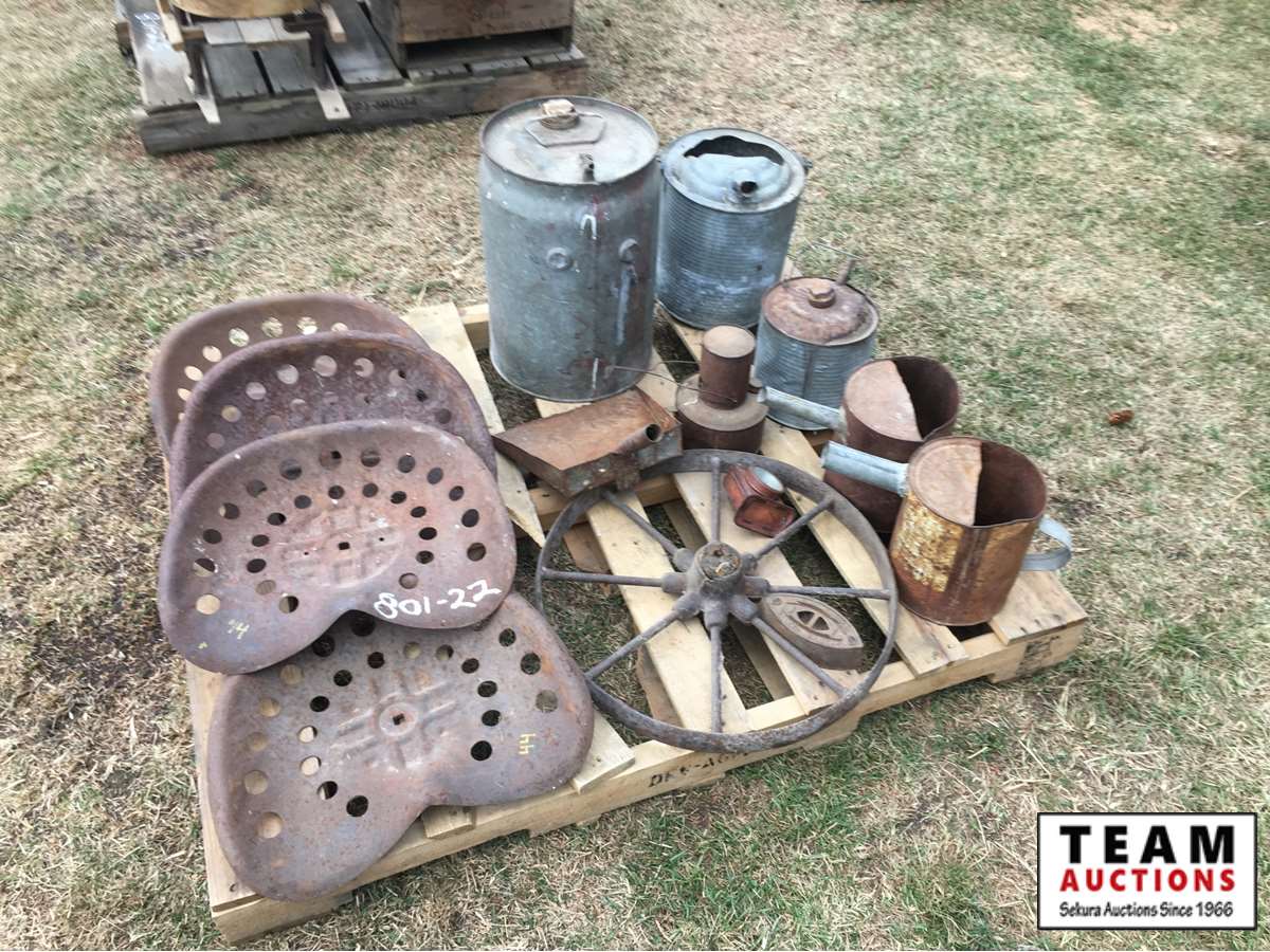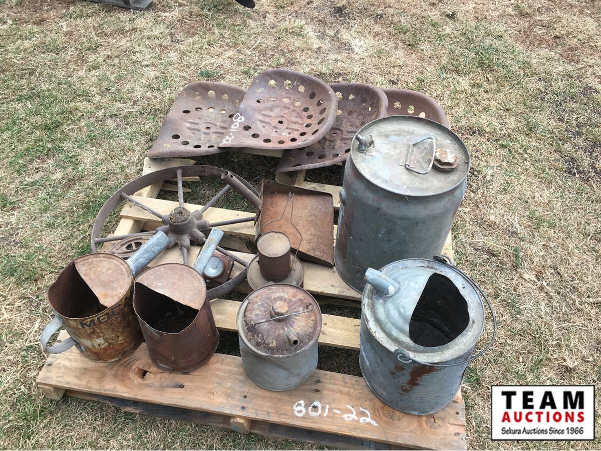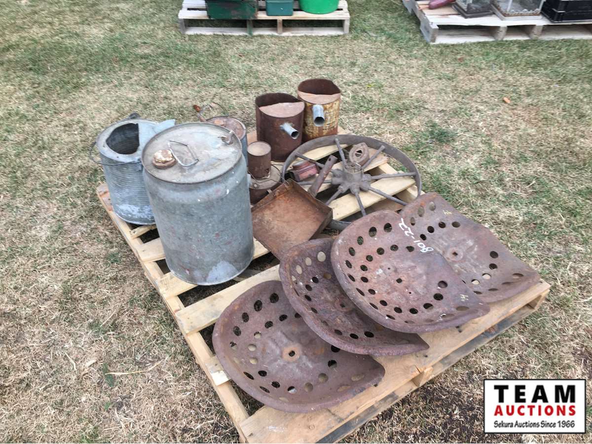 metal tractor seats, water, oil & fuel cans, sad iron, lantern, dust pan, steel wheel, etc.
