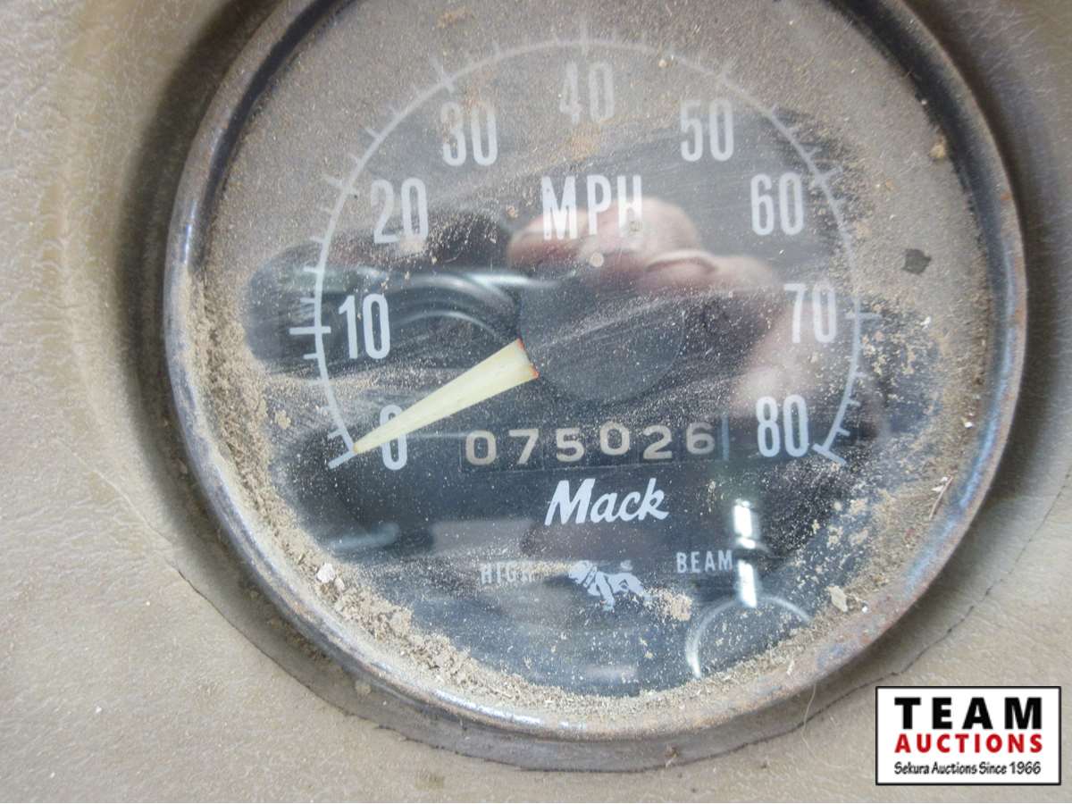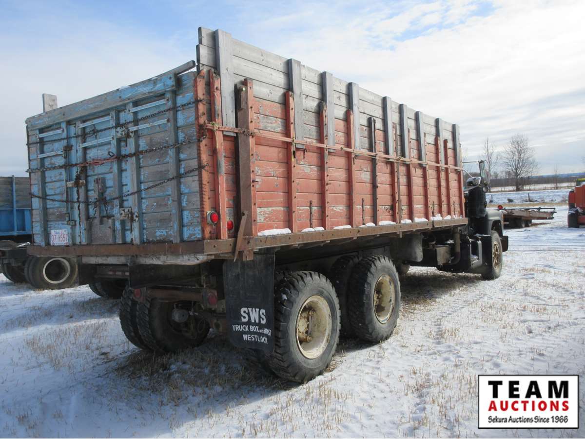 6 cylinder Mack engine, 10 speed transmission, camel back suspension, air brakes, 20' wood box, hoist