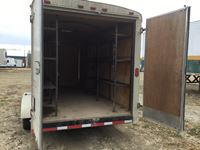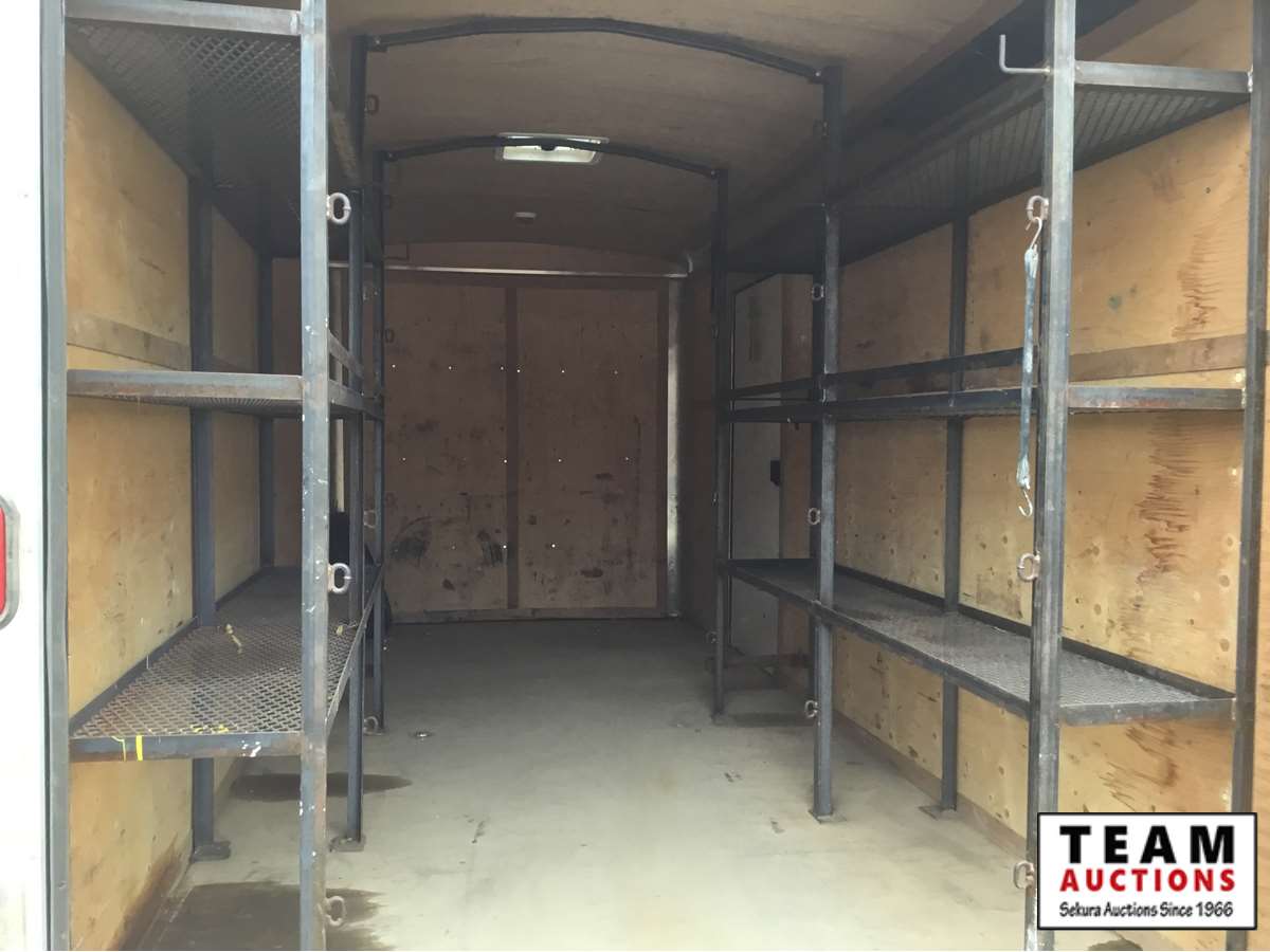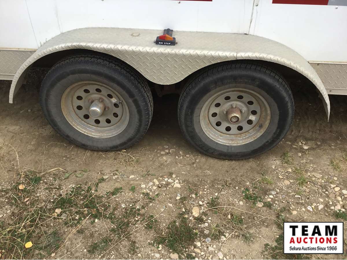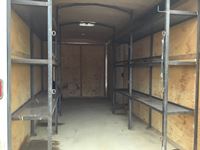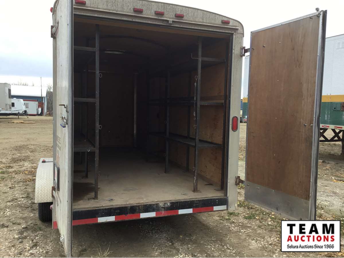side door, swing out rear doors, 3500 lb axles, plywood lined, removeable metal shelves on both sides, Alberta registered
