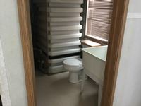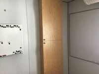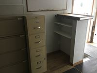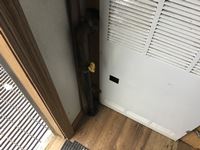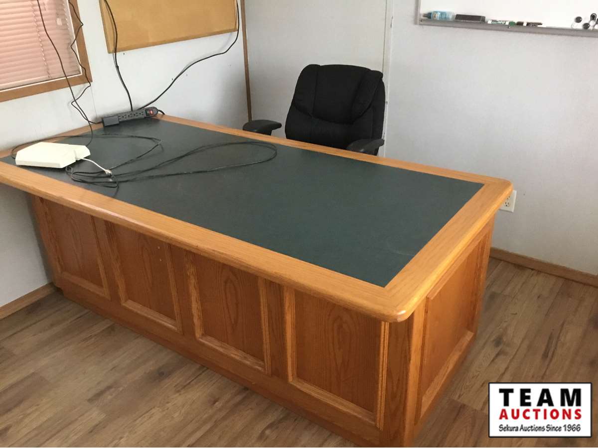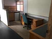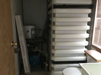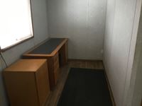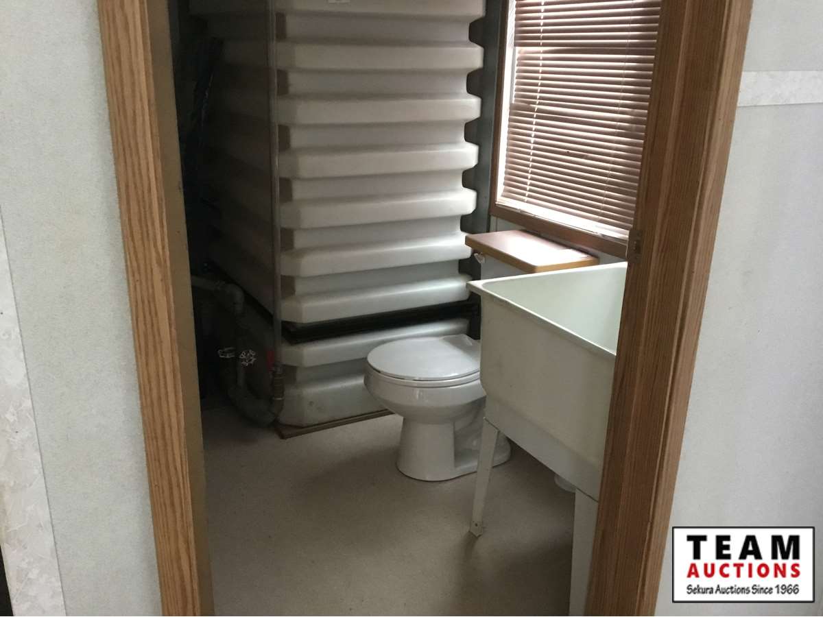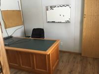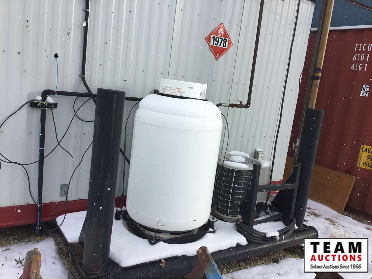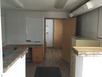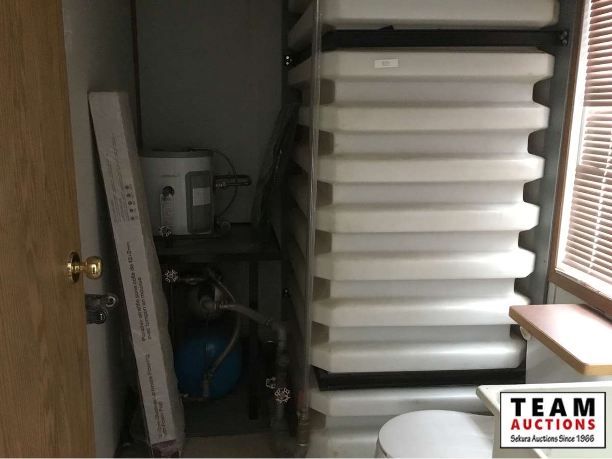 open entry way, end office, bathroom, water storage, water heater, pressure system, very nice office furniture, fridge, propane furnace with tank, AC unit, front steel stair and deck area